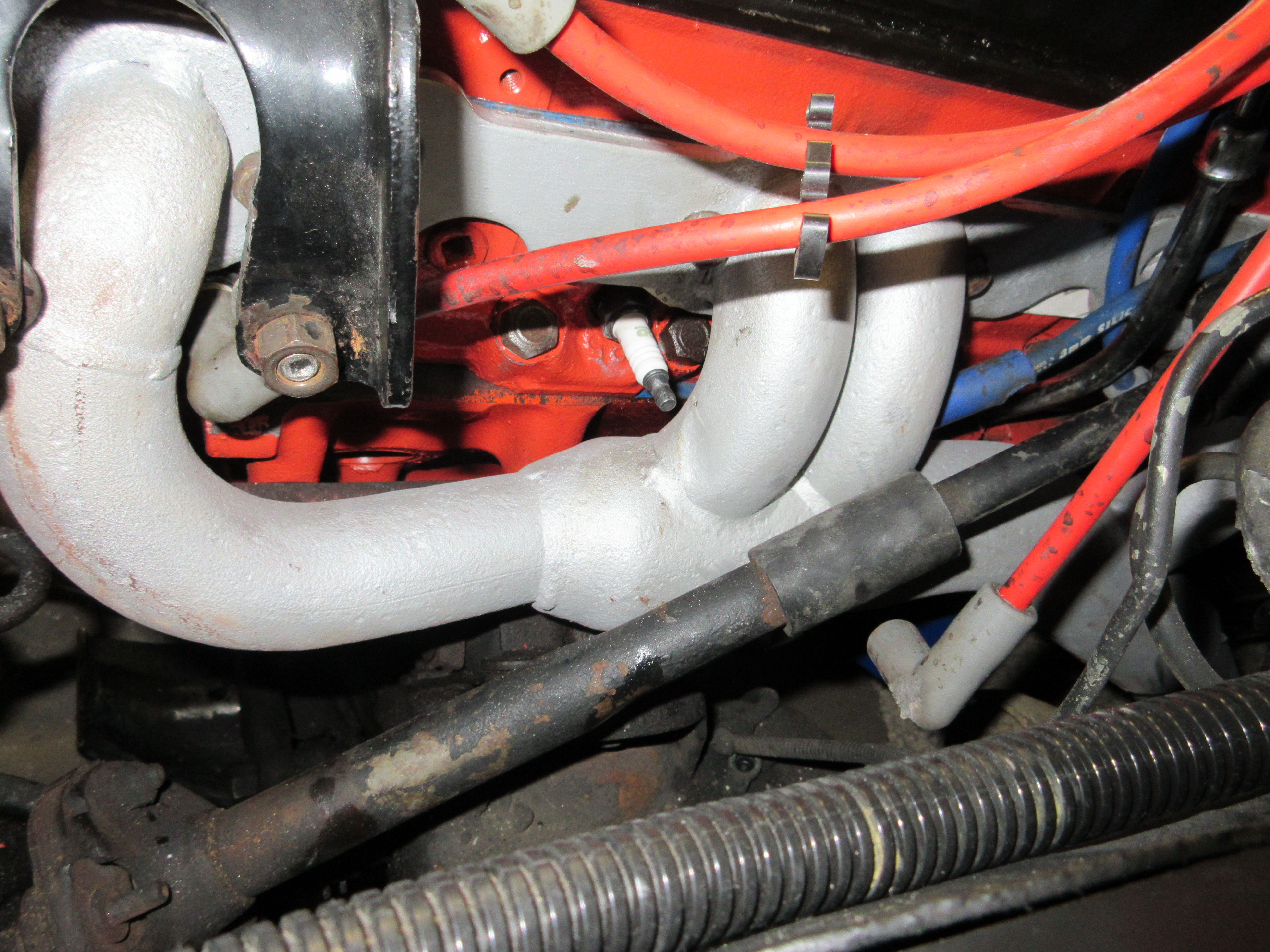 Well, I've got a problem and I'm not sure how I'm going to solve it. The Vortec heads have the spark plug holes positioned slightly different compared to other heads. The plug wire is really close on #3, close enough that the boot is melting and then the spark is arcing to the manifold. #5 looks almost as bad, but not quite, but maybe because it's more difficult to see. #1 looks ok, and I can't see #7 well enough yet, but I suspect it's ok. The passenger side is a-ok, as they don't run the manifold pipes so close to the engine. The driver's side needs steering shaft clearance.