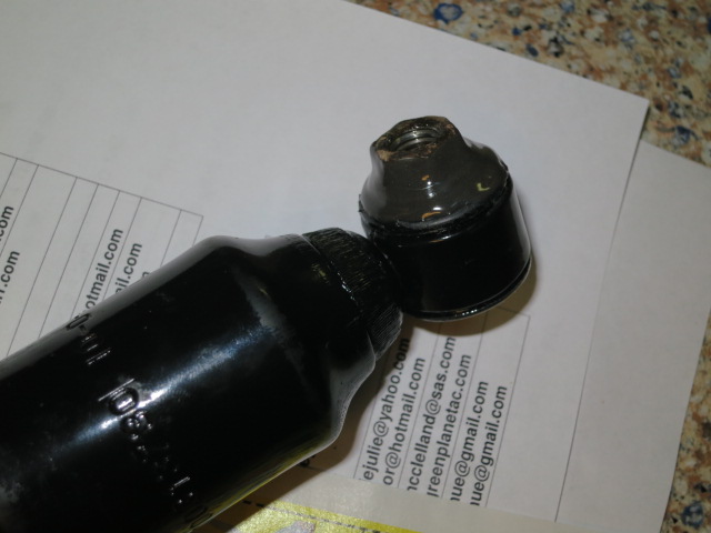 Having seen this, I'm getting more enthusiastic about refurbishing ol' Gladys. When I started to remove the stabilizer, I dreaded the thought of trying to get a wrench on the nut on the inside bottom. Clearly, it was going to be difficult if not impossible. Just because I didn't have any good options, I just tried to unscrew it. And it worked! Something was holding the nut in place. Lo and behold, someone had glued the nut onto the shock. What a great idea. So I did the same thing with the new shock. Good ol' JB Weld is now holding the nut. It's glued to the rubber with only minimal holding power on the metal, but it should do well to keep the nut in place until I can tighten it in place.