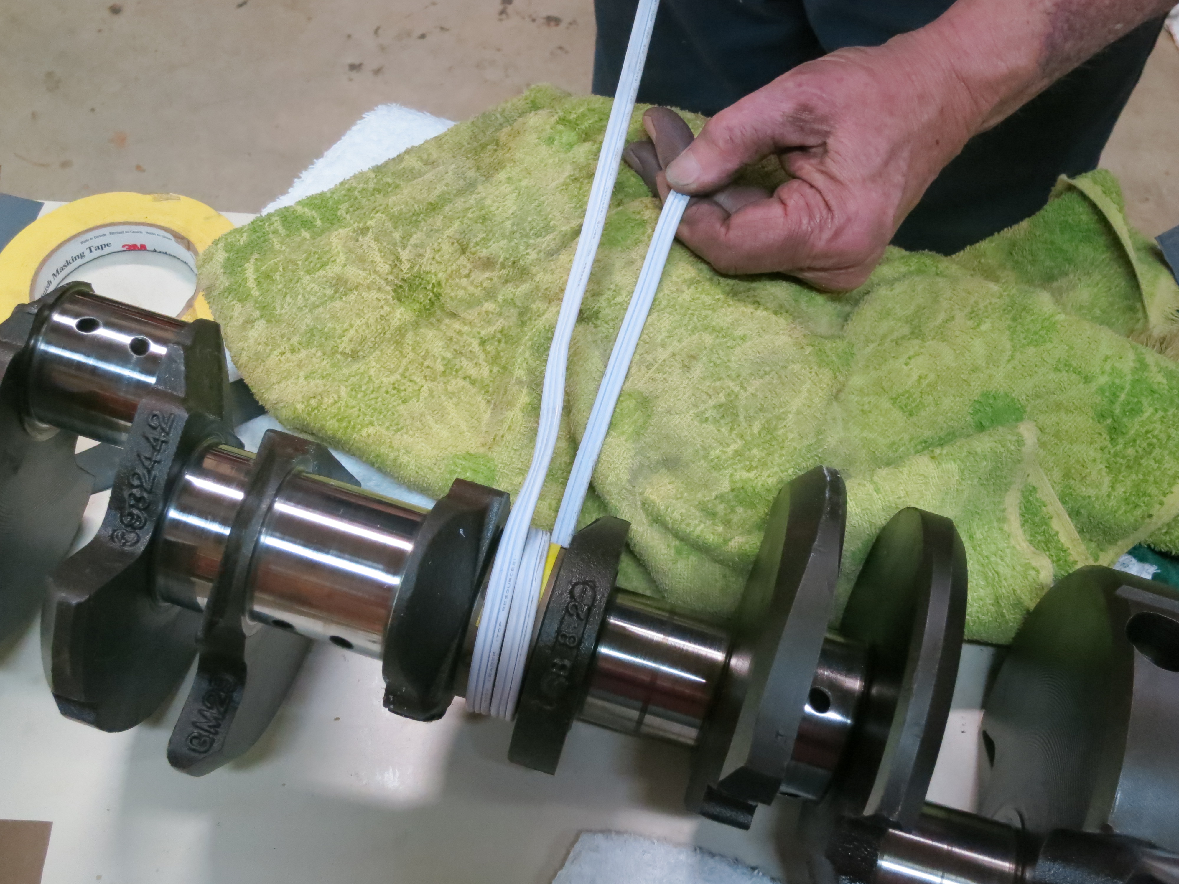 Installed the main and rod bearings and plastigaged all. All are within spec. Installed the crank, with two-piece rear seal and torqued the main bearings. Next we'll put the rings on the pistons, install the pistons/rods and torque the rod bearings.