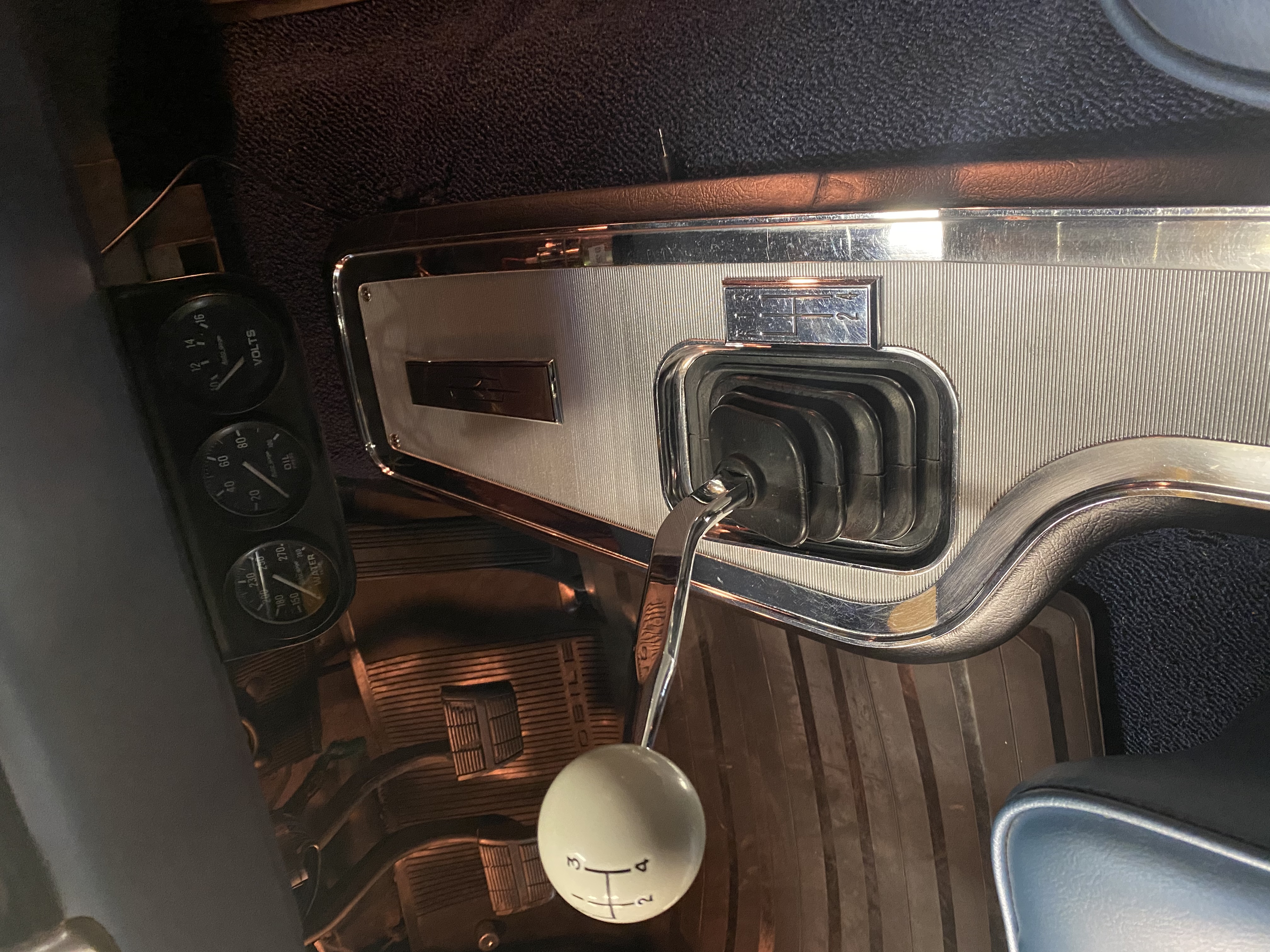 I think I mentioned before that the factory tach on the console looked cool, but functionally it was horrible. You just can’t see it while trying to drive. I might have been convinced to keep it if it worked with new electronic distributor set ups. It doesn’t unless you purchase a $100 tach adapter. Too much money for little to no functionality. As stated earlier, I put in the Olds logo on the console and purchased an Autometer #2893, 2 5/8” chrome cup tach. I spent hours looking for a tach that worked in my mind with the dash set up. I’m pretty pleased with how this tach looks with the dash and it isn’t so big that you can’t see the speedo. The hook up was very simple and I was able to use some of the wiring from the old tach. It was a very easy install. I painted the worm gear clamp black to match the steering column. It’s nice to have a functional tach where I can see it. On to the next project!