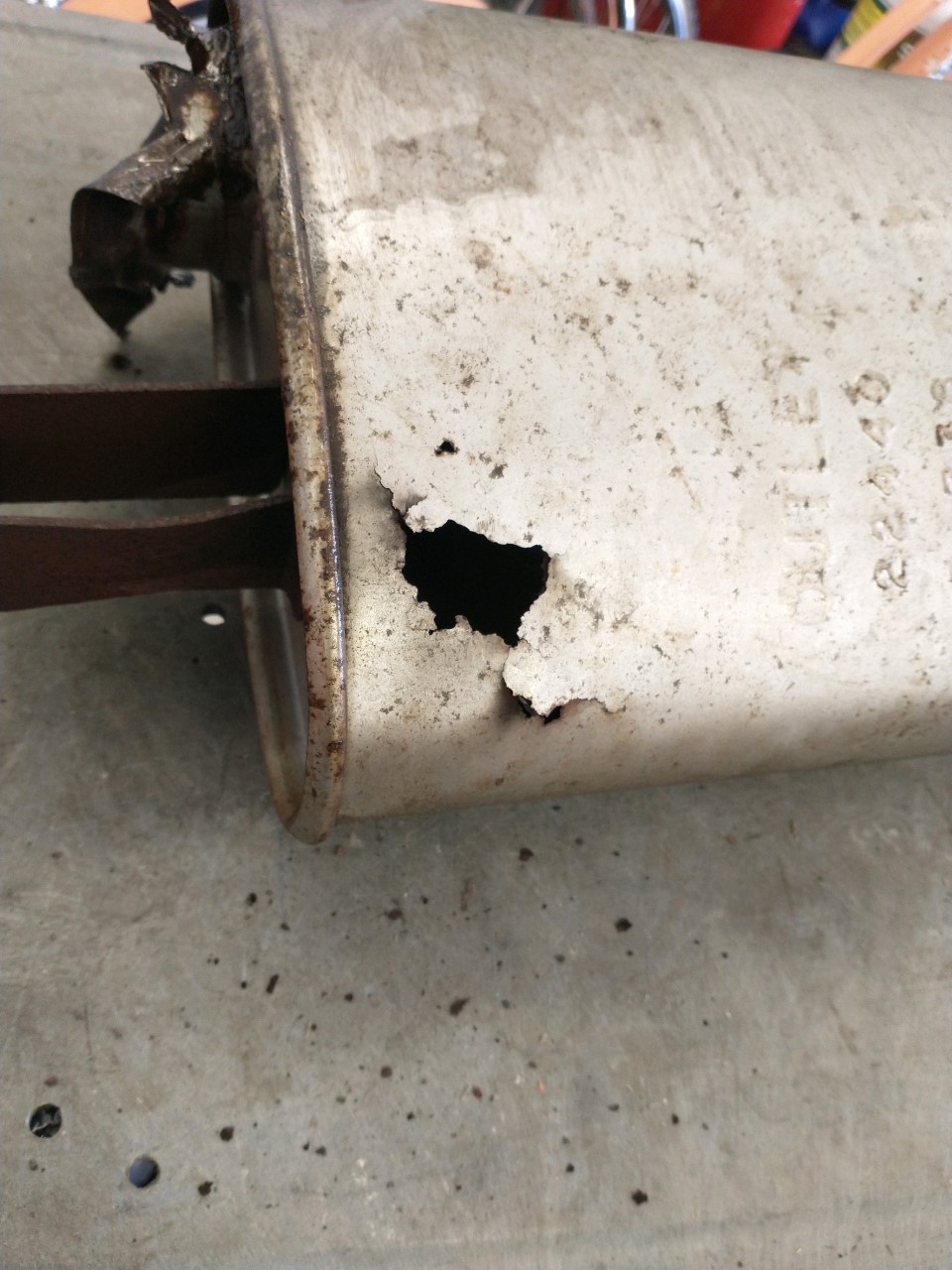 I was able to cut the old mufflers off without doing any real damage to the front pipes or tailpipes, so this made it possible to weld everything together. Weld is a relative term as I think the material GM left in the mufflers was some form of stainless steel, and it made my welds pretty boogery, but they should seal, and they're definitely not falling apart. And I was even able to weld the original hangers to these mufflers for some extra support.