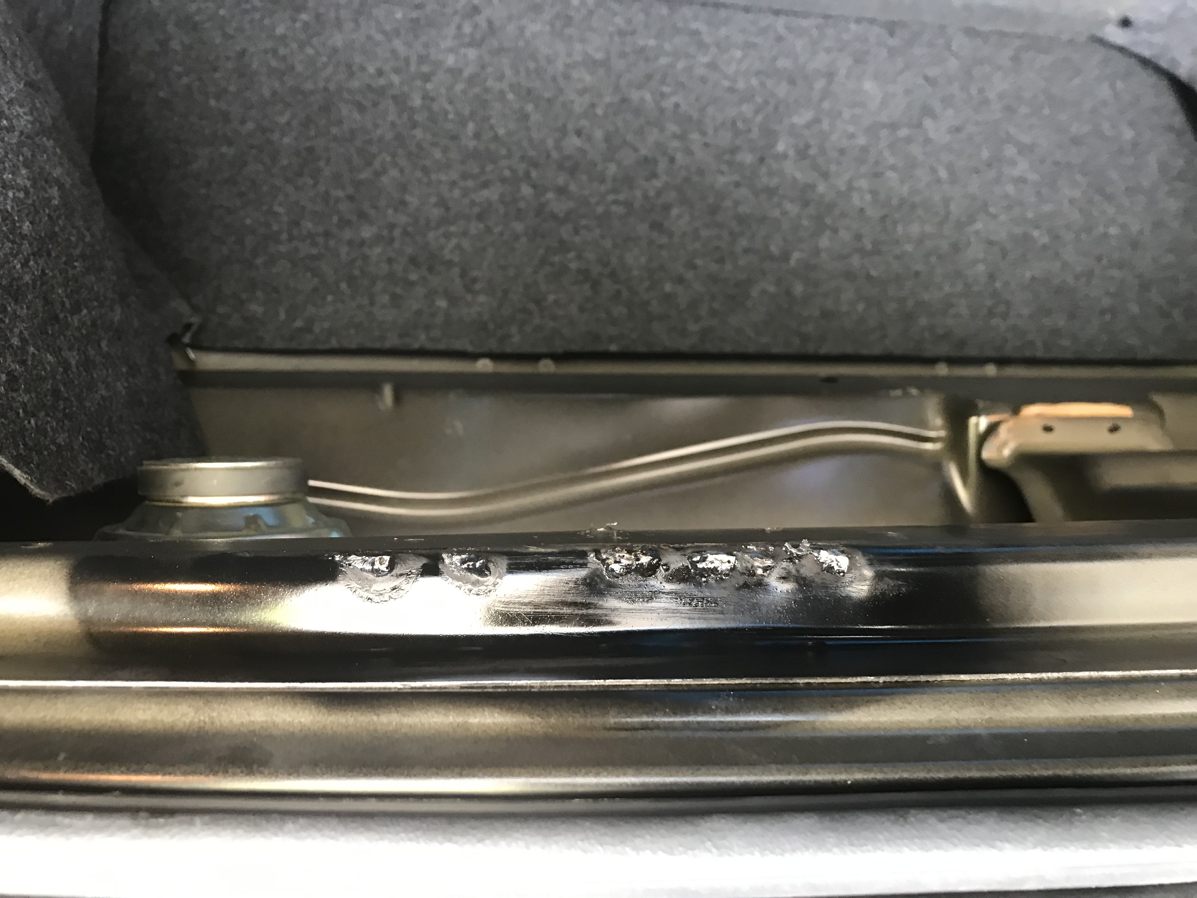 I also discovered some welds in the trunk from removed police equipment so I ground those off and painted the area black. Before: