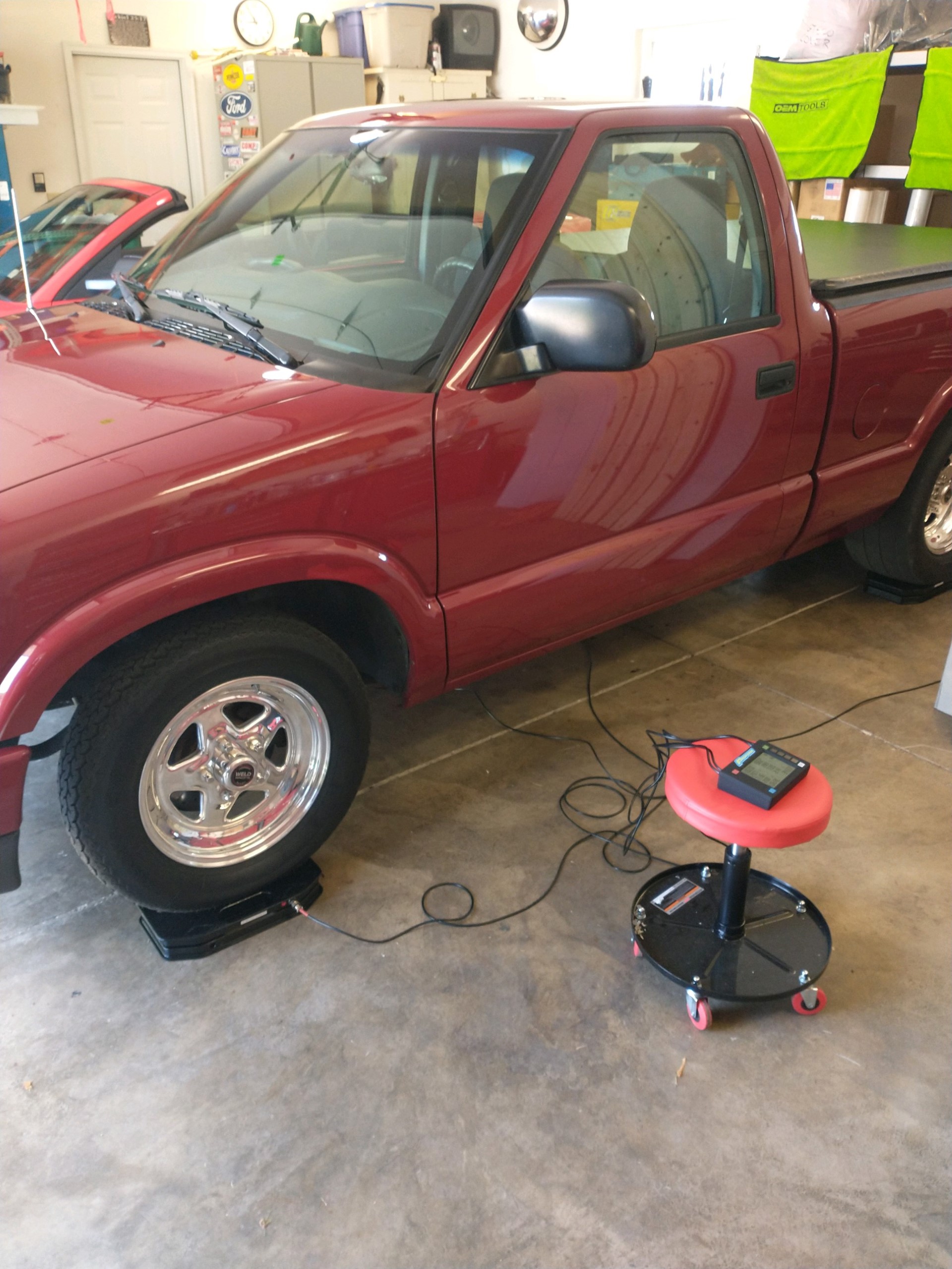The S10 was up first and with the lightweight wheels and 5/8 tank of fuel, it was 3431 lbs. which is about where I expected. I'm 170 lbs race weight, which puts it right at 3600 lbs with me in it. If I swap back the stock wheels, its another 40+ pounds too. So really, if I fill the tank with the stock wheels and me in it, it would tip the scales at 3700 lbs. It's no surprise that the truck is nose heavy. You can see the pics for the breakdown.