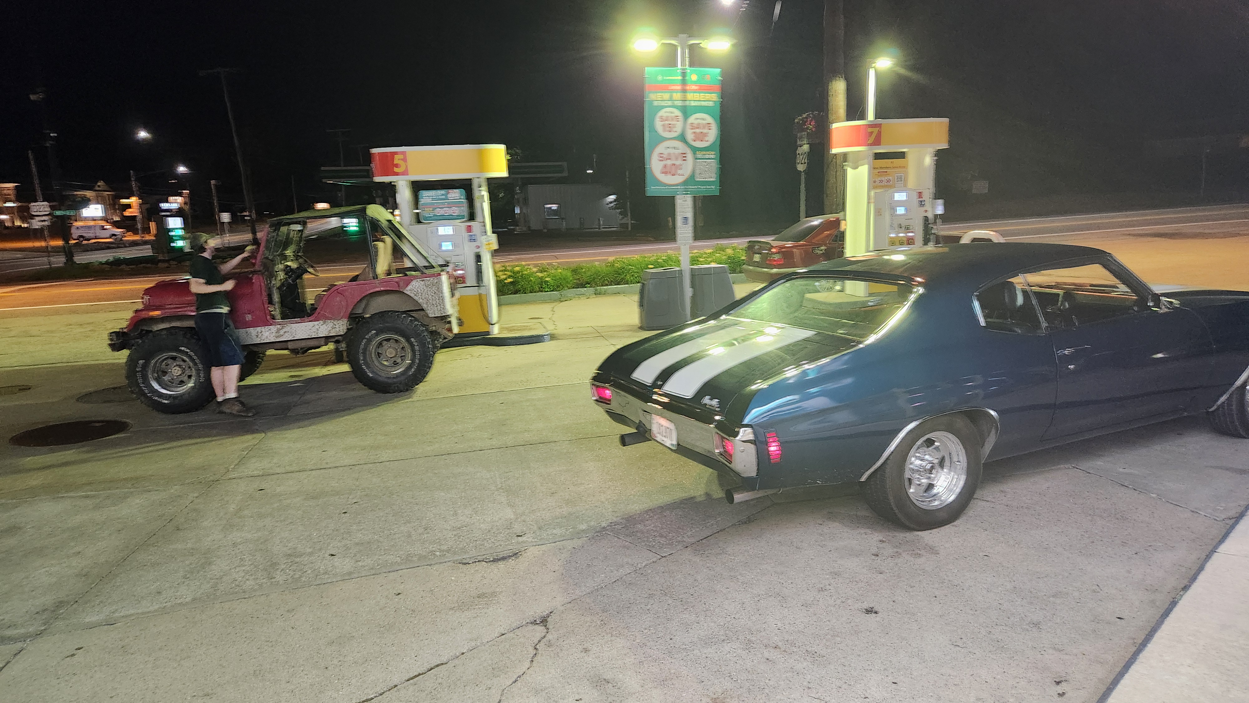 I ran to the corner and this was the scene at the gas station.. I thought it was a cool shot with 3 very different cars. Thats an E36 BMW in the background.