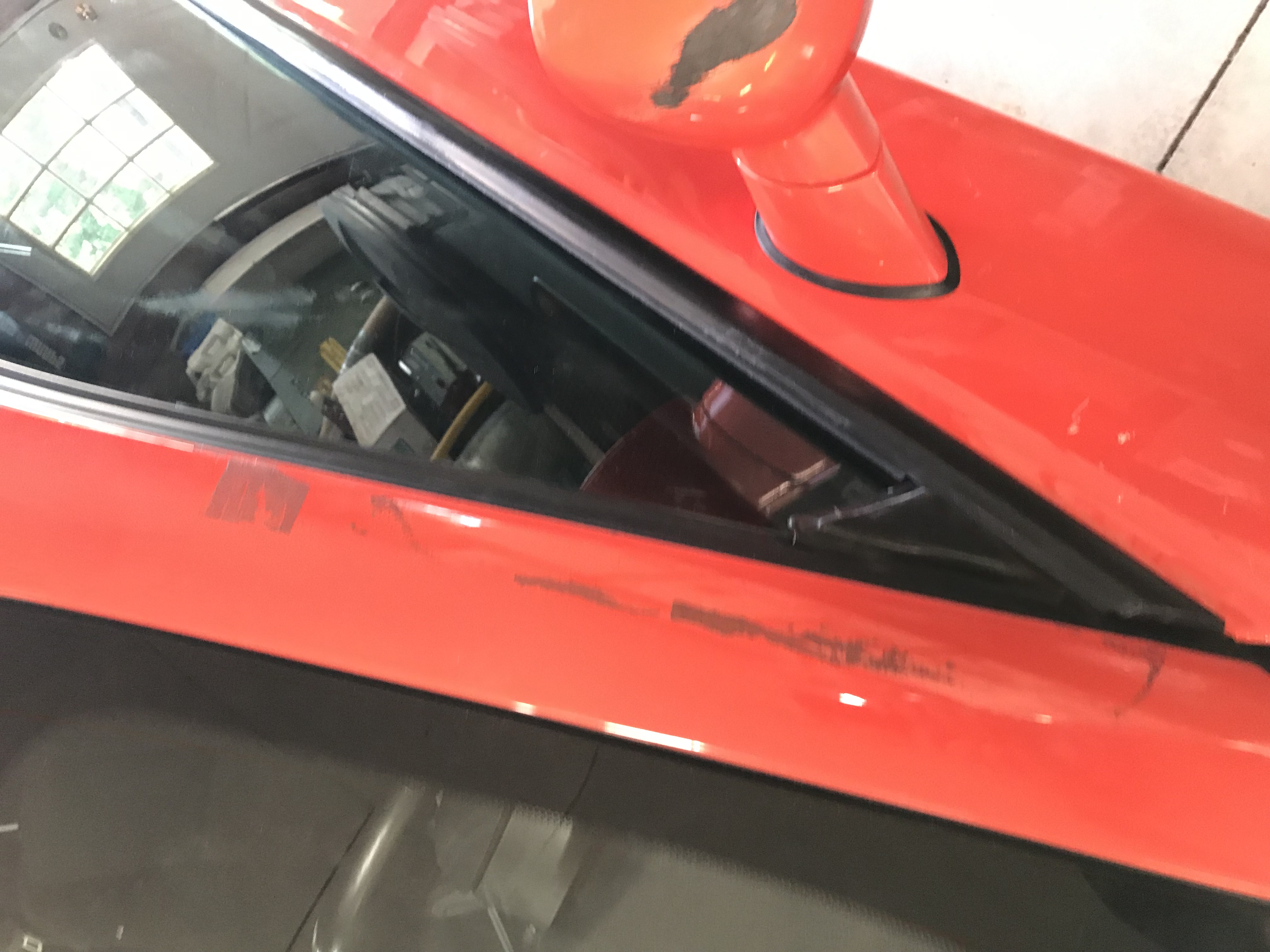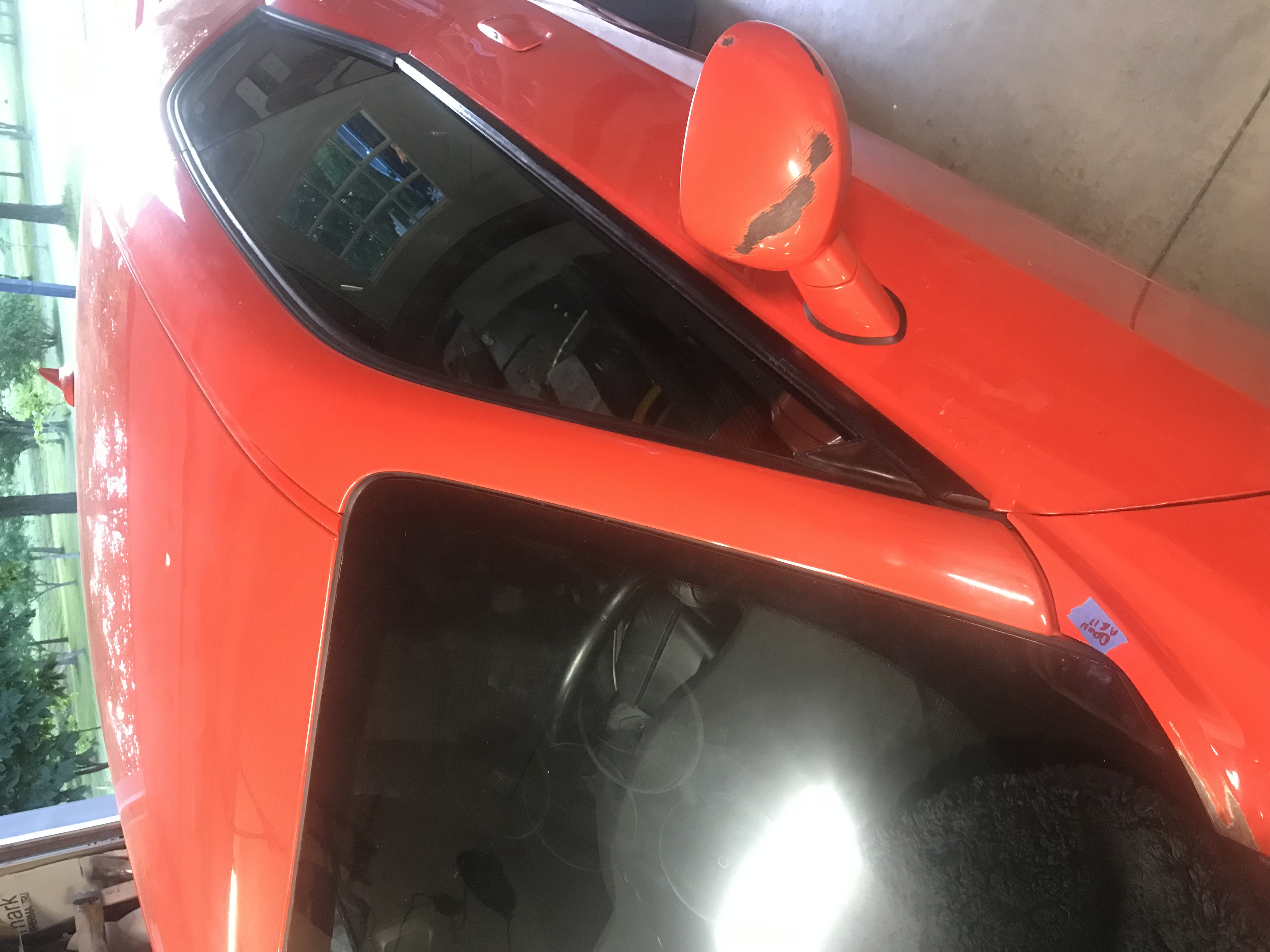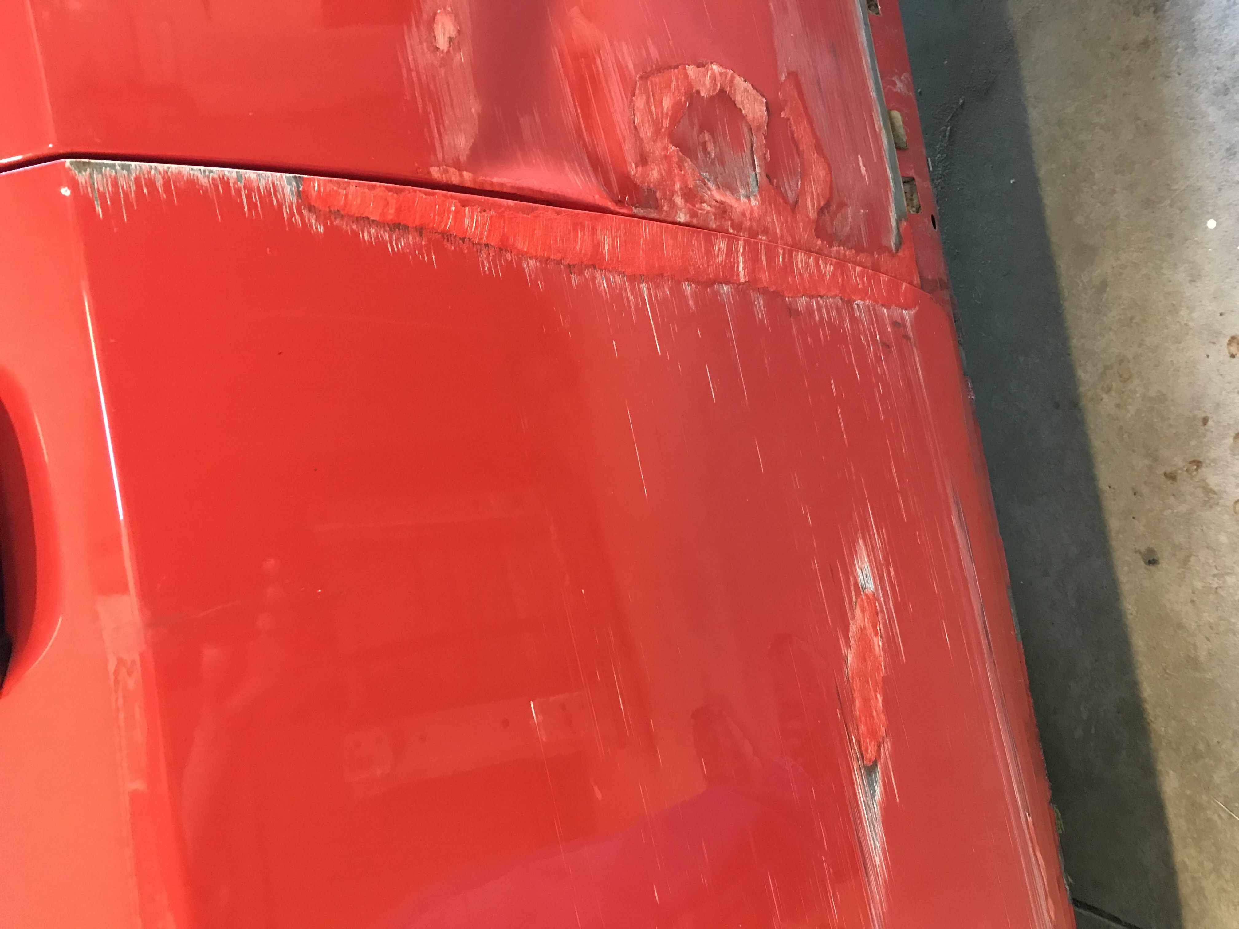 • Put more time into touching up the damaged areas. Went through another round of beige/vanilla primer (2k primer but I’m mixing tiny batches to brush touch – maybe a couple ounces at a time. Covered some bare metal where the paint flaked off during metal bending and some refining of the finish around some of my earlier work. Then I went back with another round of color. Put orange on the former bare metal spots and refined my touch up in several areas. After this it was time to put some clear on it. Mixed up a small batch and brushed it on all the bare metal – mostly the LF fender.