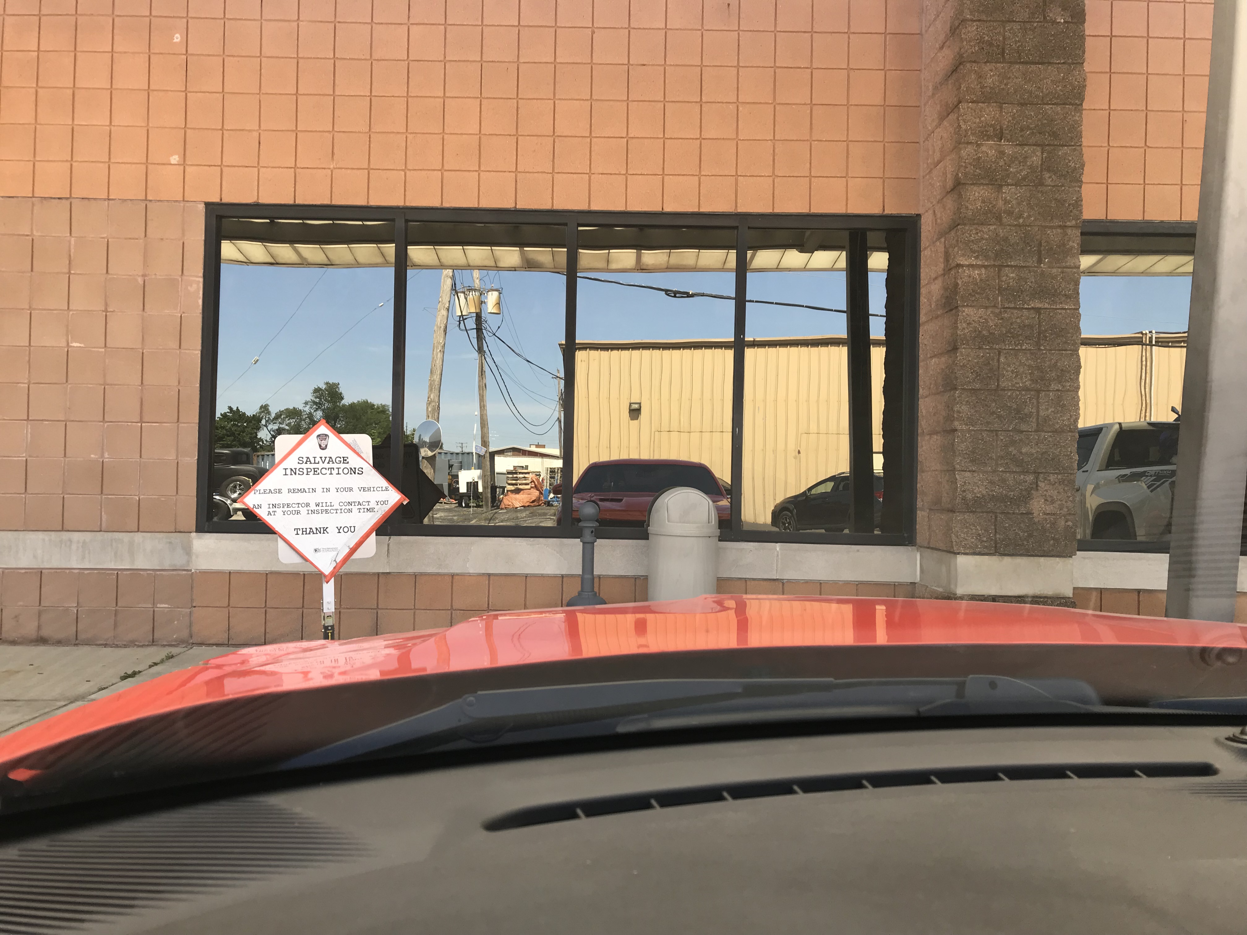 Inspection day was 6/27. That morning I discovered the cig lighter ports were not working – it was just a bad fuse. It was a bright sunny day and temps were like upper 60’s, very mild for late June. The inspection station is about 45 minutes from my house, and I left a bit early to give extra time in case of traffic, or getting pulled over. In Ohio you can drive the car to inspection with no license plate. Since I’m driving with no front bumper cover and no plate I figured I might get some extra attention.