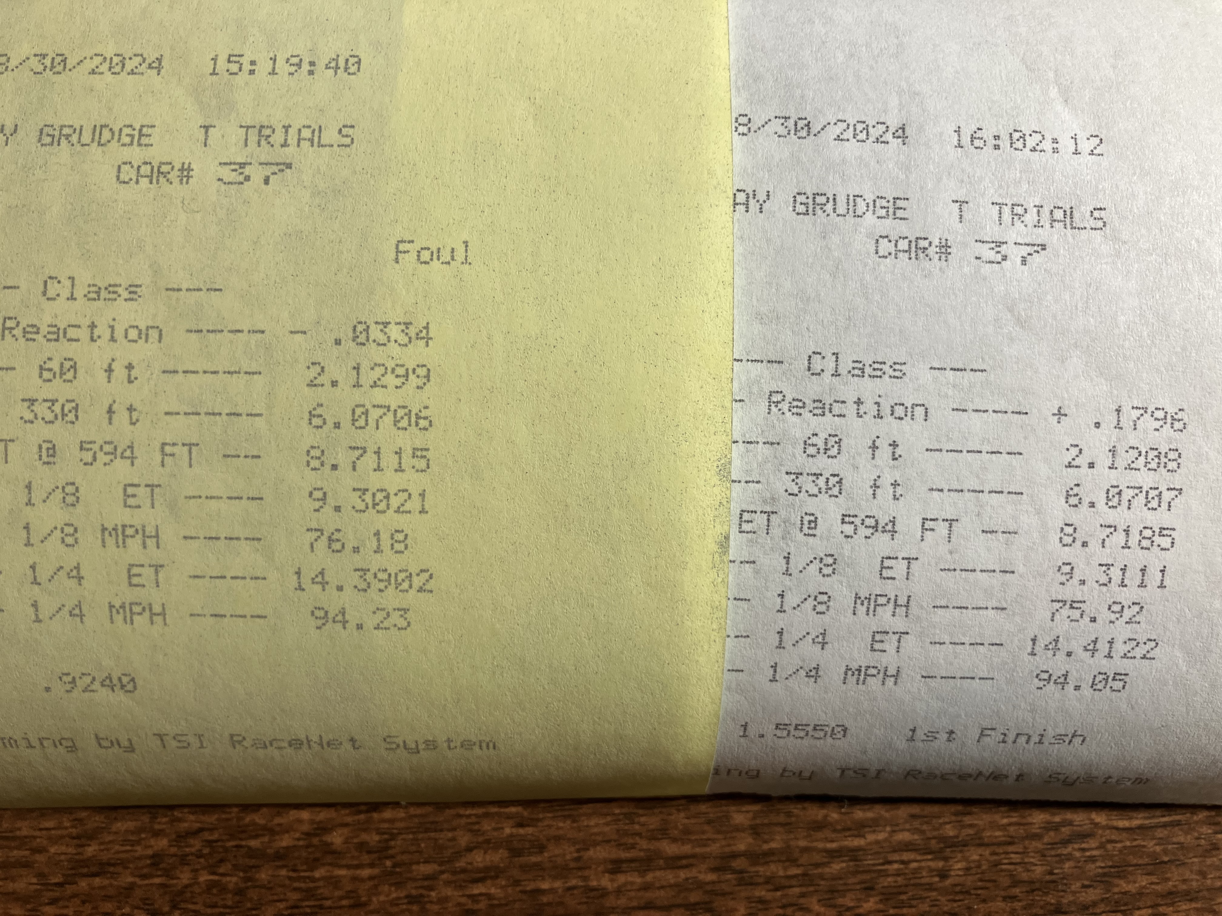 Best was 14.39, with 3 of the other 4 passes in the 14.40's. With a 2.1 60' time I'm sure there is more there with a posi or some way to launch it better. It's one wheel peel which means the best launch on short notice is with the traction control on.