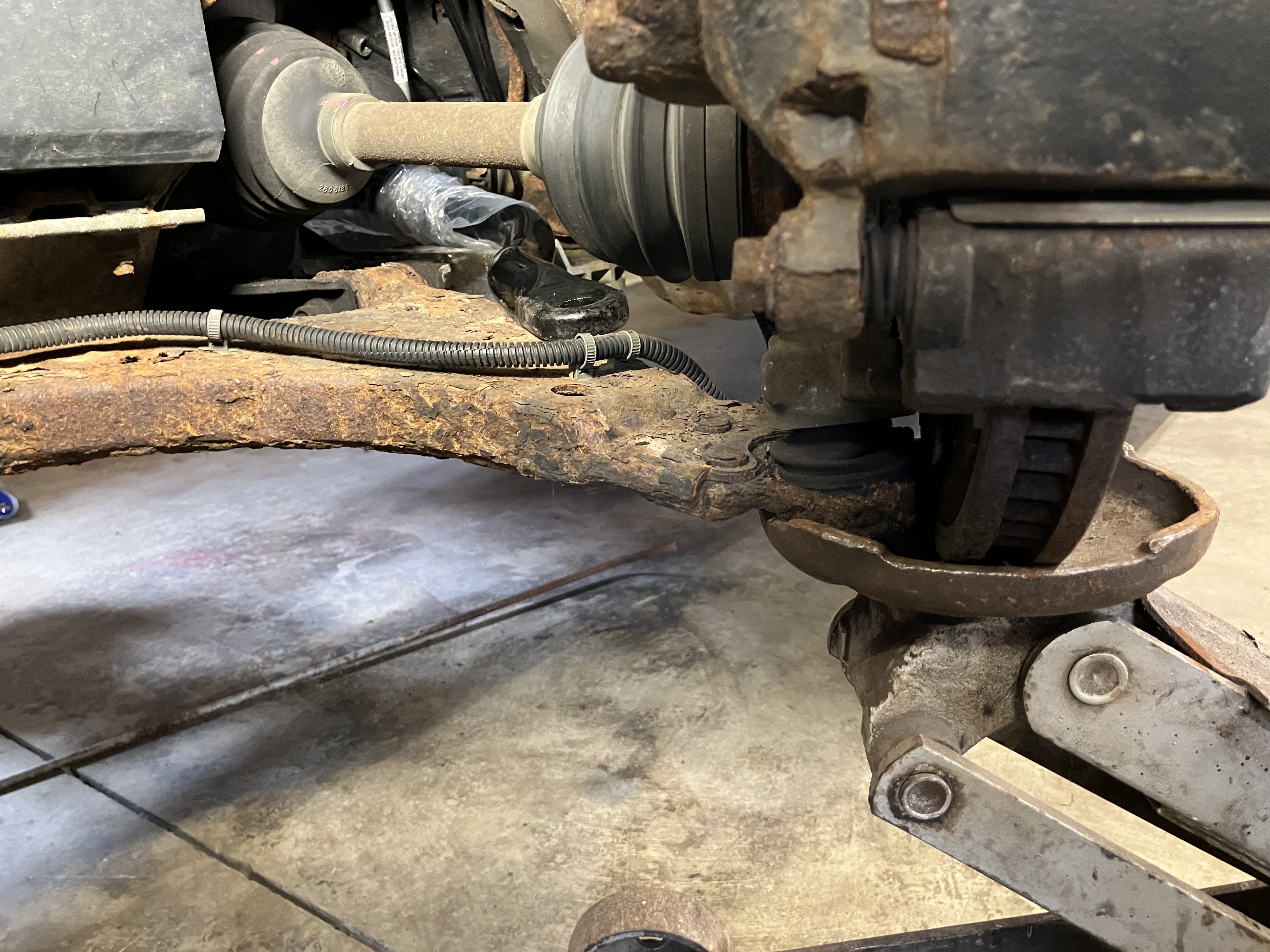 I did some inspecting of the chassis to make sure it was still sound. With the Acadia rust cancer surprises I didn't want to really do anything on the car until I knew it was sound. There is a fair amount of rust underneath but nothing I would call terminal. I can see a hole in the rocker panel under the driver, but the main rust issue was in the LF wheel well. The chassis there had a huge rust blister that I think needs attention. The plan here will be to make a metal patch panel and have Kurt weld it in. Its only the outside layer that looks compromised by rust.
