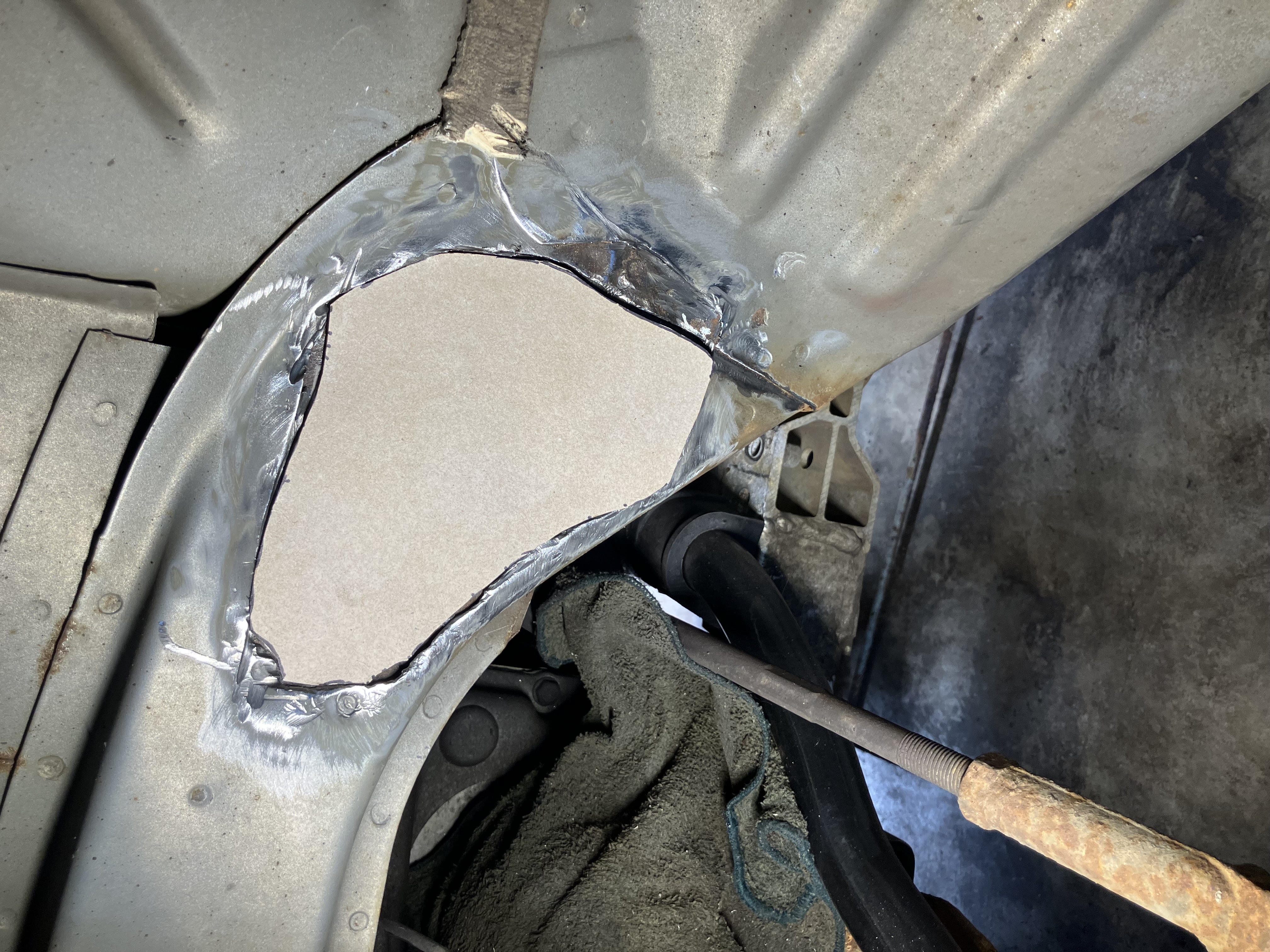 I cut out the rusted material, cleaned up the area and made a cardboard template. The metal is .070". Kurt has some scrap metal from industrial equipment I'm expecting a piece to arrive today. Once the metal is cut to match the template I'll have Kurt weld it in.