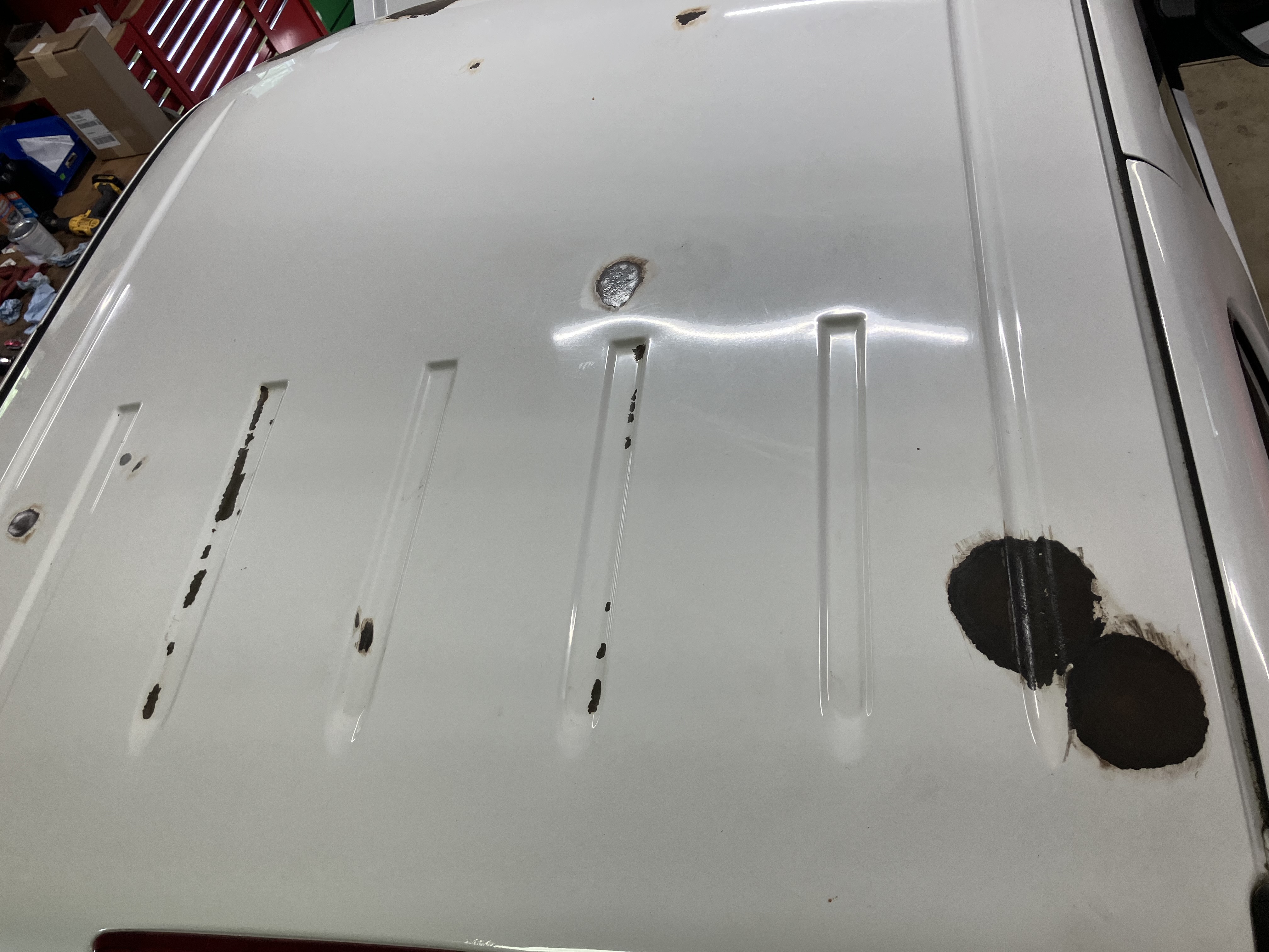 Wanted to address the rust on the roof to open the possibility of getting the windshield replaced at any time. The rust spots on the front of the roof ran right up to the edge of the windshield. I removed all the trim at the top of the windshield (rubber pieces that are replaced when windshield is replaced) and was able to sand out the rust in the channel, as well as the rest of the rusted spots on the roof. The factory paint on this truck is having problems with adhesion. There are places scattered all over this truck where the paint is flaking off: roof, door jambs, under the floor mat, bottom of the hood, bottom of the cab, inside the front fenders, under the bed. Current plan is knock off as much of the loose paint as is reasonable (with the right pressure washer it would probably all come off) and touch it up mostly to prevent rust and a little to help it look a little more presentable. I’m taking BP’s recommendation and putting Rustoleum rusty metal primer on these areas, following that up with Rustoleum gloss white. It’s not an exact match but it passes the 20’ test pretty good. Prep includes cleaning out dirt, removing rust with wire wheel followed by a sander, removing loose paint with compressed air, then applying paint by brush. This oil base paint lays down nice and with the right amount of paint it does not leave brush marks. It’ll be fine for this truck’s purpose – probably more than I should bother with.