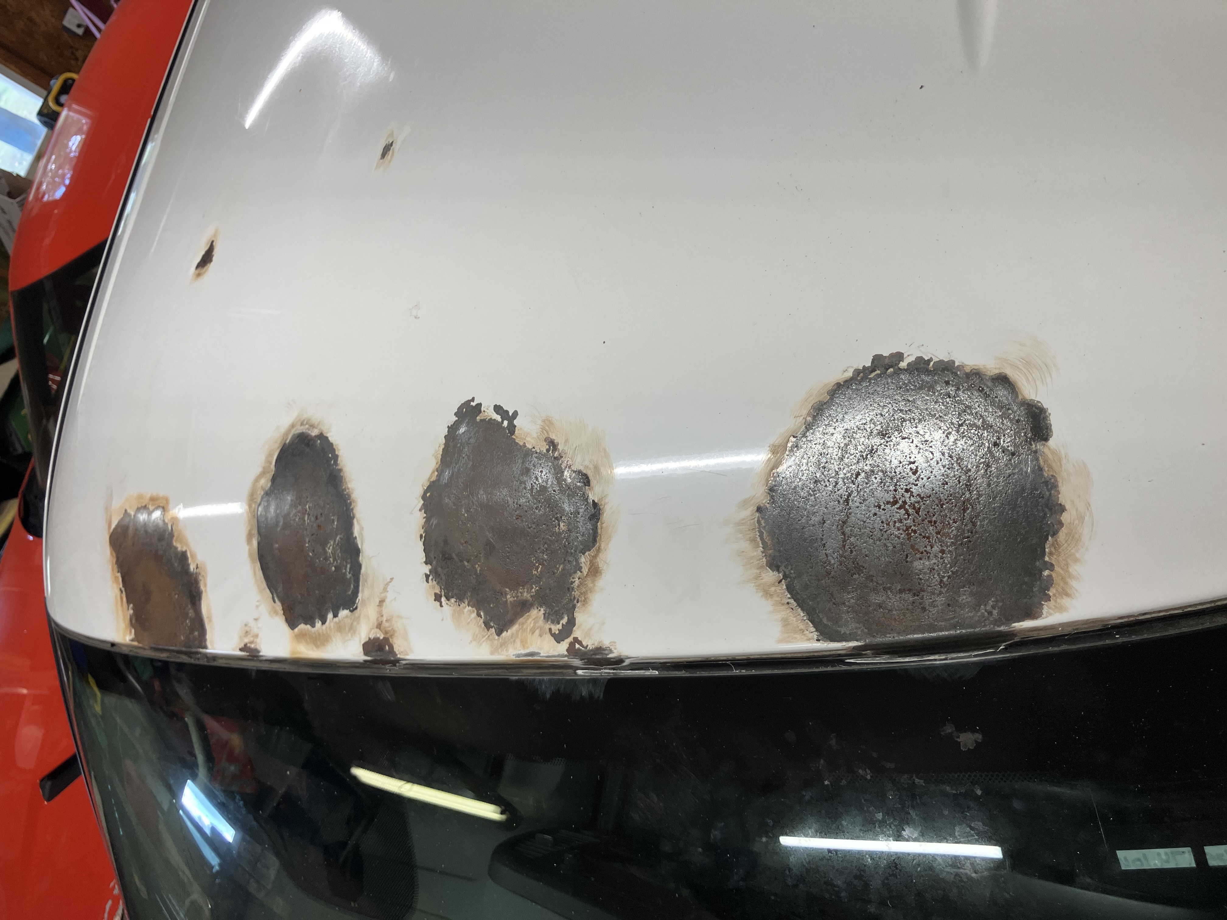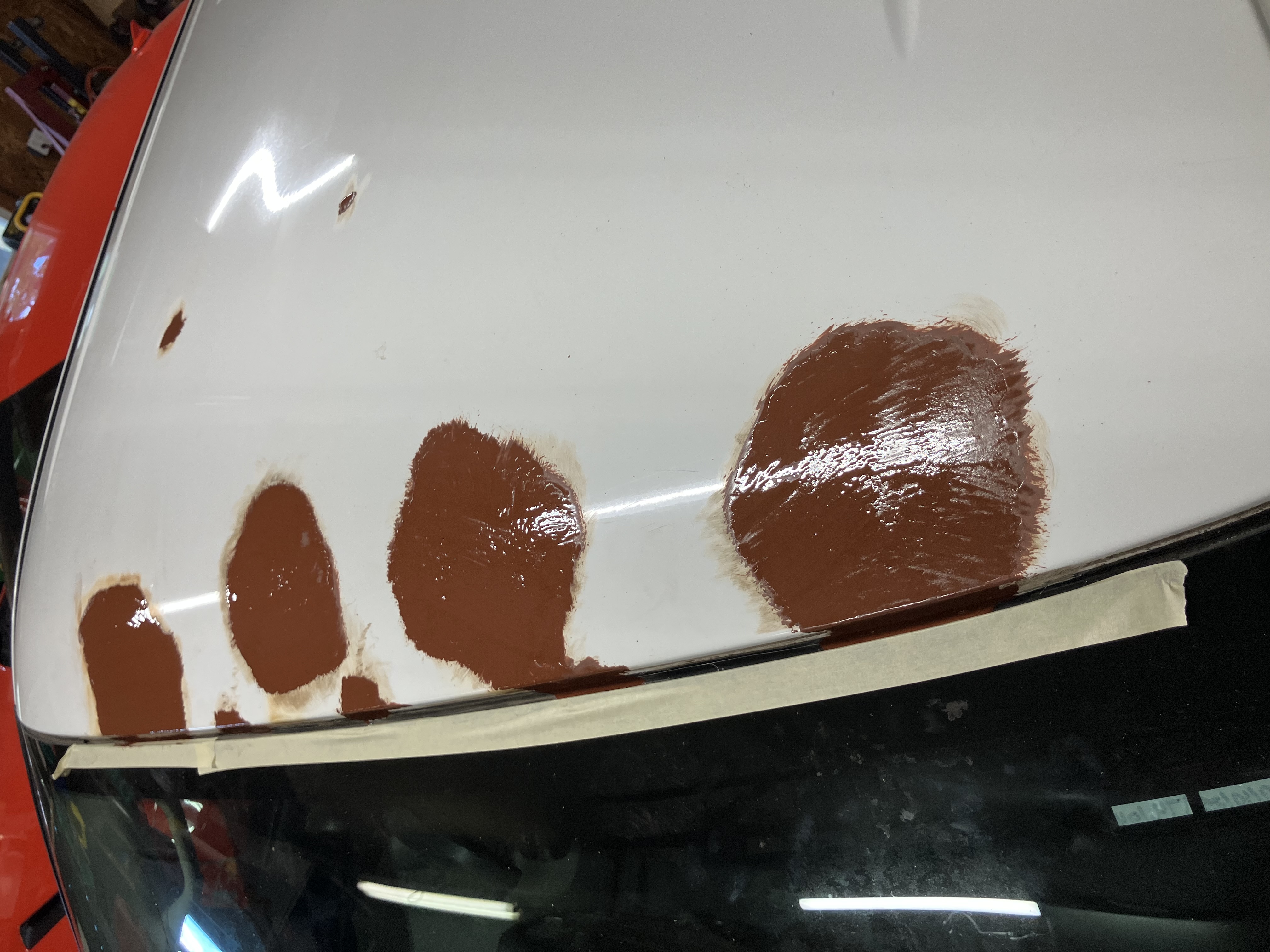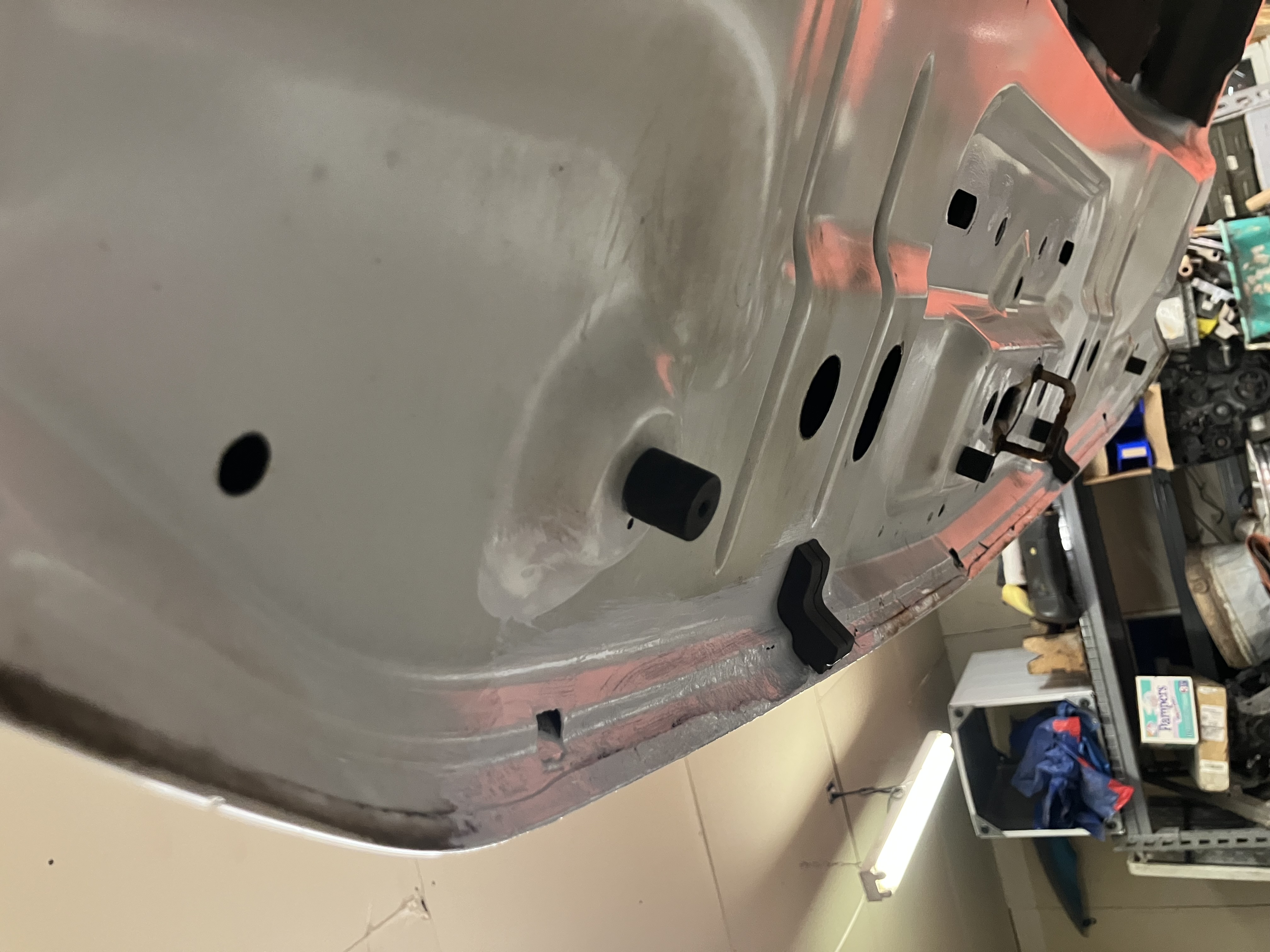 Prepped the bottom of the hood including applying Rustoleum rusty primer - only addressing the rusted areas. Did a bit of metal straightening on the bottom of the passenger doors. Prepped rusty areas on hood and doors by cleaning off rust, applying Rustoleum rusty metal primer followed by Rustoleum white on bottoms of doors and affected areas on the hood.