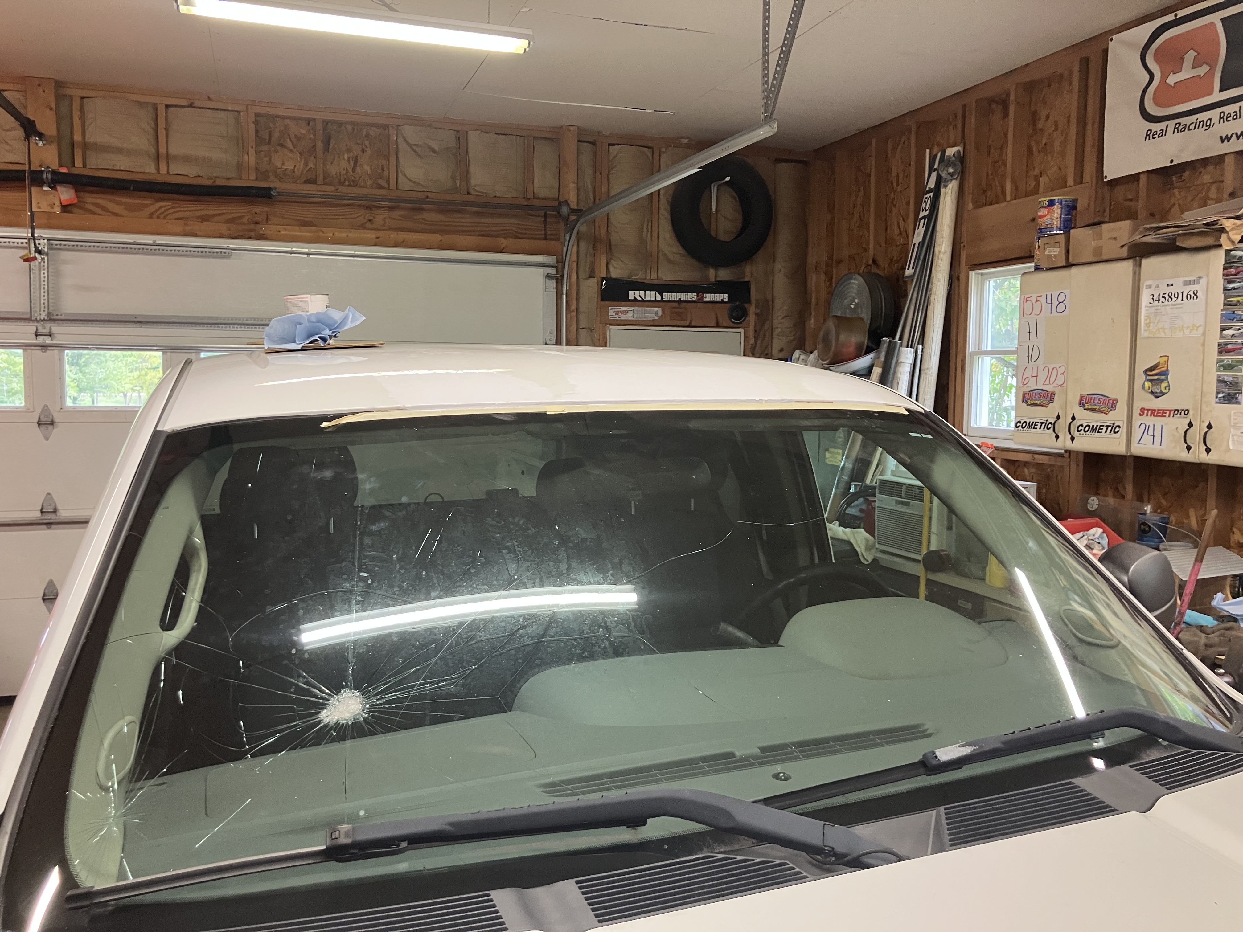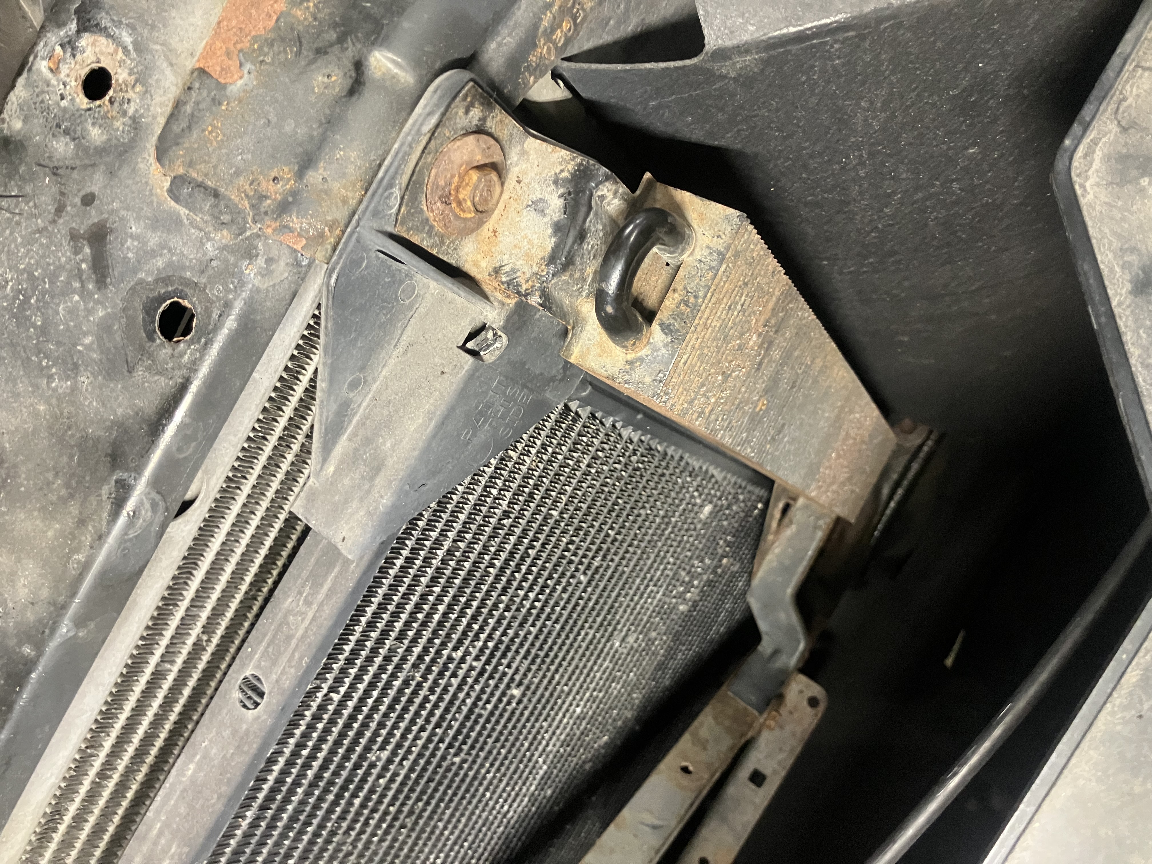 This truck needs work: broken windshield, slight coolant leak, blown out driver seat airbag, TPMS light on, driver door inside handle broken, tail gate not latching, broken headlight, both taillights broken, A/C not working, the support beams between the bed floor and the frame are quite rusted. We did a field repair after negotiating a price to bypass the power steering cooler which had failed earlier that day.