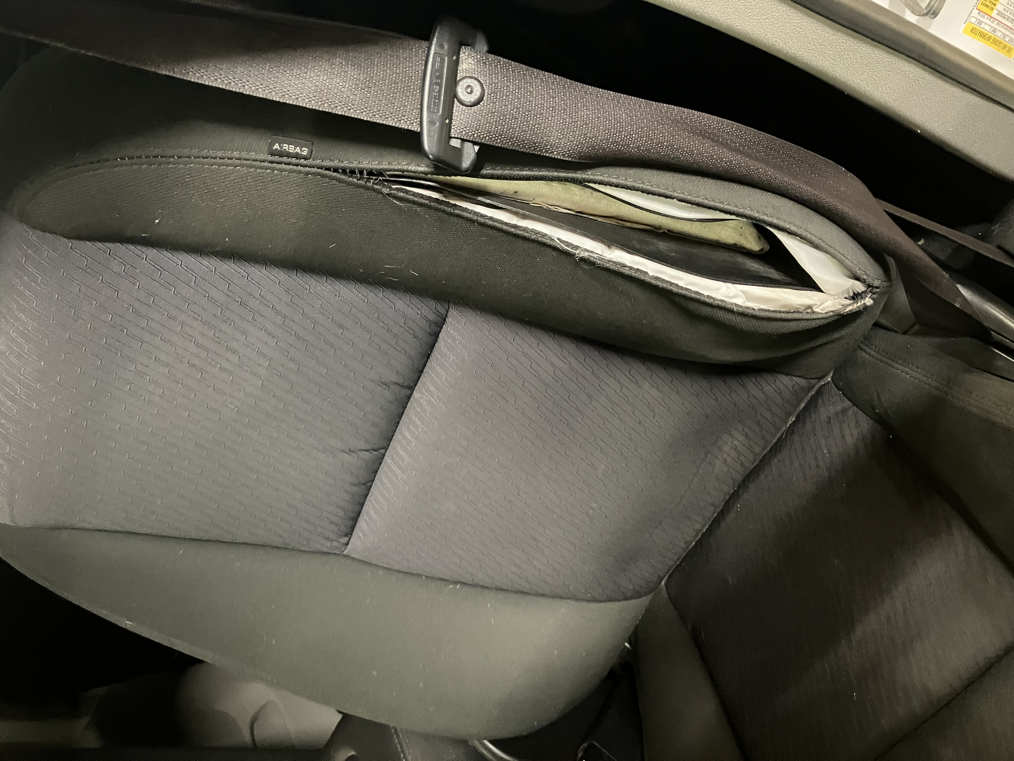 The airbag light was on, and the driver side seat was split open where the seat airbag is located. I didn’t see any damage on that side of the truck but assumed these were related. As it turns out the connection to the driver seat belt retractor was corroded, and as far as the seat it appears the stitching on the left side of the seat back has just failed. I’m still deciding how to handle the seat cover split, but the system is operational.