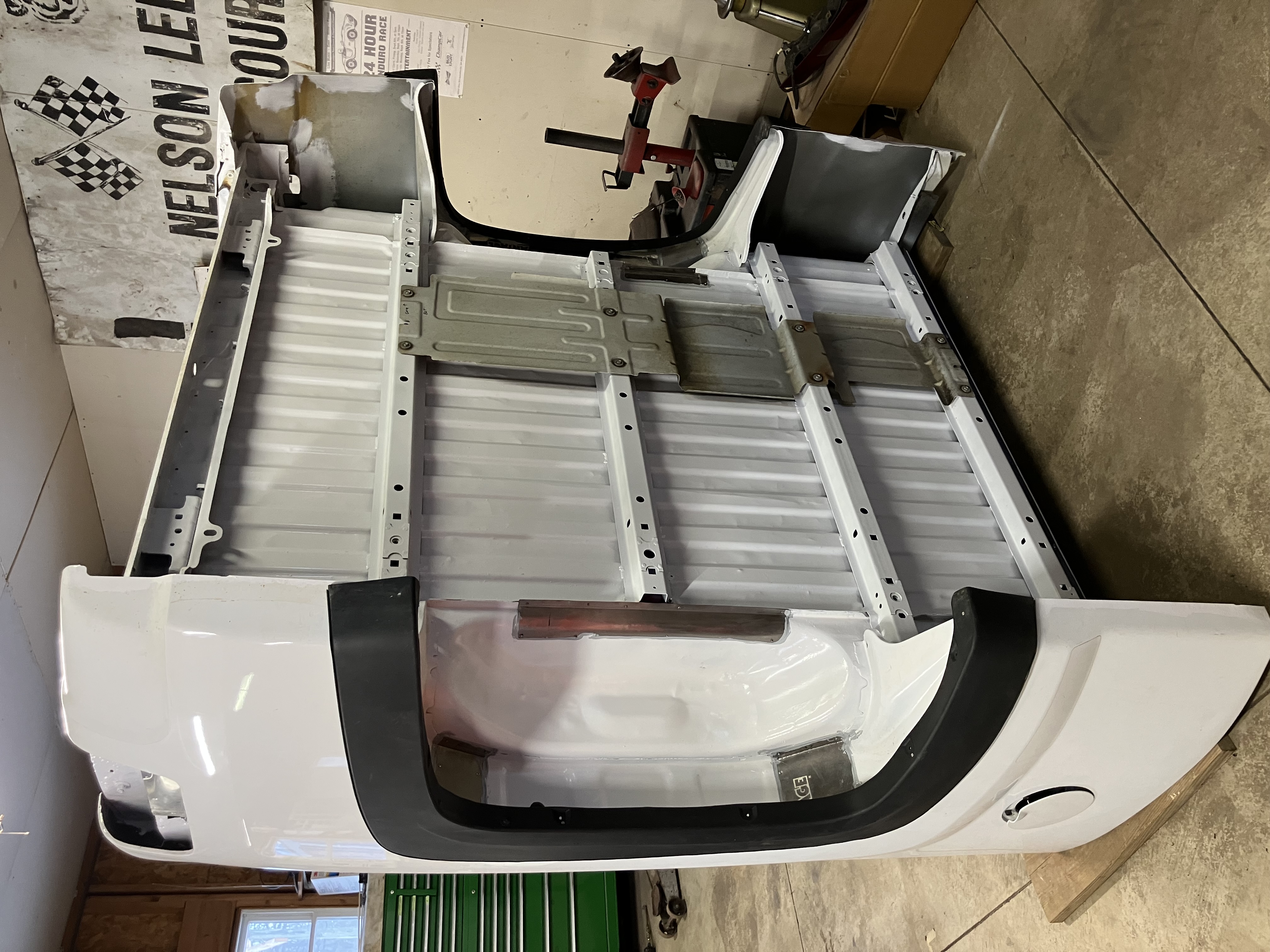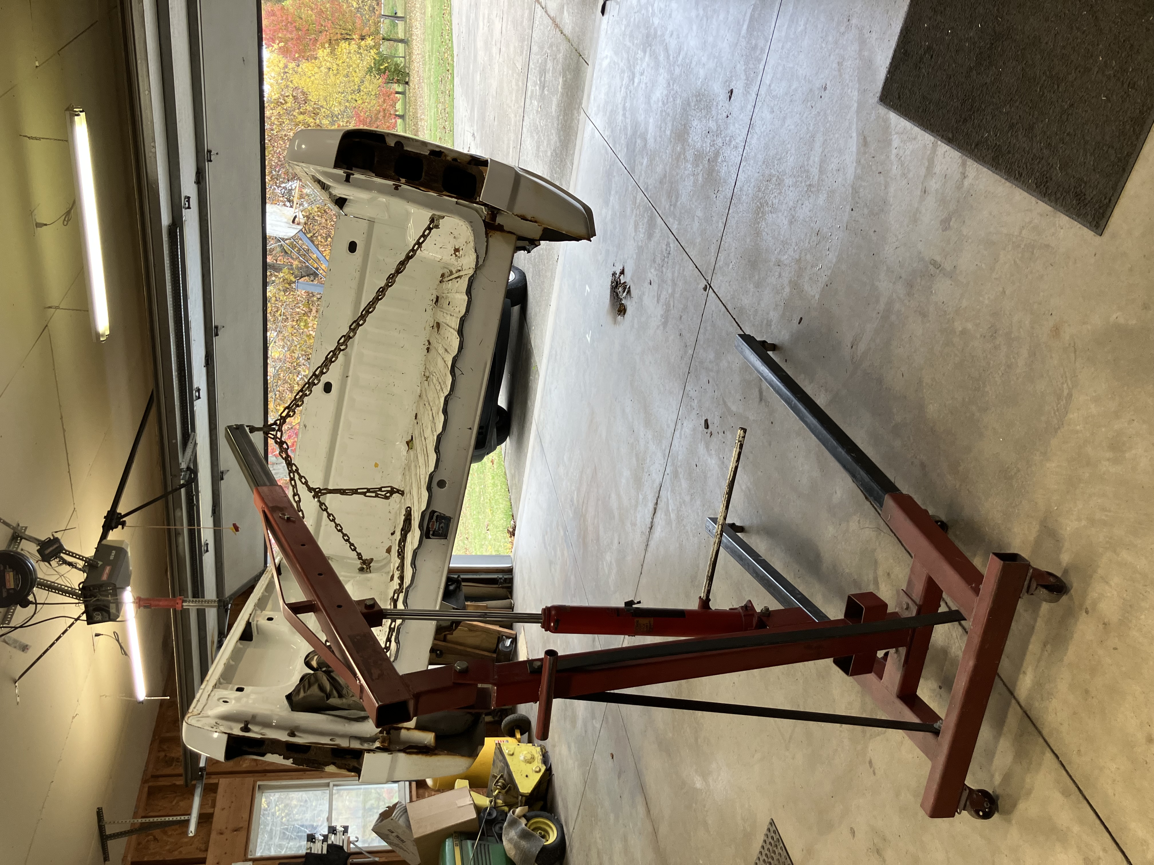 To fix this the bed had to come off. This was not a very complicated process. Disconnect the filler neck, remove tailgate, rear bumper, taillight wiring and 8 bolts and its ready to come off. With a little help from the engine hoist it was off. This made working on the bed much easier. I stood it on the cab side or laid it upside down depending on what was best for the task.