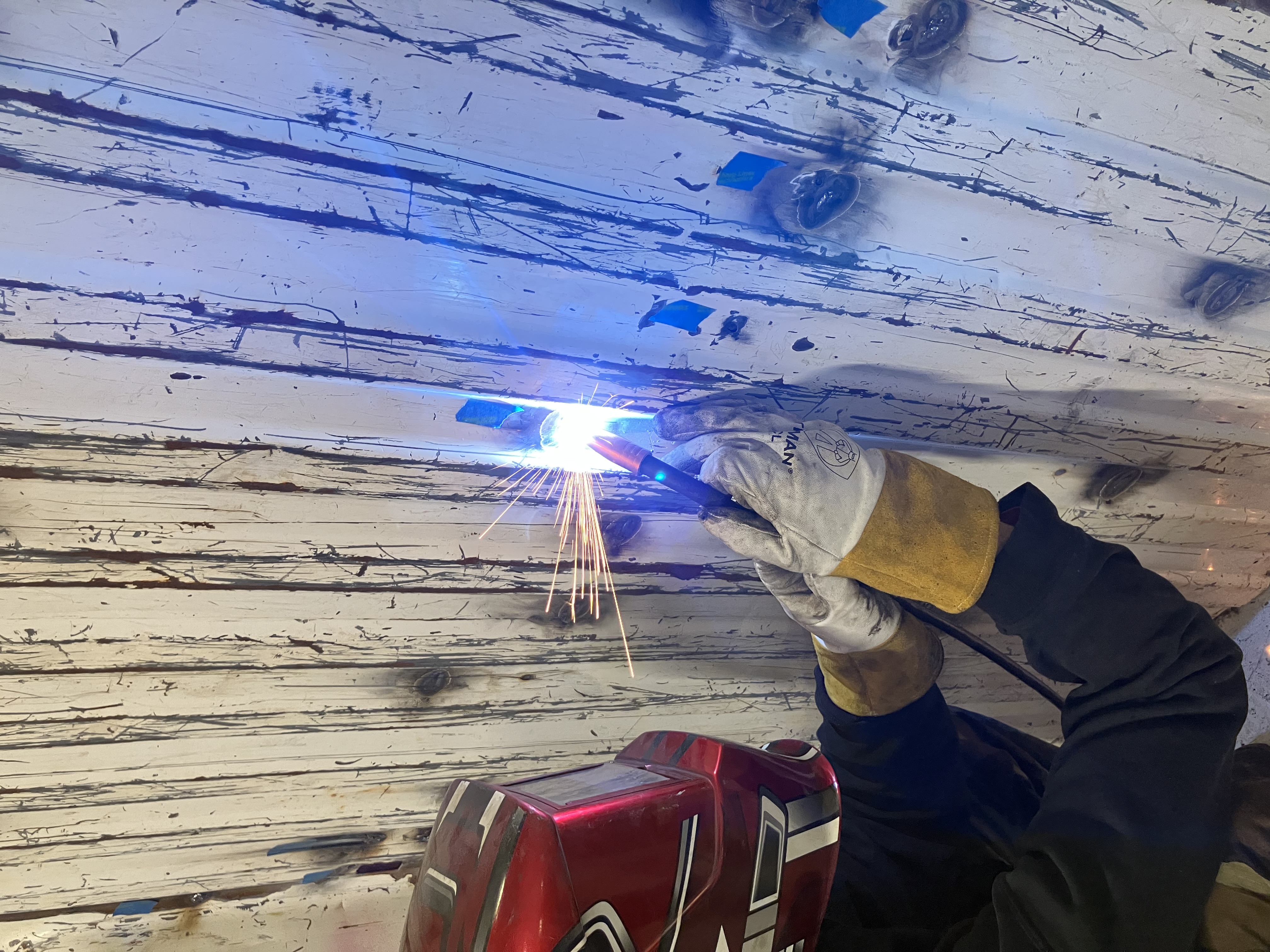 I then did final alignment on the cross braces, bolted them down and then had Kurt weld them in place. Those welds laid down real nice. He also filled some small holes in the bed – some of them not the best due to trying to weld thinner metal.