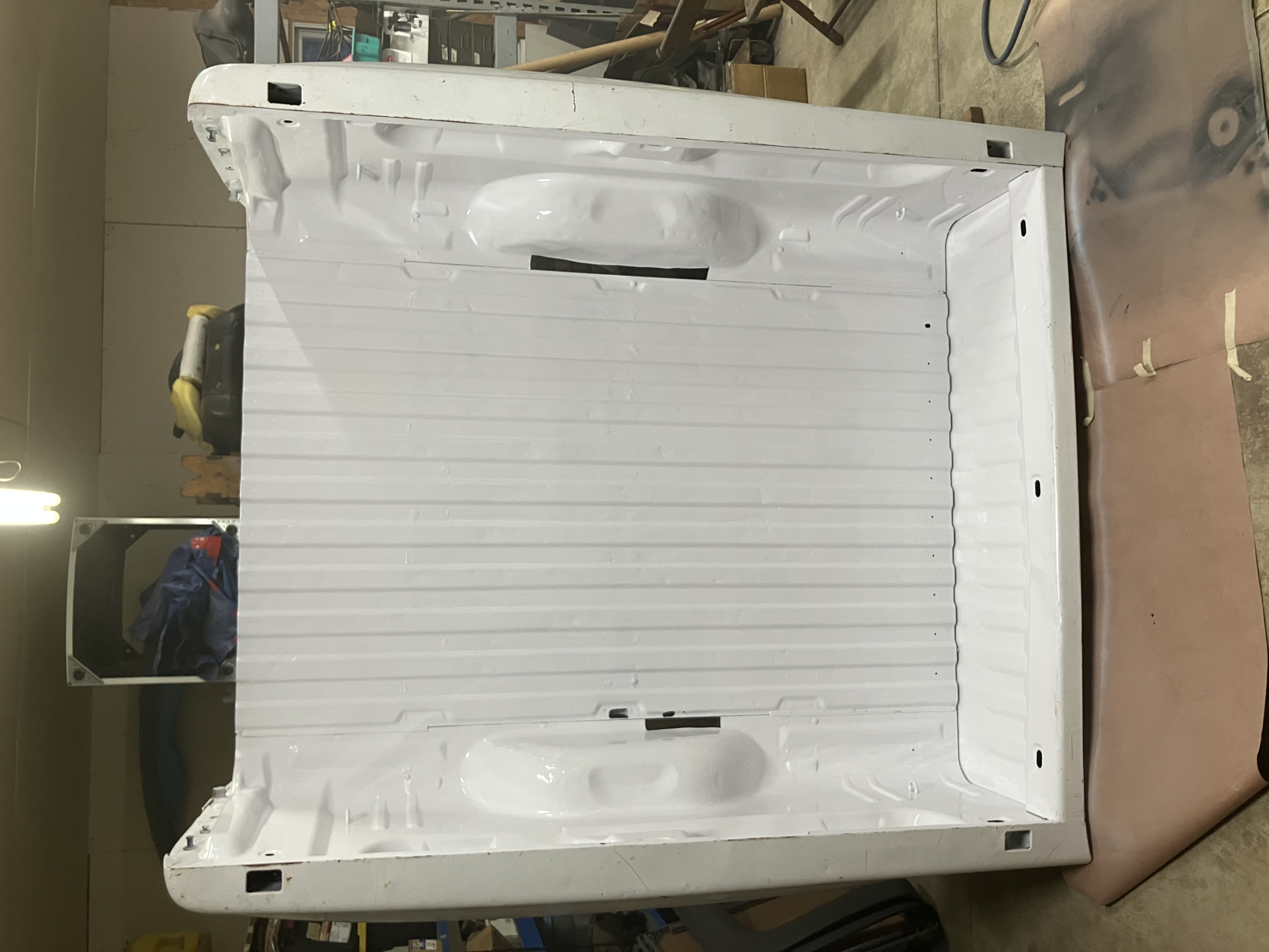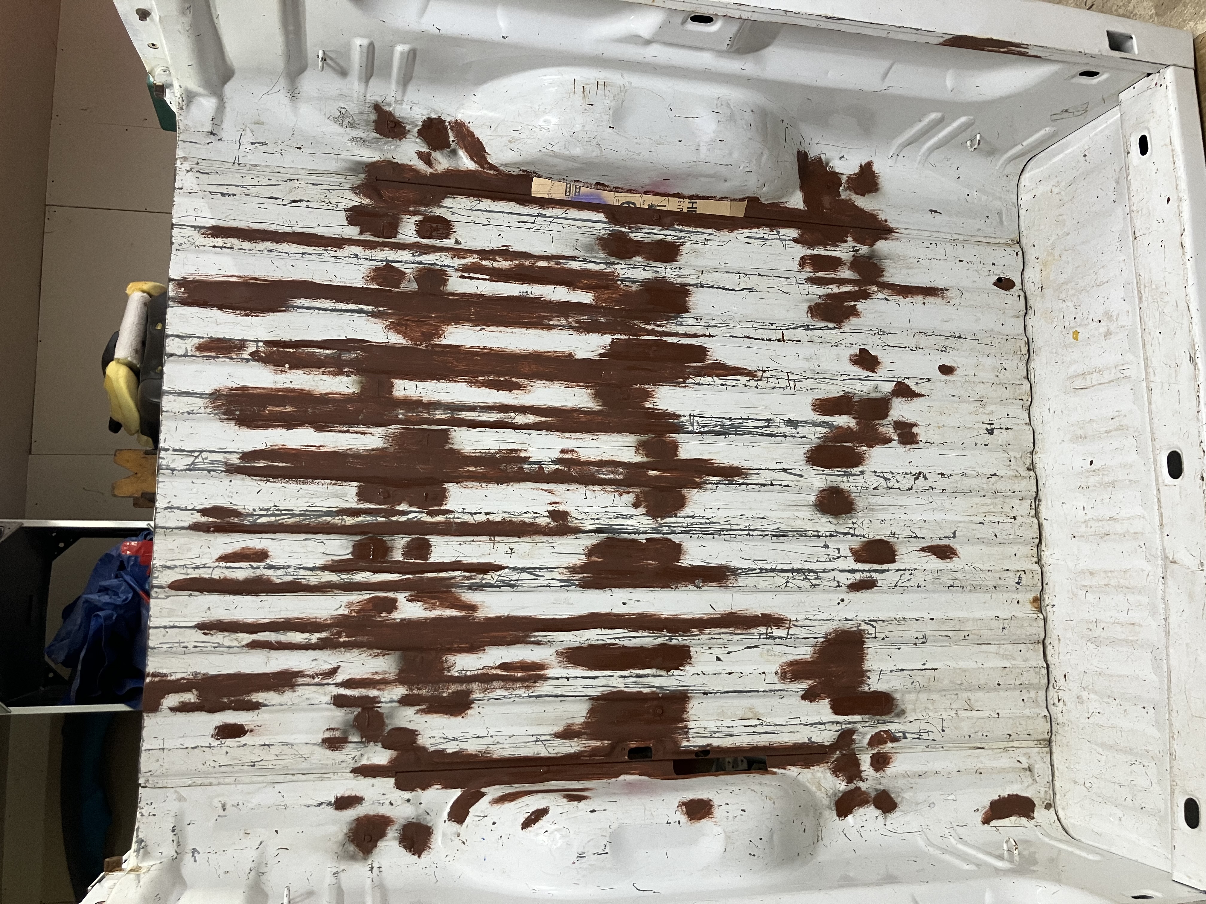 I had originally planned to use up random spray cans on the underside of the bed, and getting some spray can white to do inside of the bed. Kinda didn’t like that approach and decided to see if I could use the spray gun to apply Rustoleum. With the help of a YouTube video I learned you can do this, and to use acetone to cut the paint.