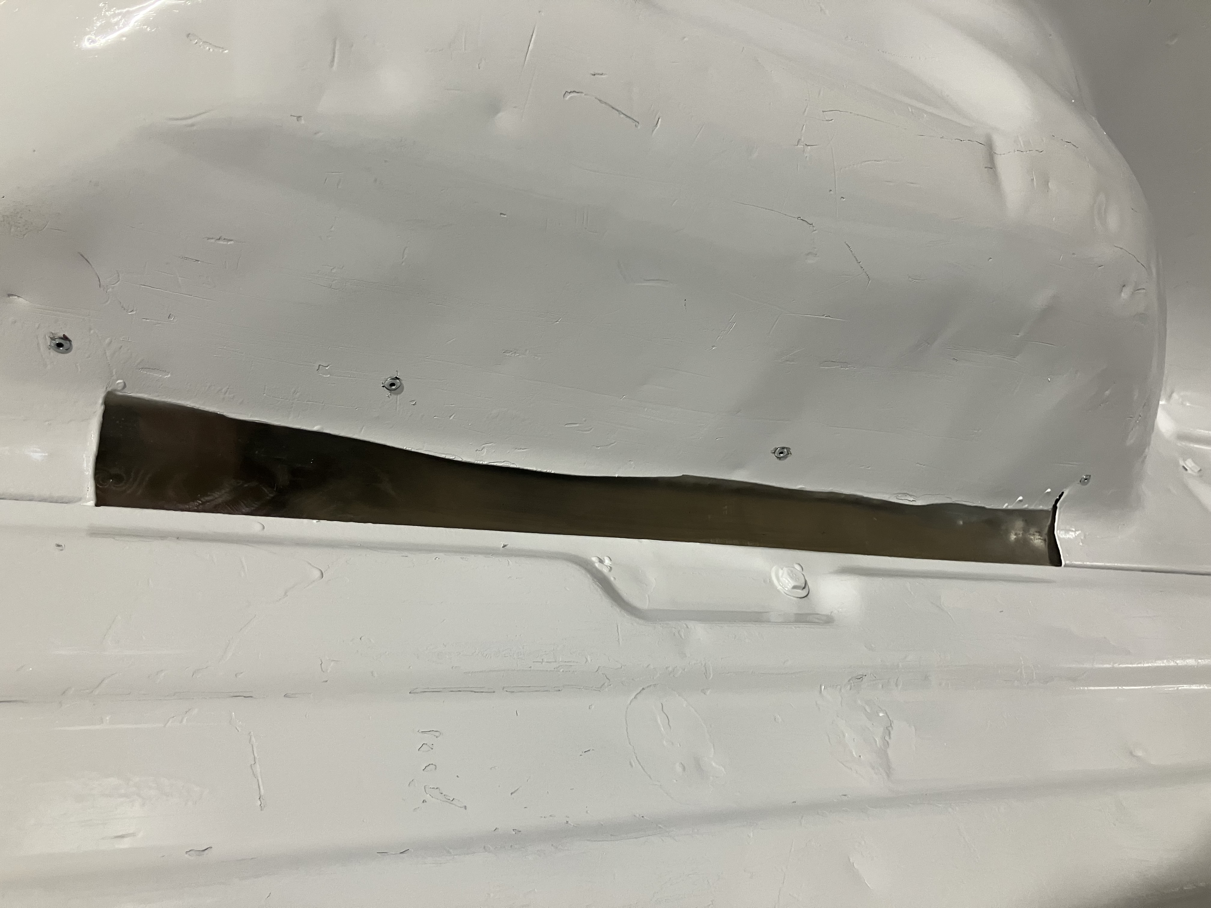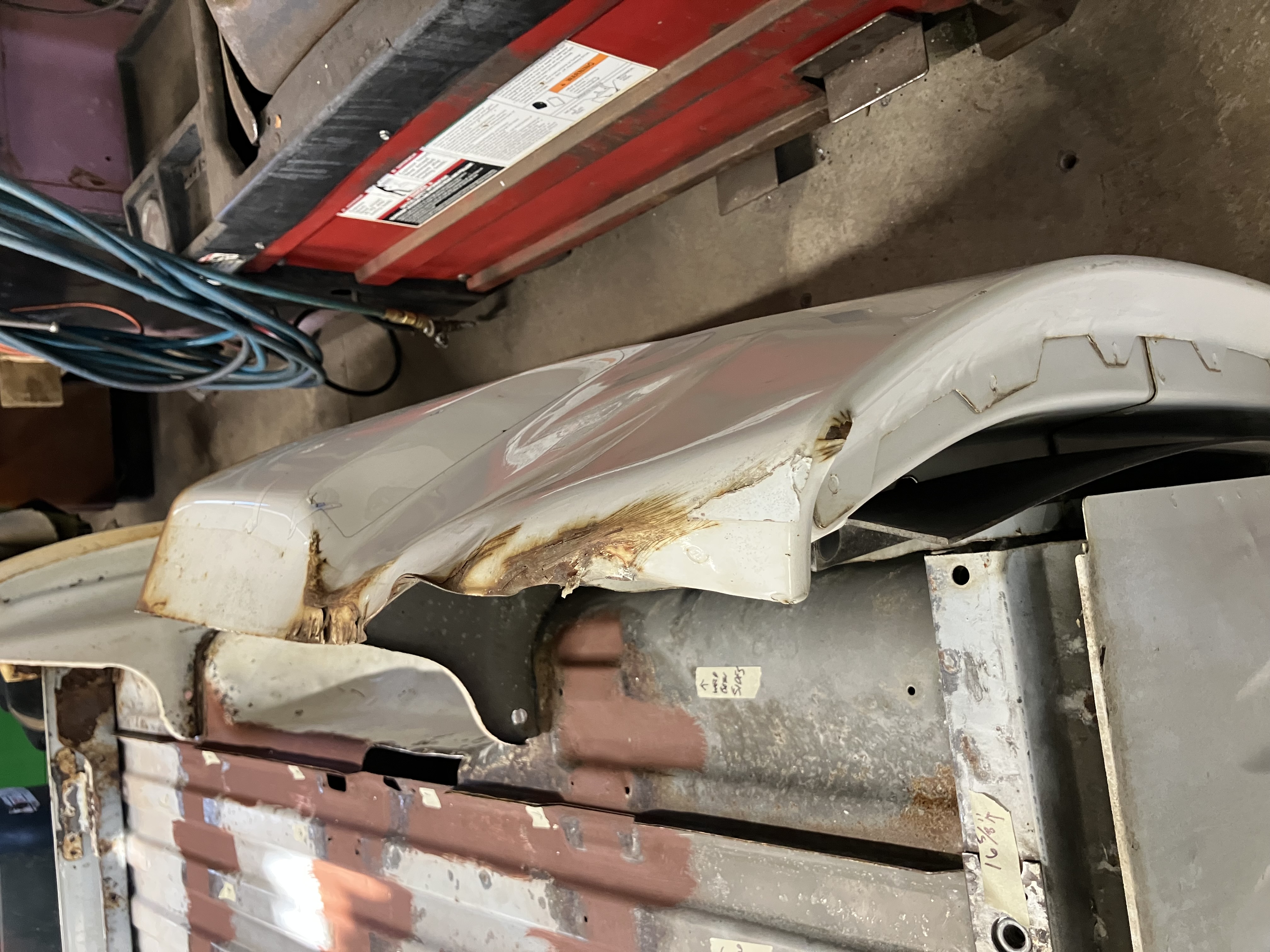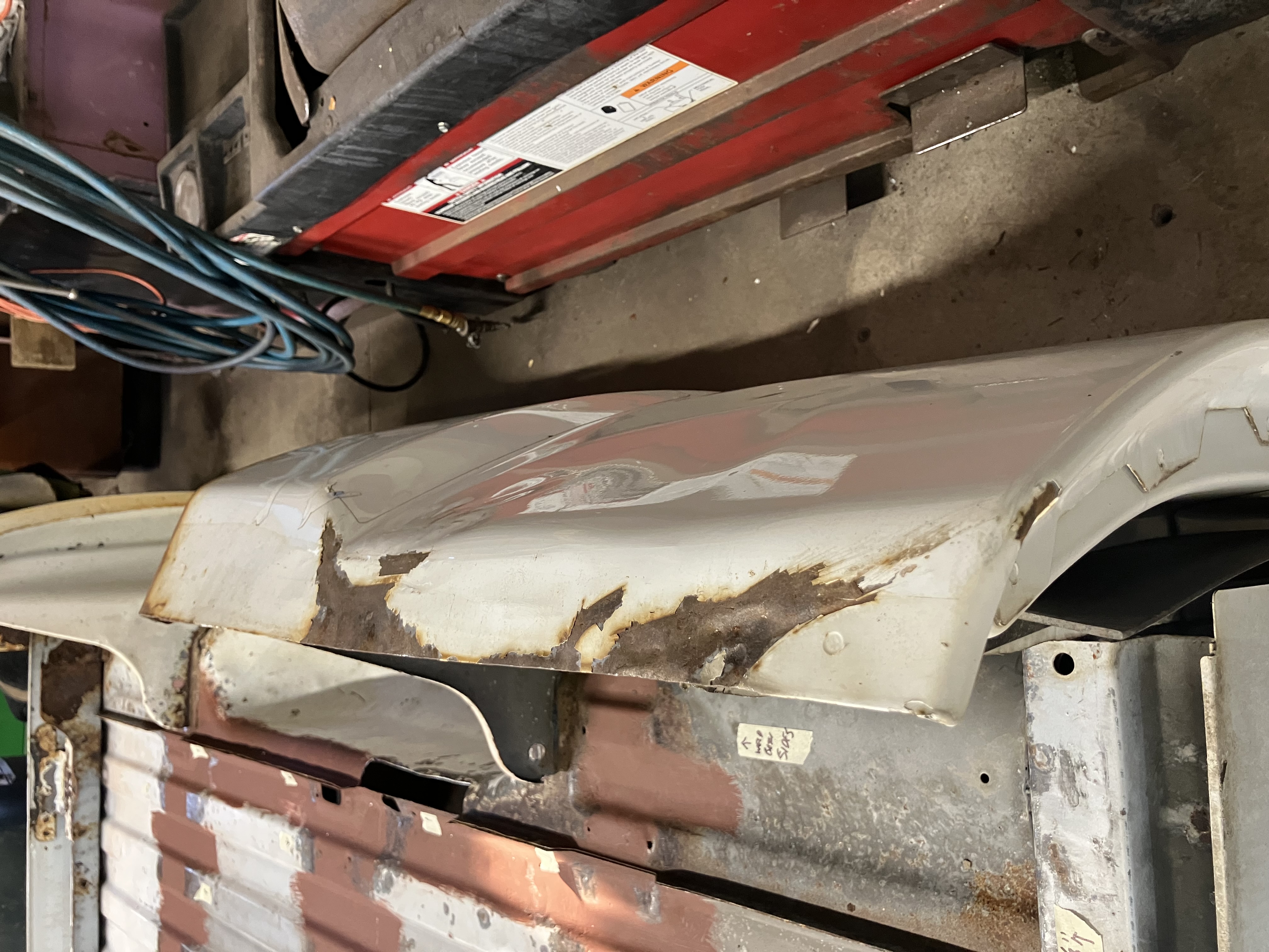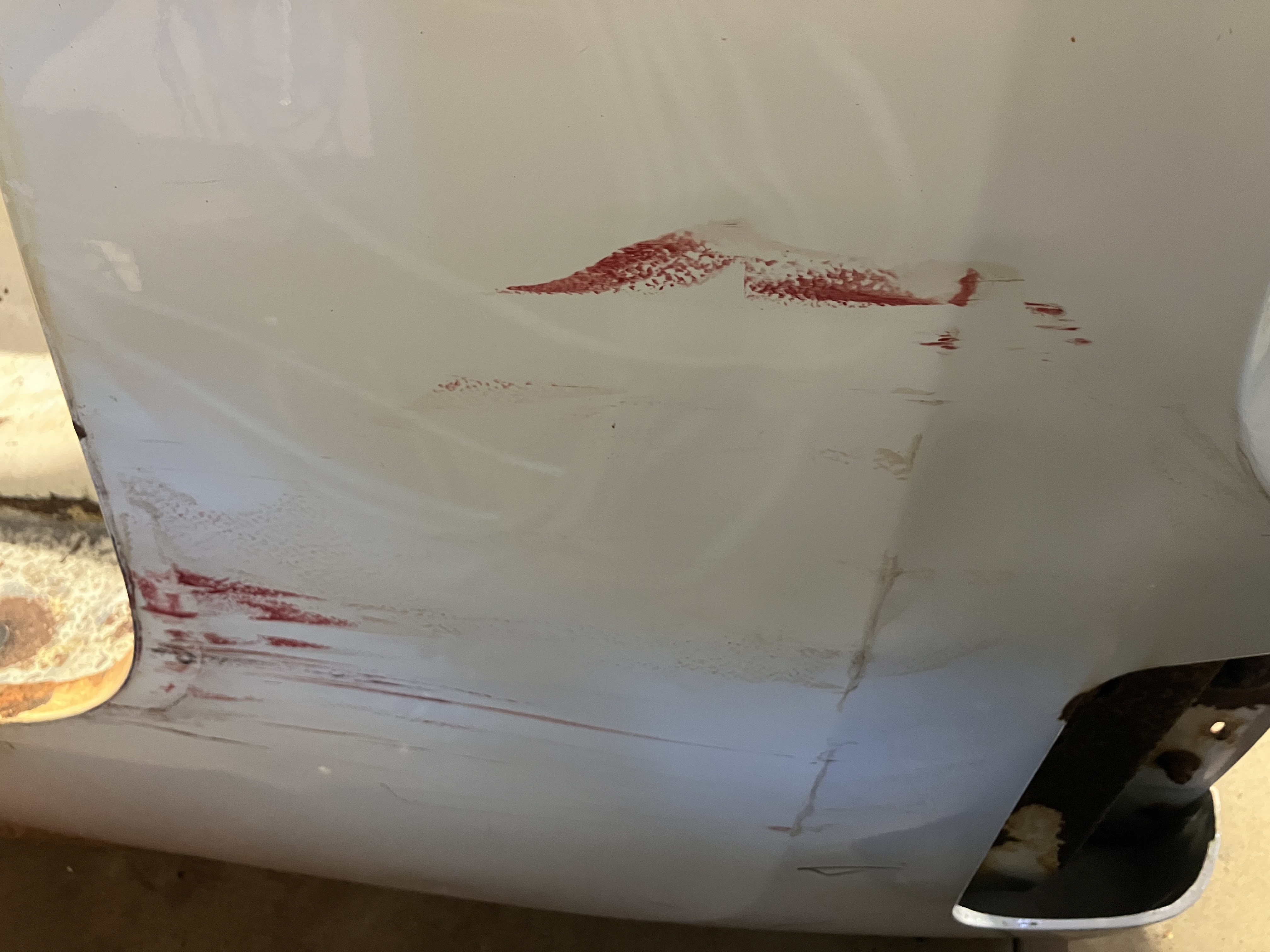 Prepped the bottom of the hood including applying Rustoleum rusty primer - only addressing the rusted areas. Did a bit of metal straightening on the bottom of the passenger doors. Prepped rusty areas on hood and doors by cleaning off rust, applying Rustoleum rusty metal primer followed by Rustoleum white on bottoms of doors and affected areas on the hood.