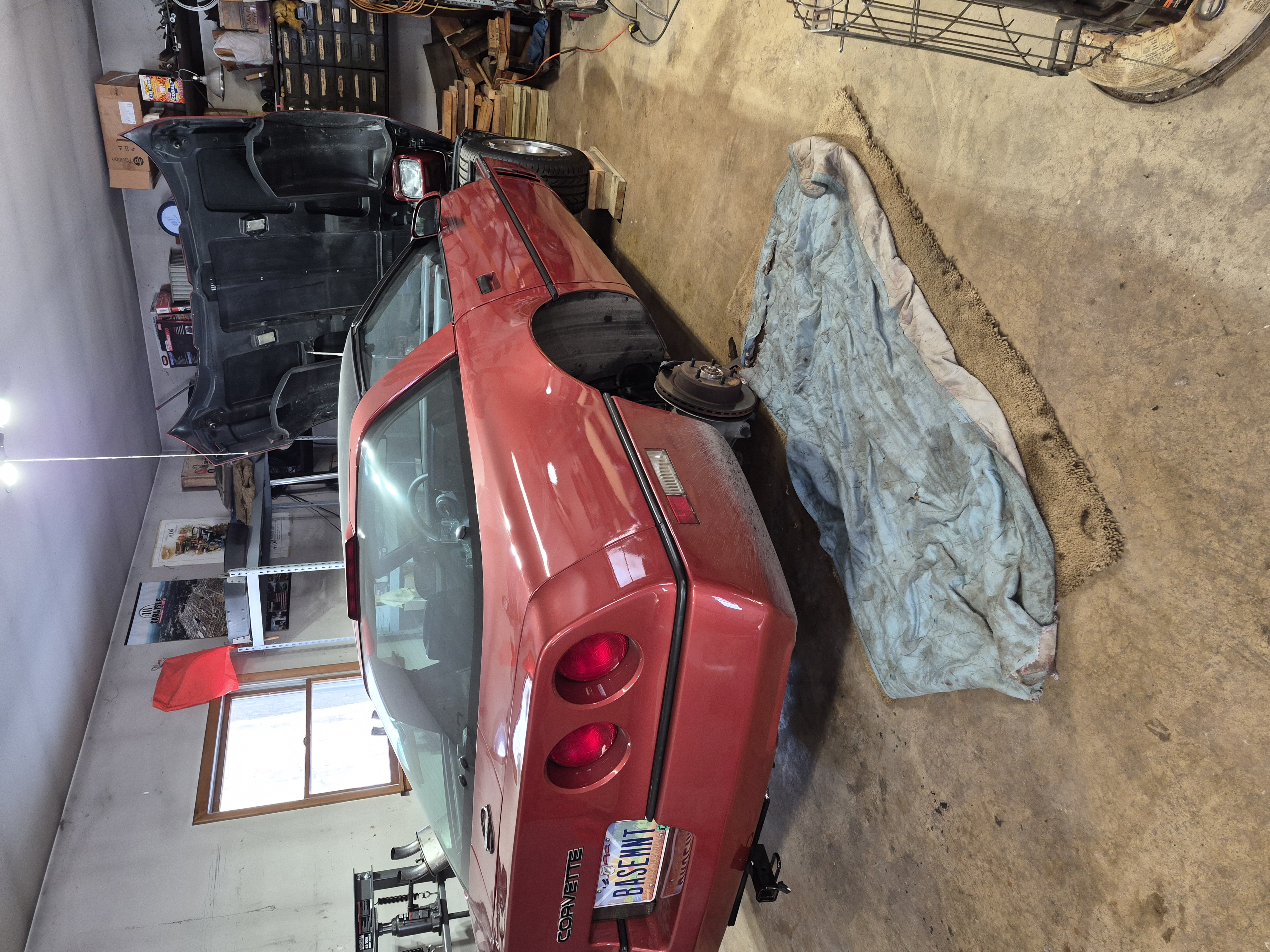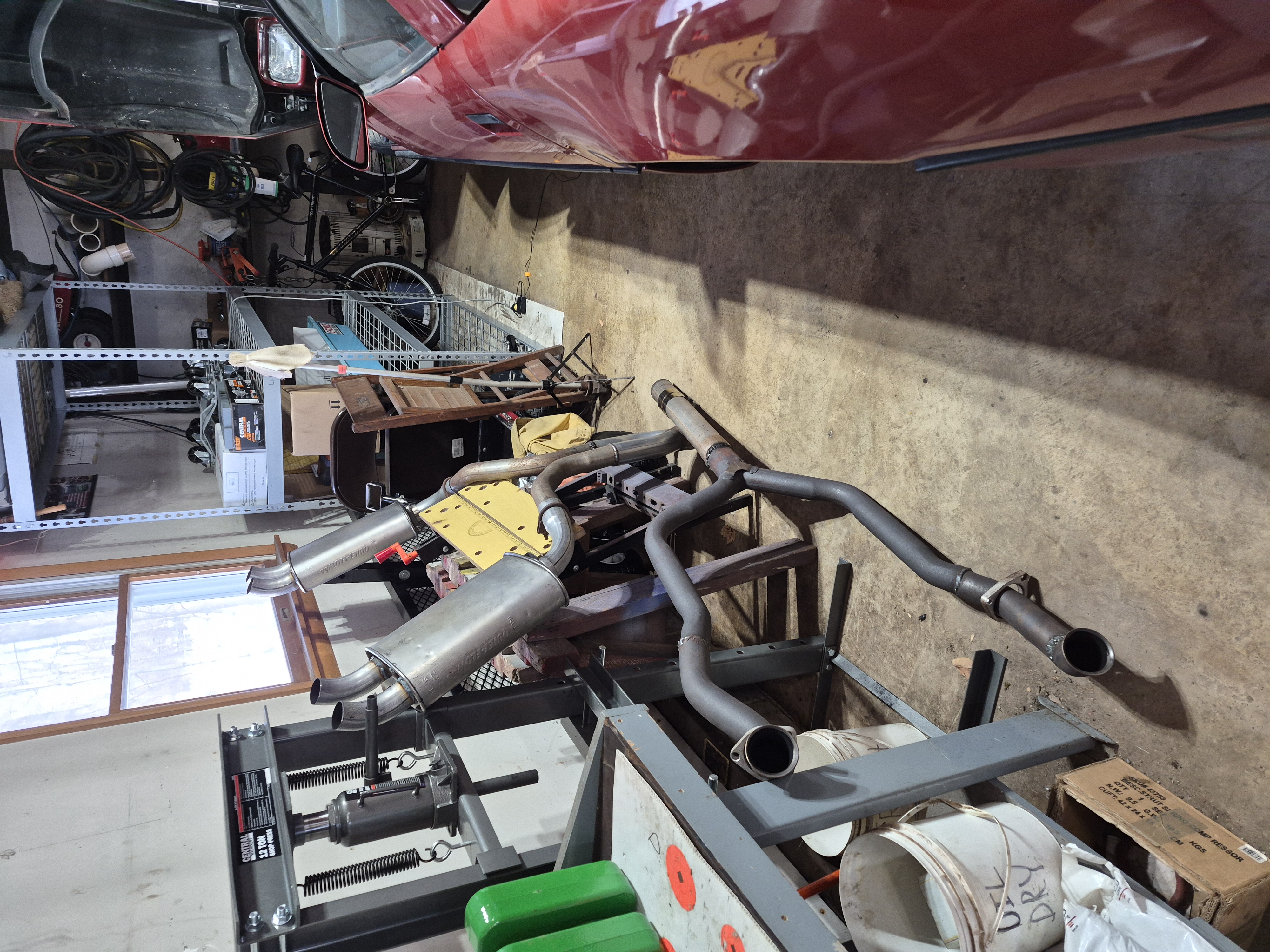 Today got the car up on blocks and stands. We pulled the complete exhaust off, my favorite front two bolts from the torque arm, the rear shocks, brake calipers, and sway bar end links. I think next week will likely be able to get the rest of the assembly out of the car in one unit.