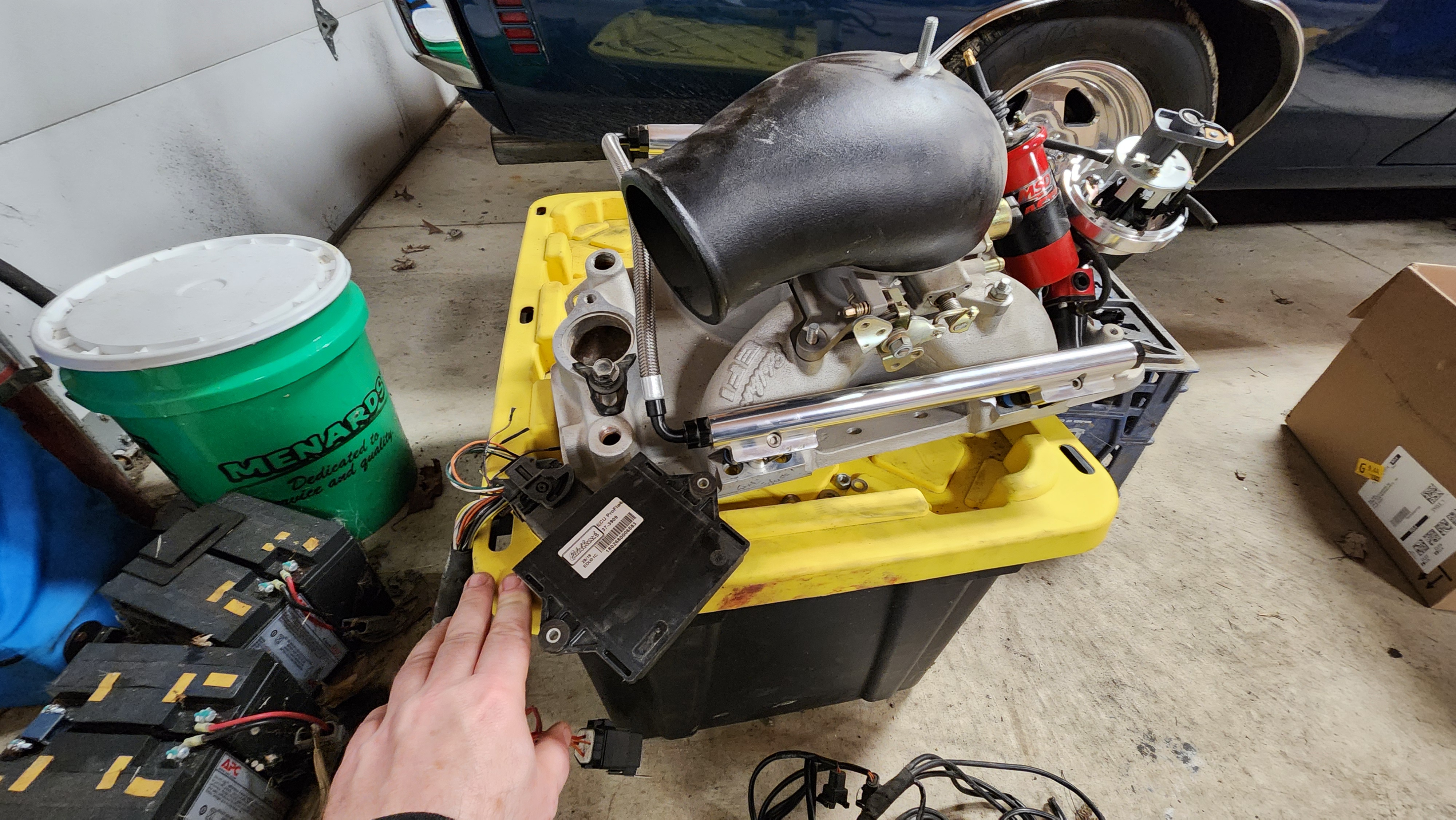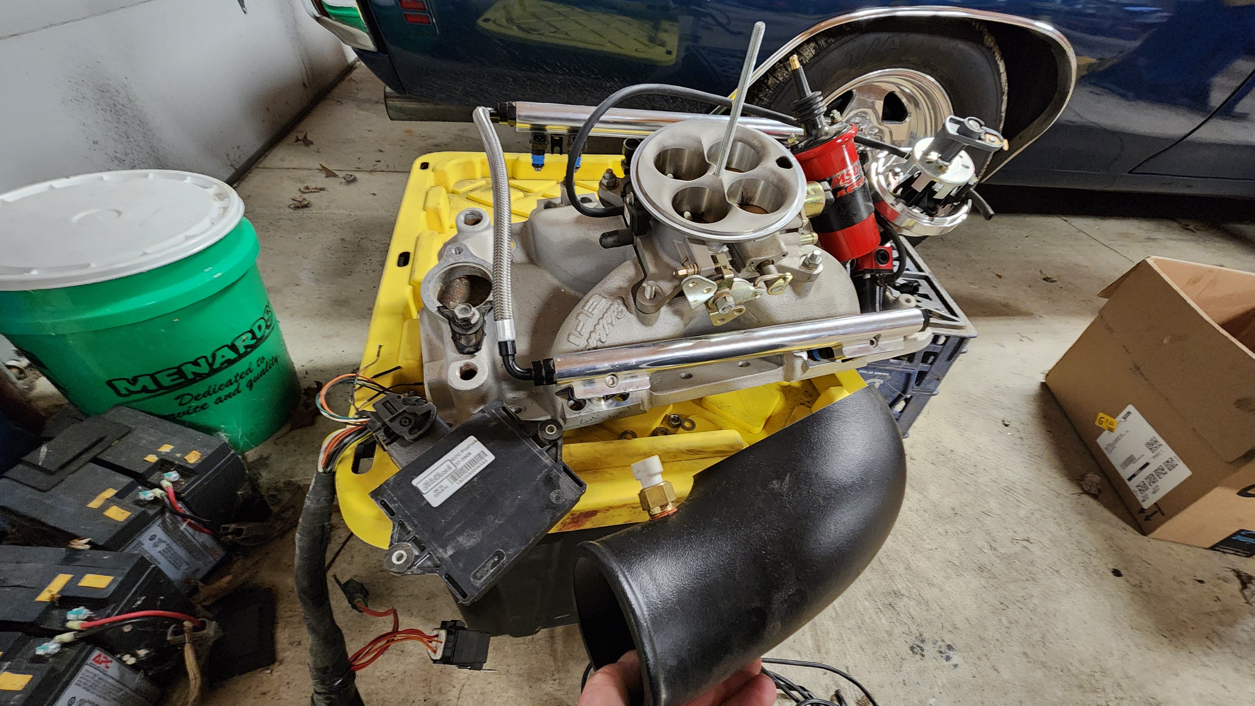 I found this on marketplace, and since I'm an EFI nerd, decided I had to have it. It's a complete Edelbrock Pro Flo 4 EFI for a small block. My irrational collection of SBC intakes aside, I really bought this for the ECU + harness. Brand new from Summit, this is like $2400. I got the intake, fuel rails, Aeromotive regulator, 60lb injectors, MSD distributor, Blaster Coil, 4bbl throttle body + nice cast aluminum hat, all sensors (missing 1), Wideband O2 sensor (LSU 4.9, i think)