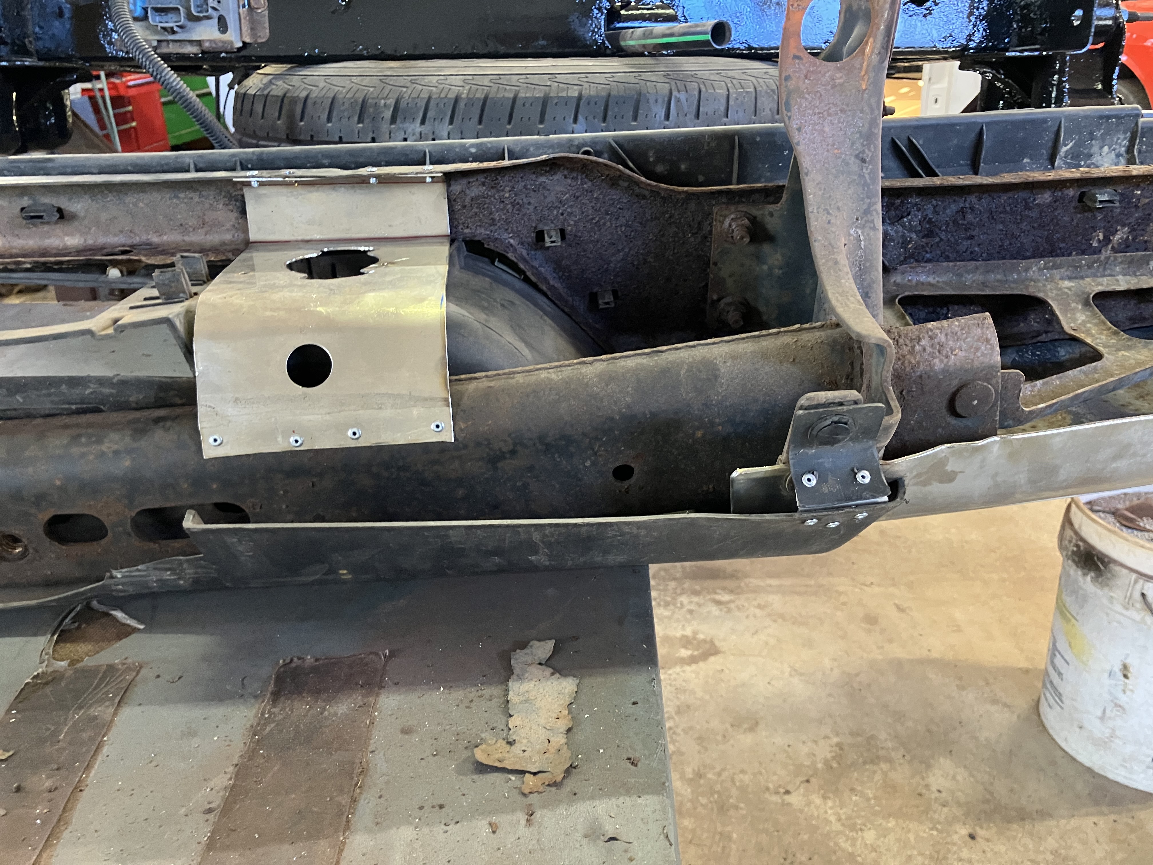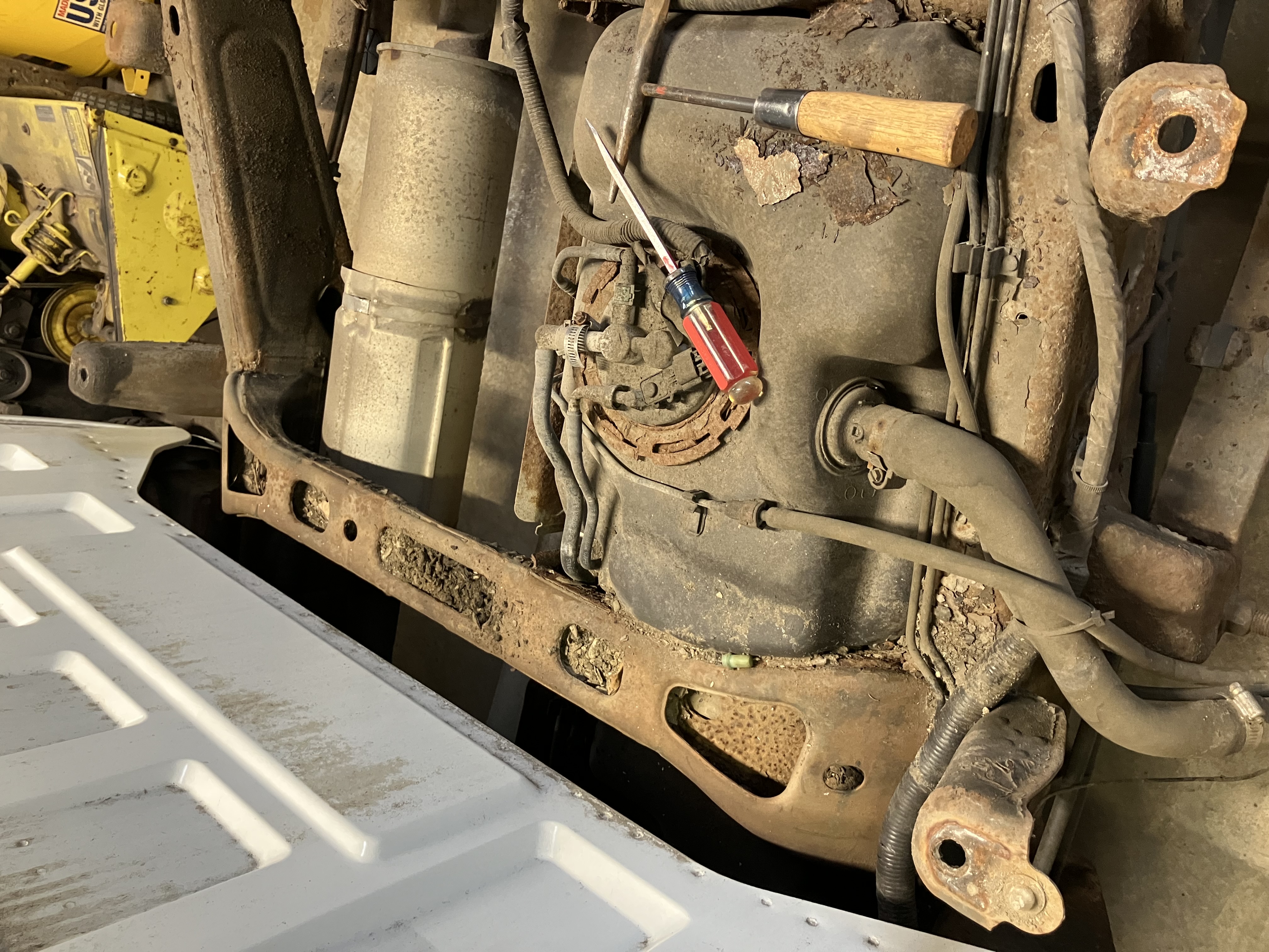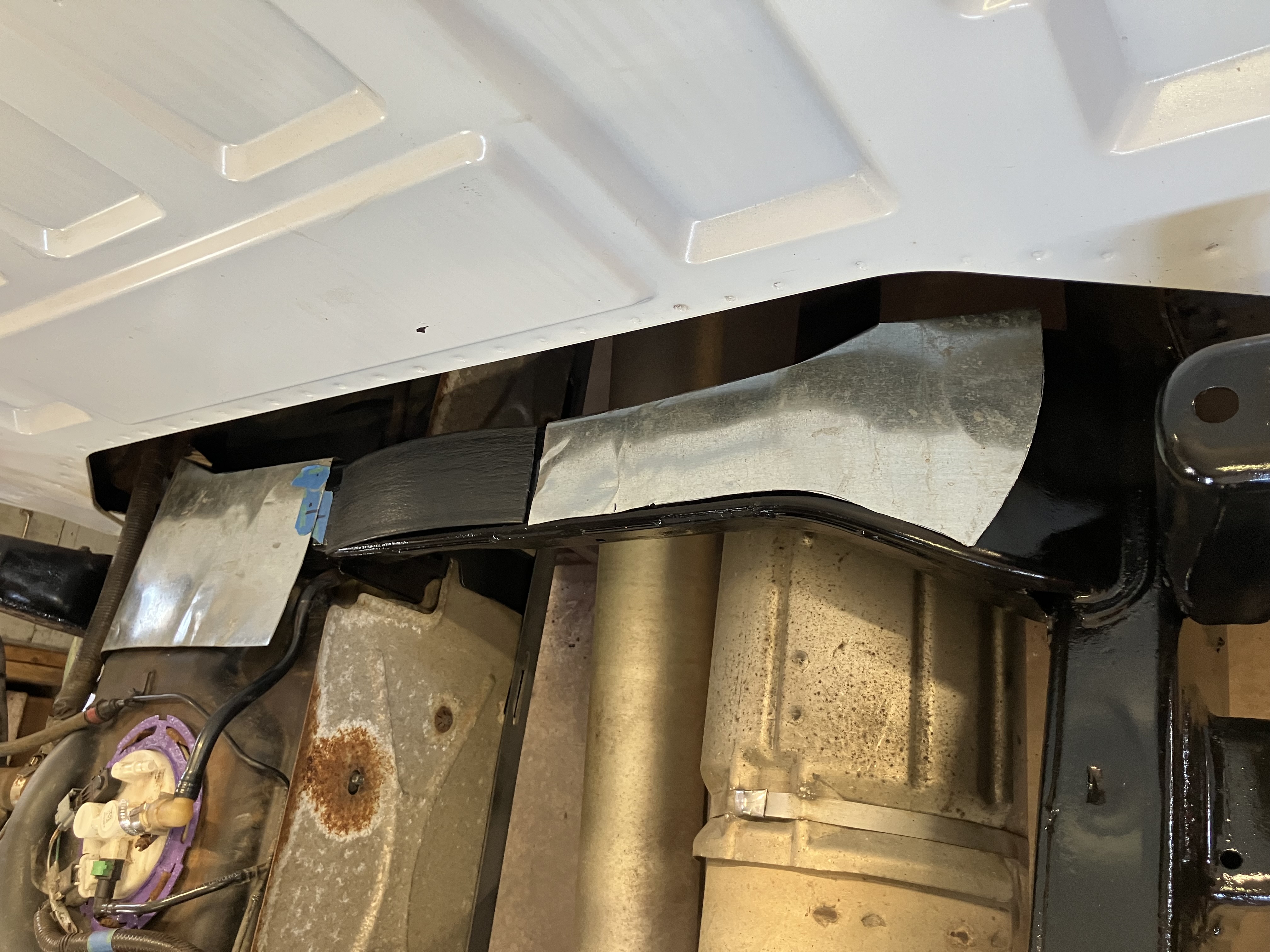 The fix involved removing the wiring harness behind the bed, the spare tire and the gas tank, buying a pre-fabricated cross bar ($65), cutting out the old one, cutting out the rusted spots, fabricating some patches and welding it all back in. the replacement had side plates which allowed me to cut the frame a little big to get the new bar in. I measured to ensure the bar would go back in the same place. This prefit kit had the right dimensions on the bar, but the side plate that was pre-welded was not perpendicular to the bar and caused clearance issue with the tank, the side plates were too big and had to be trimmed quite a bit, and the gas tank strap bracket was a bit crooked.