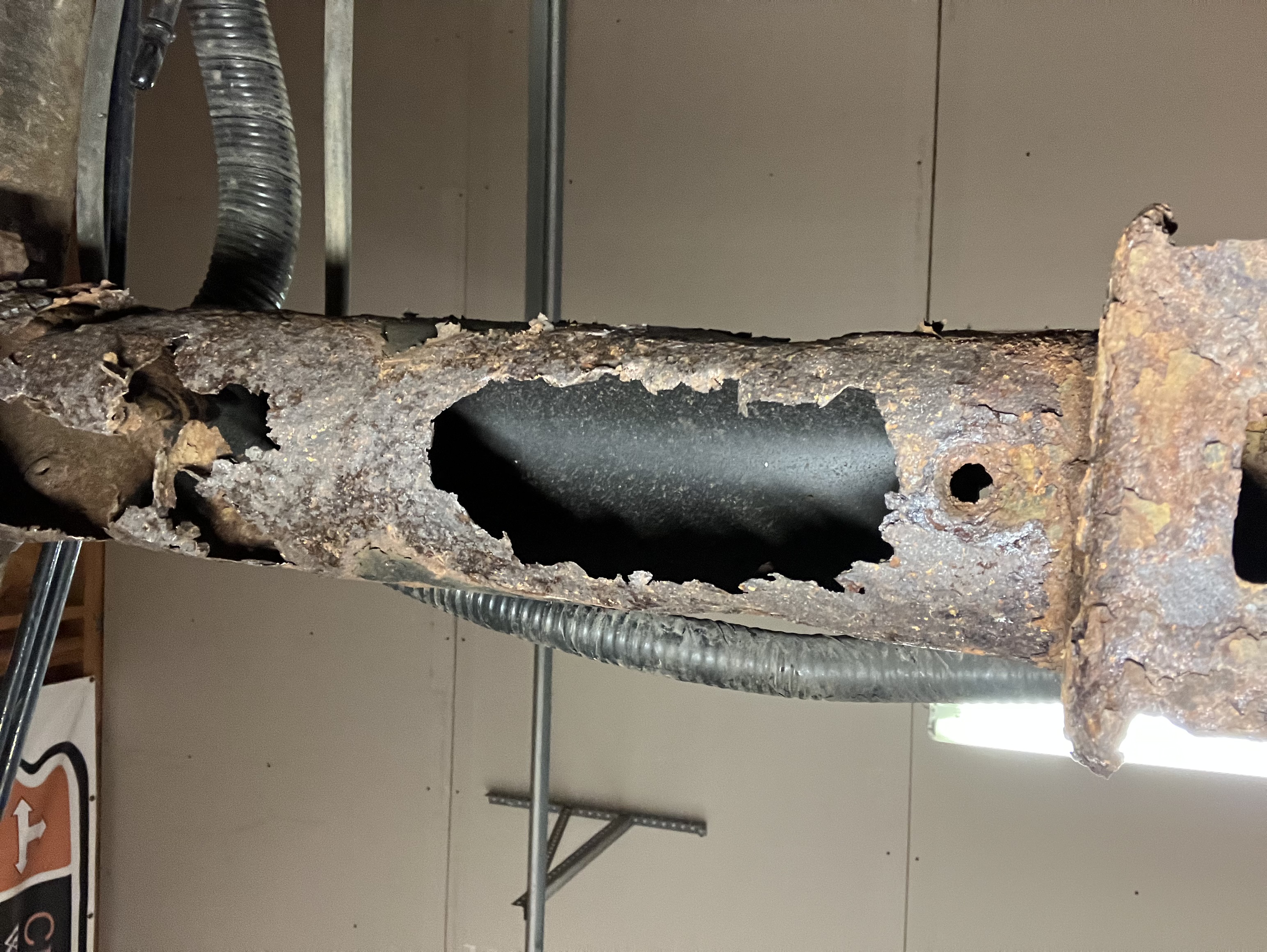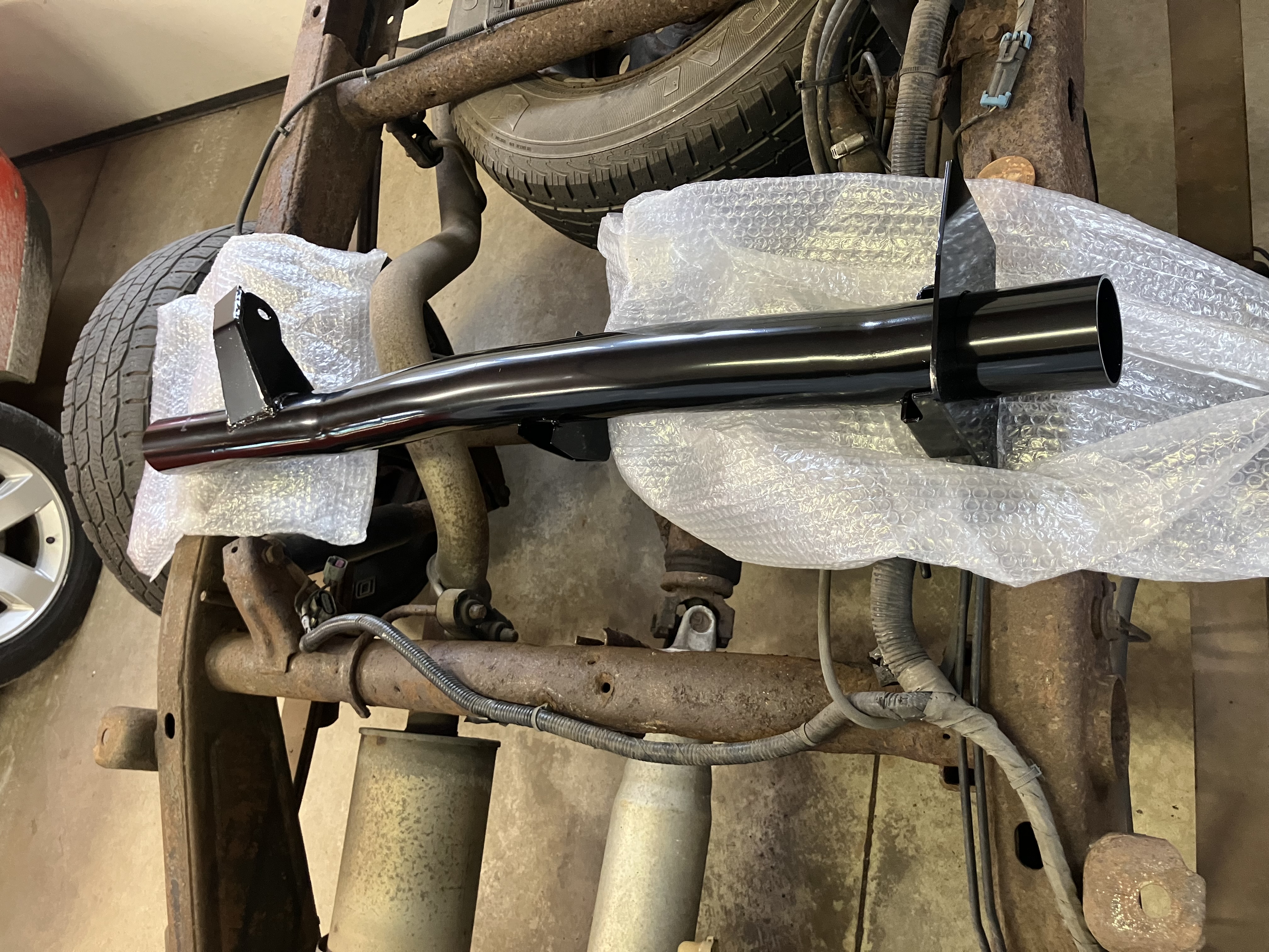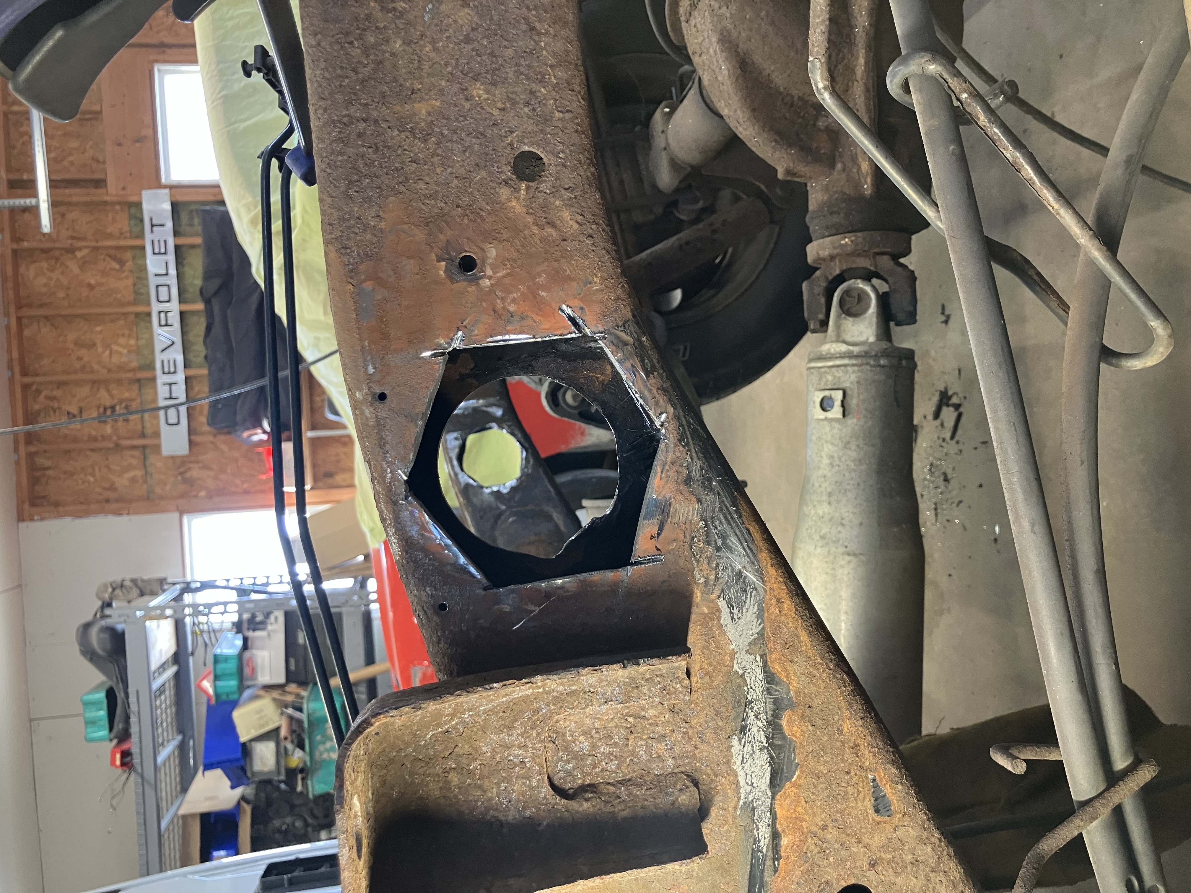The fix involved removing the wiring harness behind the bed, the spare tire and the gas tank, buying a pre-fabricated cross bar ($65), cutting out the old one, cutting out the rusted spots, fabricating some patches and welding it all back in. the replacement had side plates which allowed me to cut the frame a little big to get the new bar in. I measured to ensure the bar would go back in the same place. This prefit kit had the right dimensions on the bar, but the side plate that was pre-welded was not perpendicular to the bar and caused clearance issue with the tank, the side plates were too big and had to be trimmed quite a bit, and the gas tank strap bracket was a bit crooked.