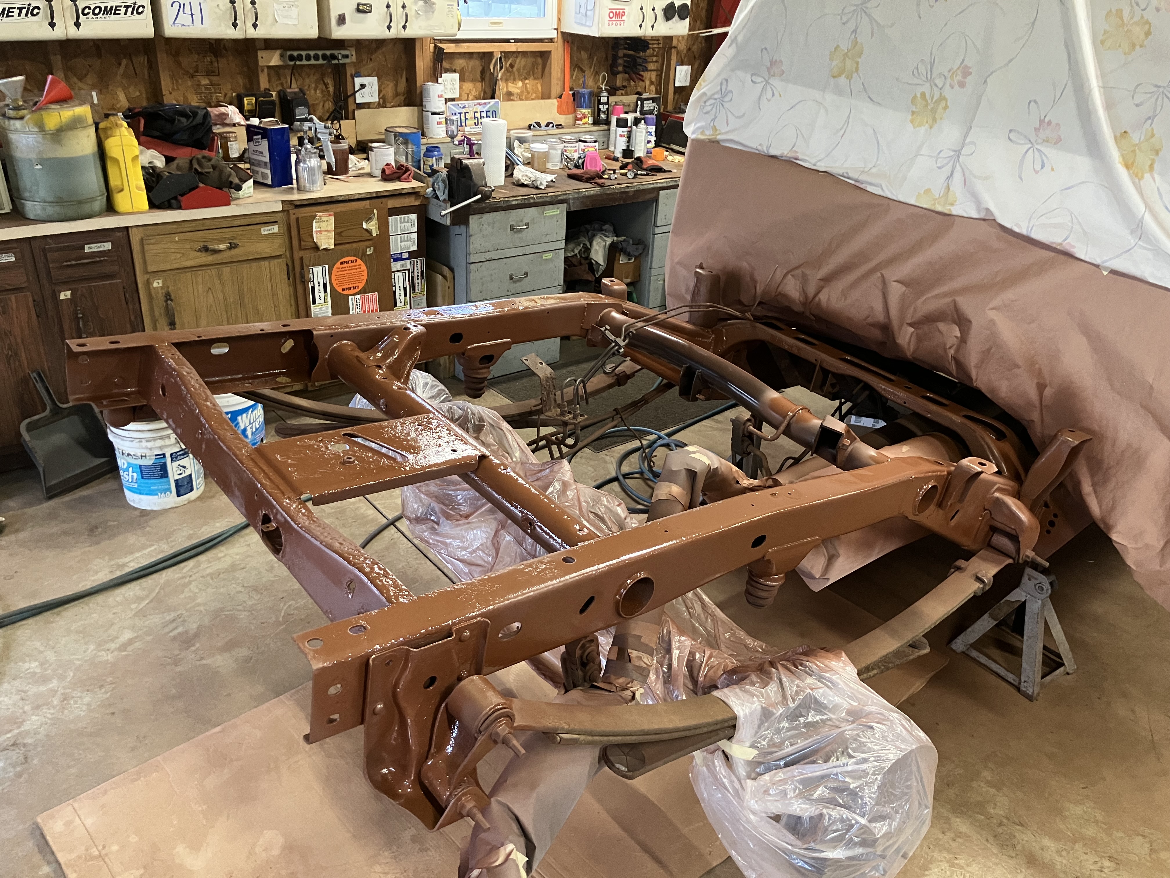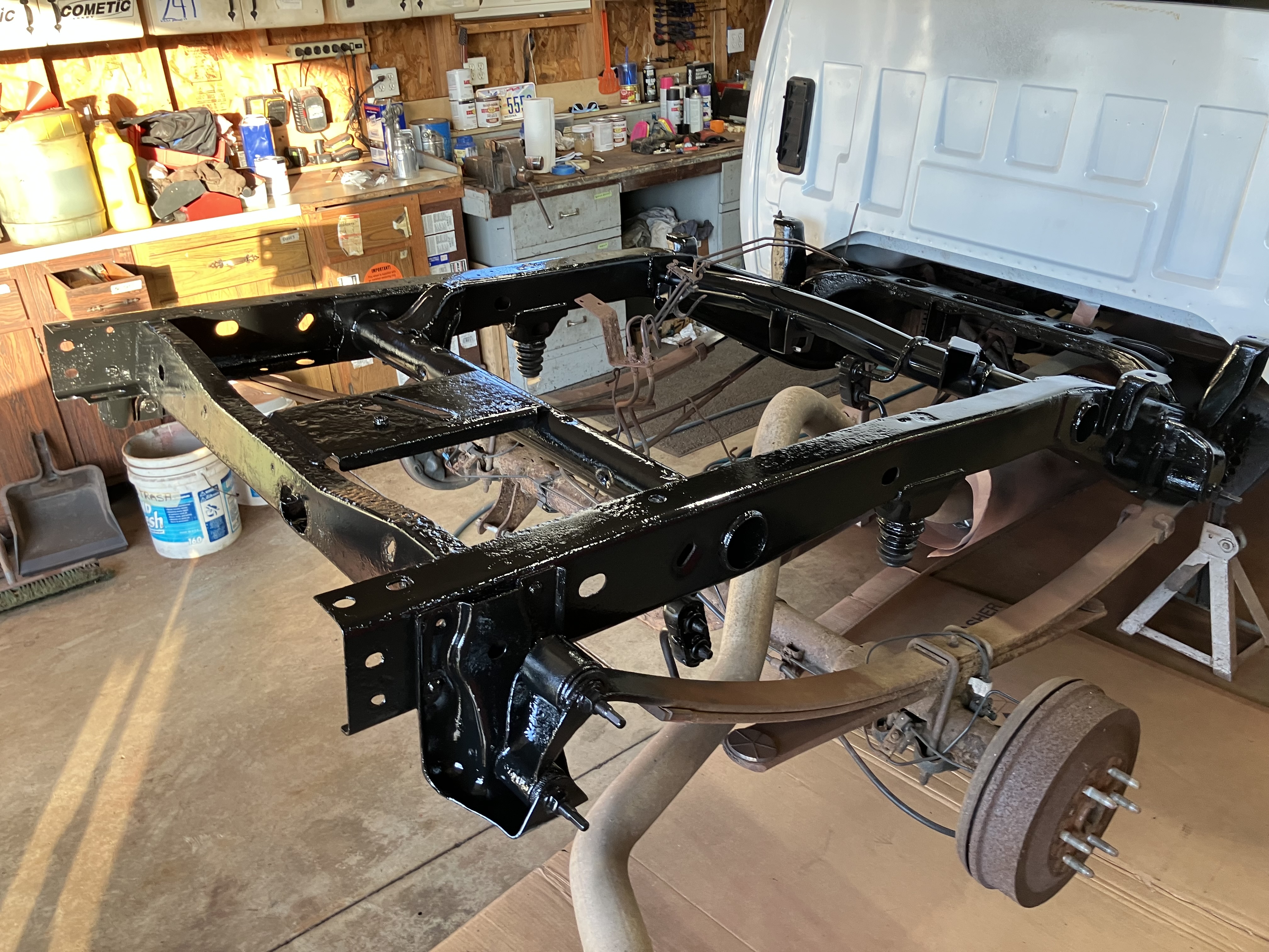 I had originally planned to use up random spray cans on the underside of the bed, and getting some spray can white to do inside of the bed. Kinda didn’t like that approach and decided to see if I could use the spray gun to apply Rustoleum. With the help of a YouTube video I learned you can do this, and to use acetone to cut the paint.