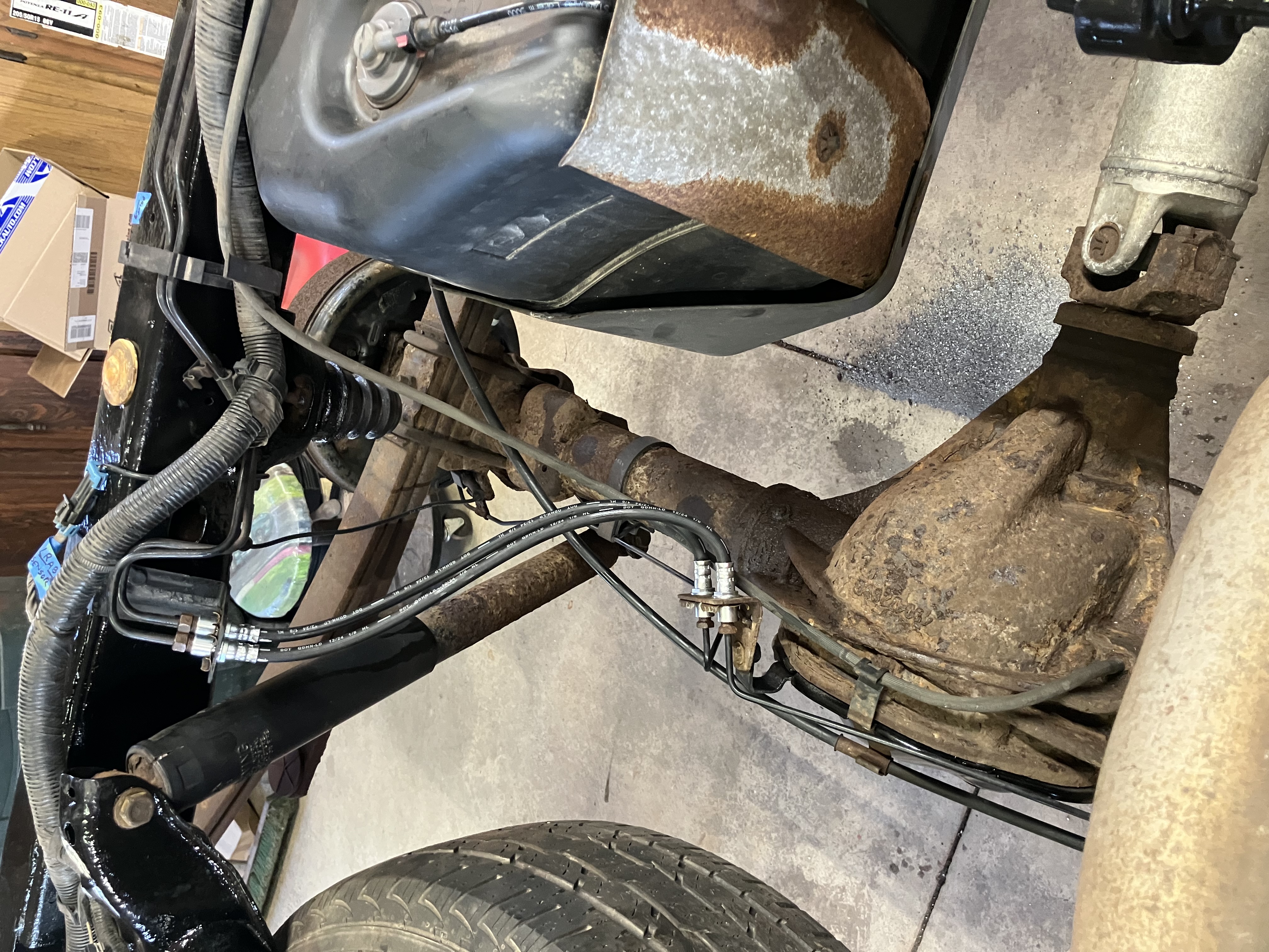 These are 15 years old and I’m thinking as a work truck the last thing I’d want is to blow out an old brake hose carrying a load and trying to stop, so I replaced them. Working on the rear brake hoses from the top was so much easier. All the steel brake lines are coated and look great. The flare nuts on the rear were a bit rusty on the outside but they turned freely on the lines. I also changed out the front brake hoses. The flare nuts on those were seized to the line but I could just spin the brake hose to remove the old and install the new.