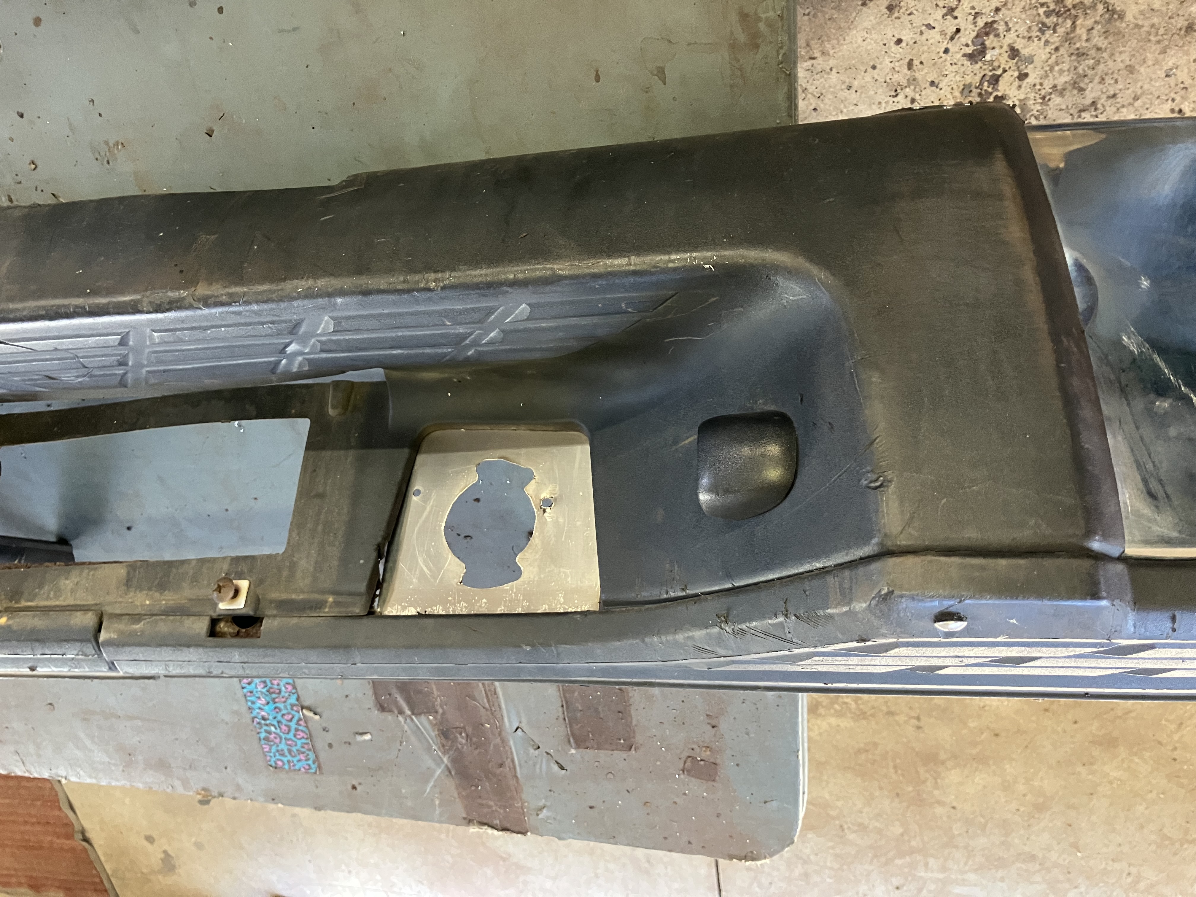 The bumper had been hit lightly, and the metal part that holds the trailer plug was rusted badly. There was enough I could make a template of the hole size and shape. I used that and some leftover stainless sheet to make a replacement. I also pounded out some of the dents in the bumper. Finally the plastic cover had a broken tab so I secured that with a stainless screw.