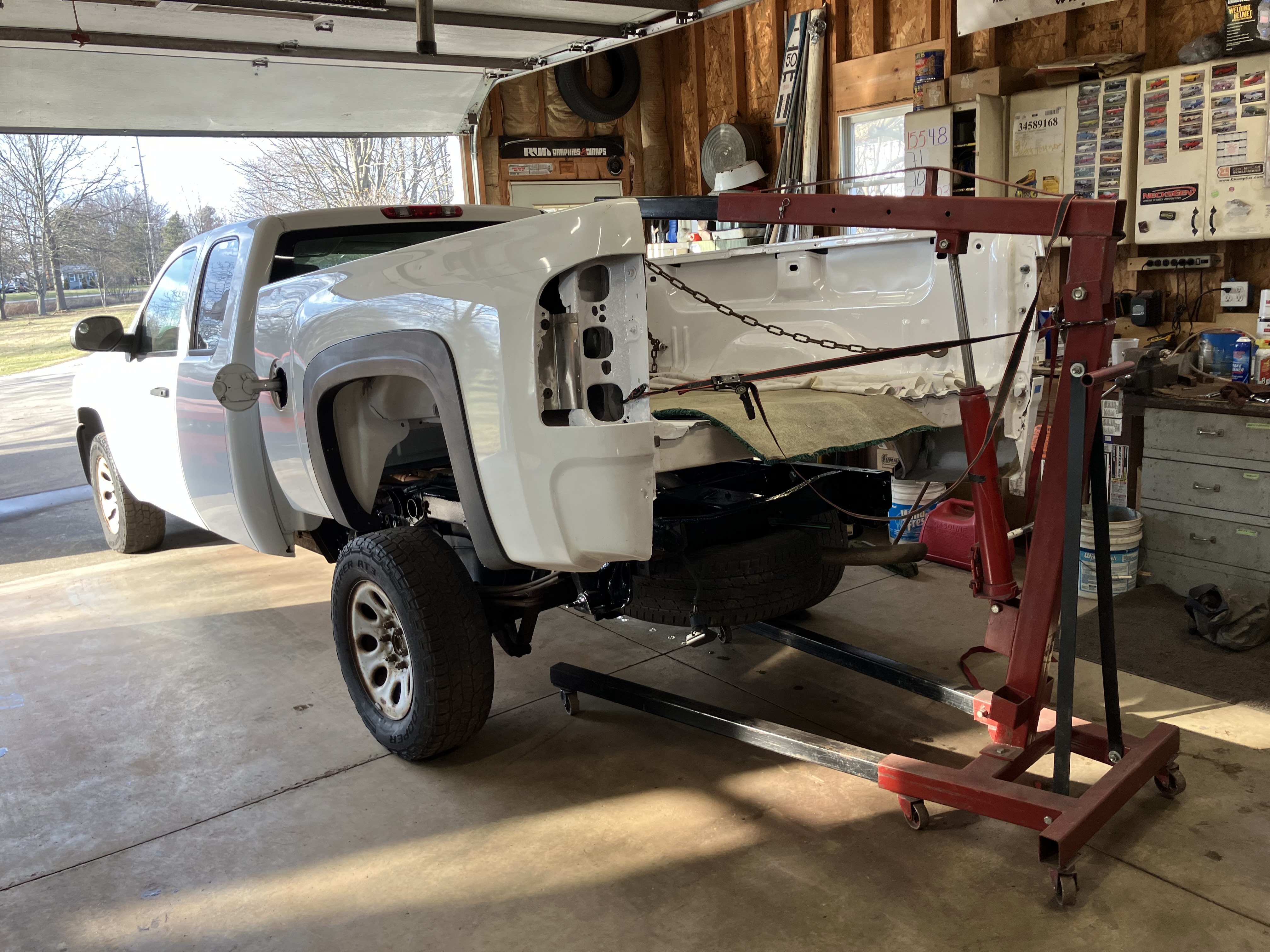 To fix this the bed had to come off. This was not a very complicated process. Disconnect the filler neck, remove tailgate, rear bumper, taillight wiring and 8 bolts and its ready to come off. With a little help from the engine hoist it was off. This made working on the bed much easier. I stood it on the cab side or laid it upside down depending on what was best for the task.