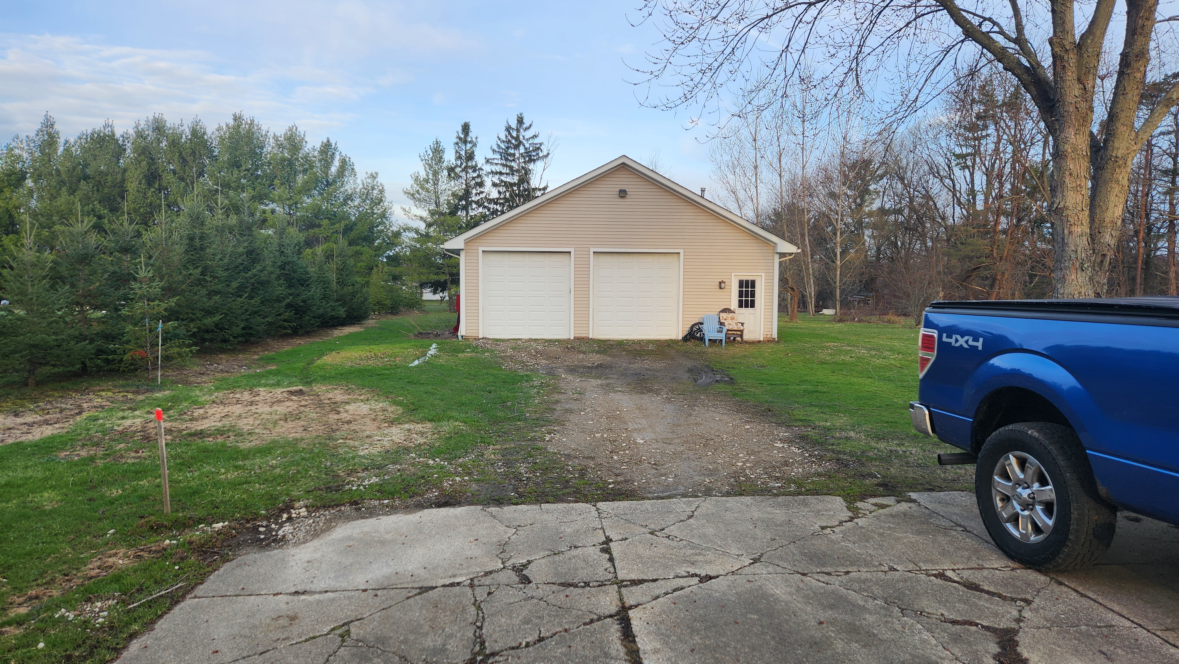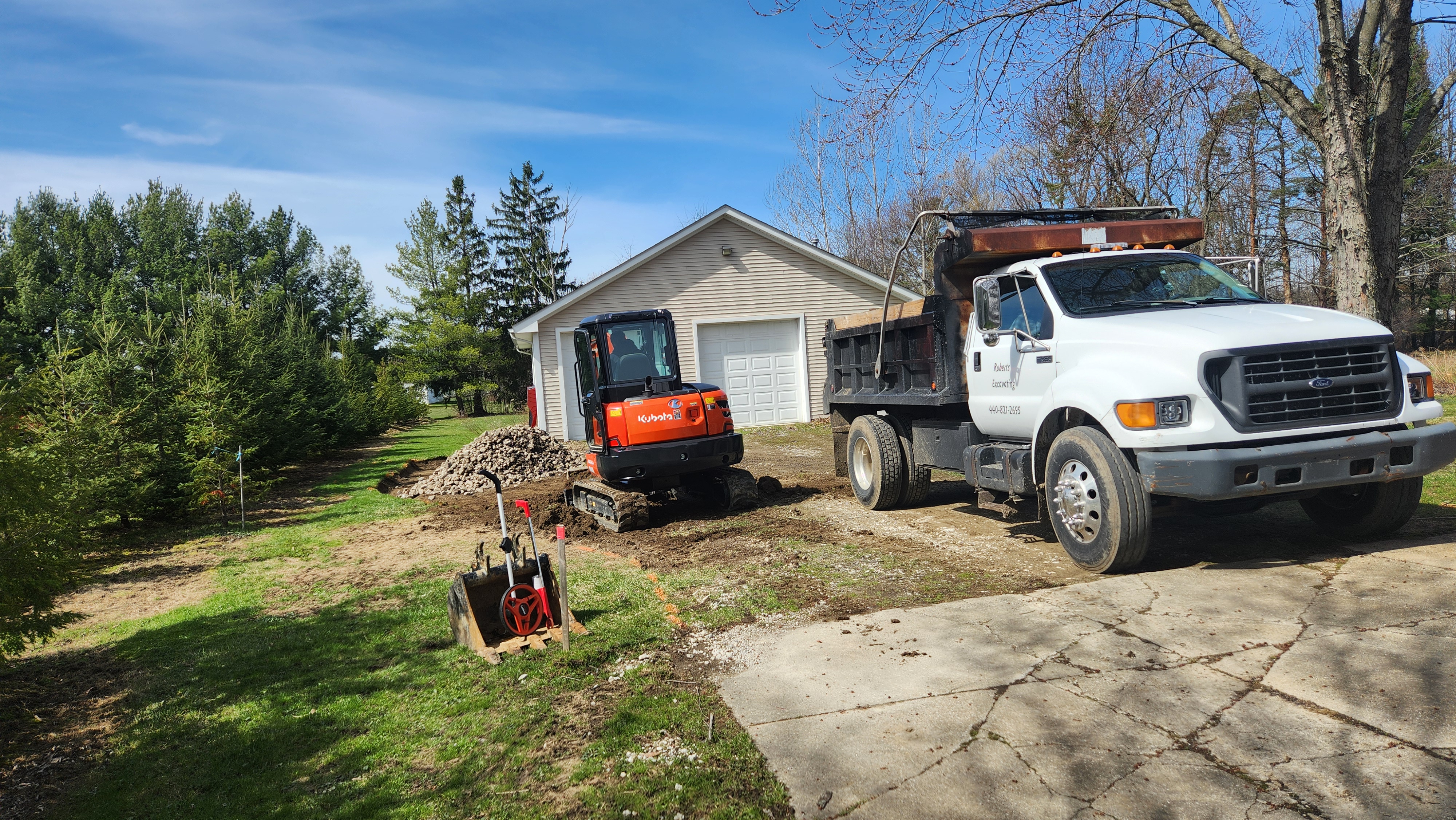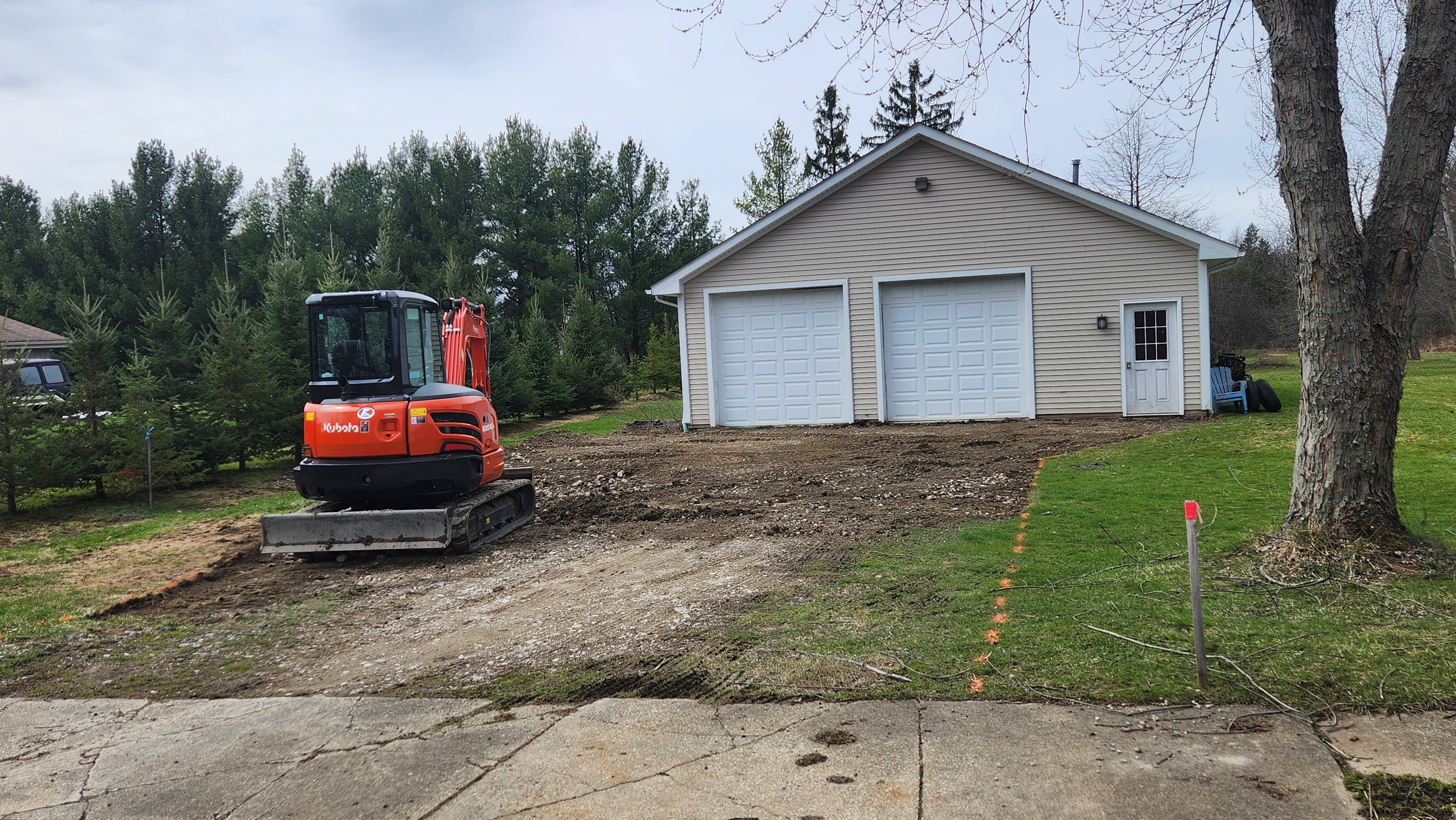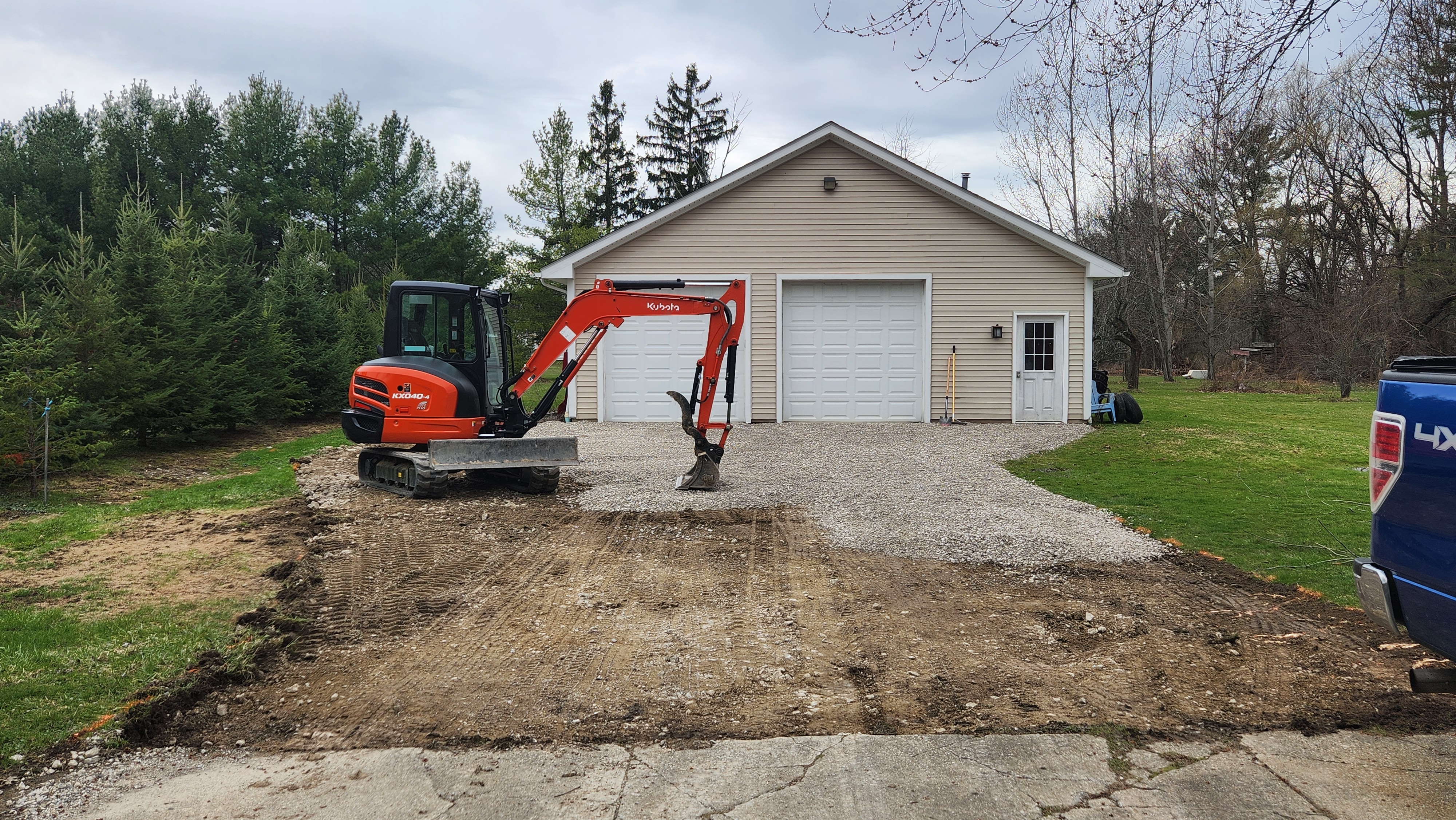 More maintenance for Tiresmoke Central. The gravel leading from the driveway to the garage has long since disappeared, and I can't be getting mud on my tires just driving in and out of the garage. I hired a local guy, Robert's Excavating, to dig out, expand for trailer parking, and put down new gravel.