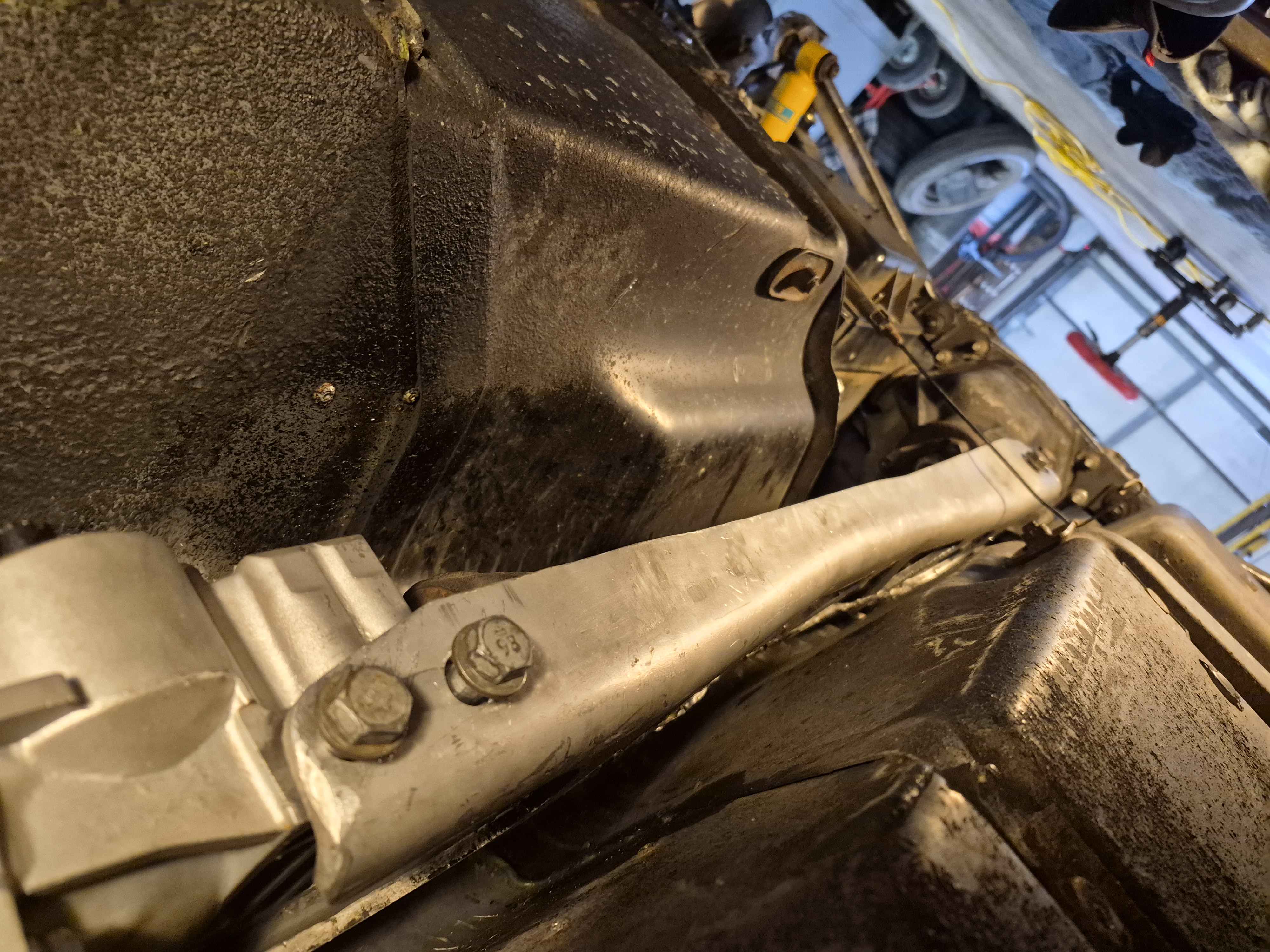The beam is now resting in the car, with loose bolts. Next week I should be able to start tightening bolts for good hopefully, and clean up my large mess in the garage.