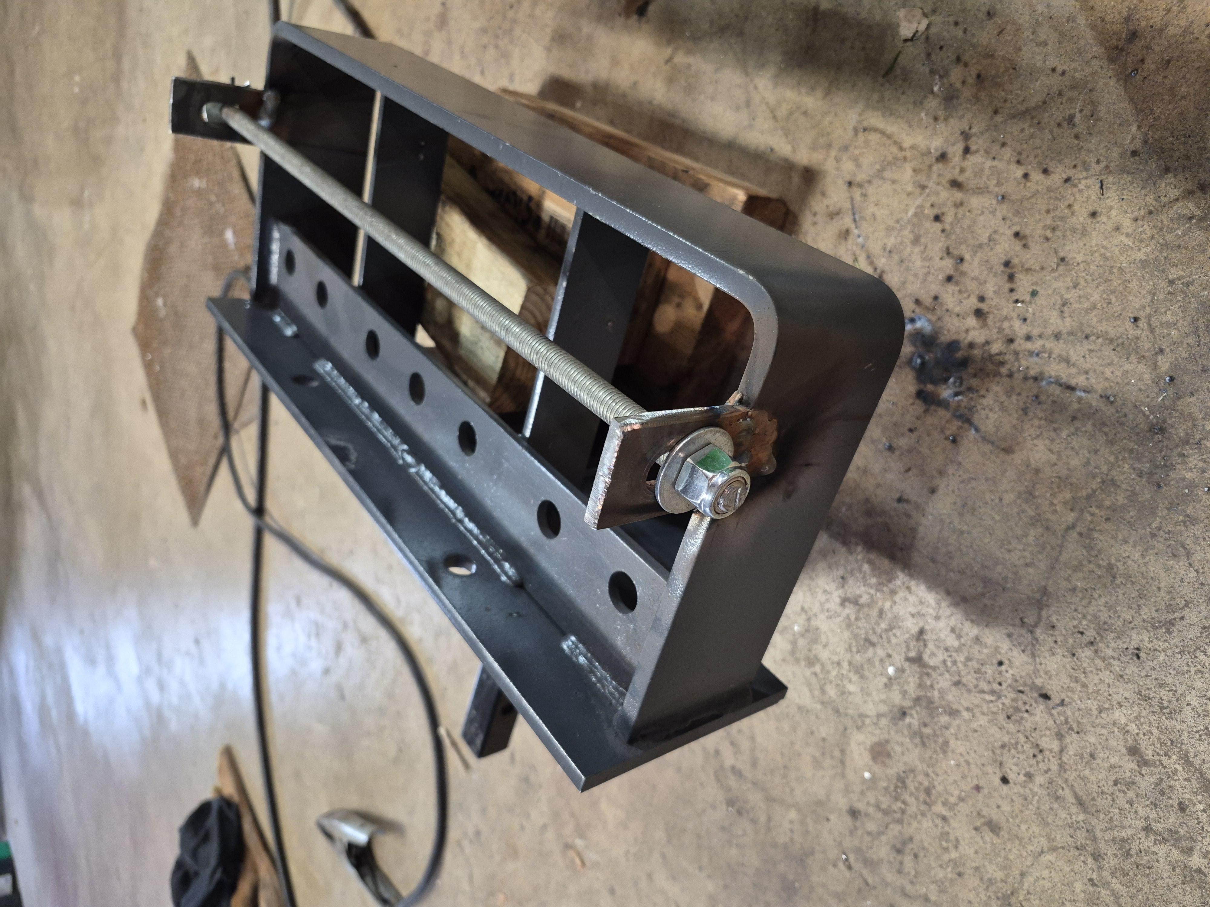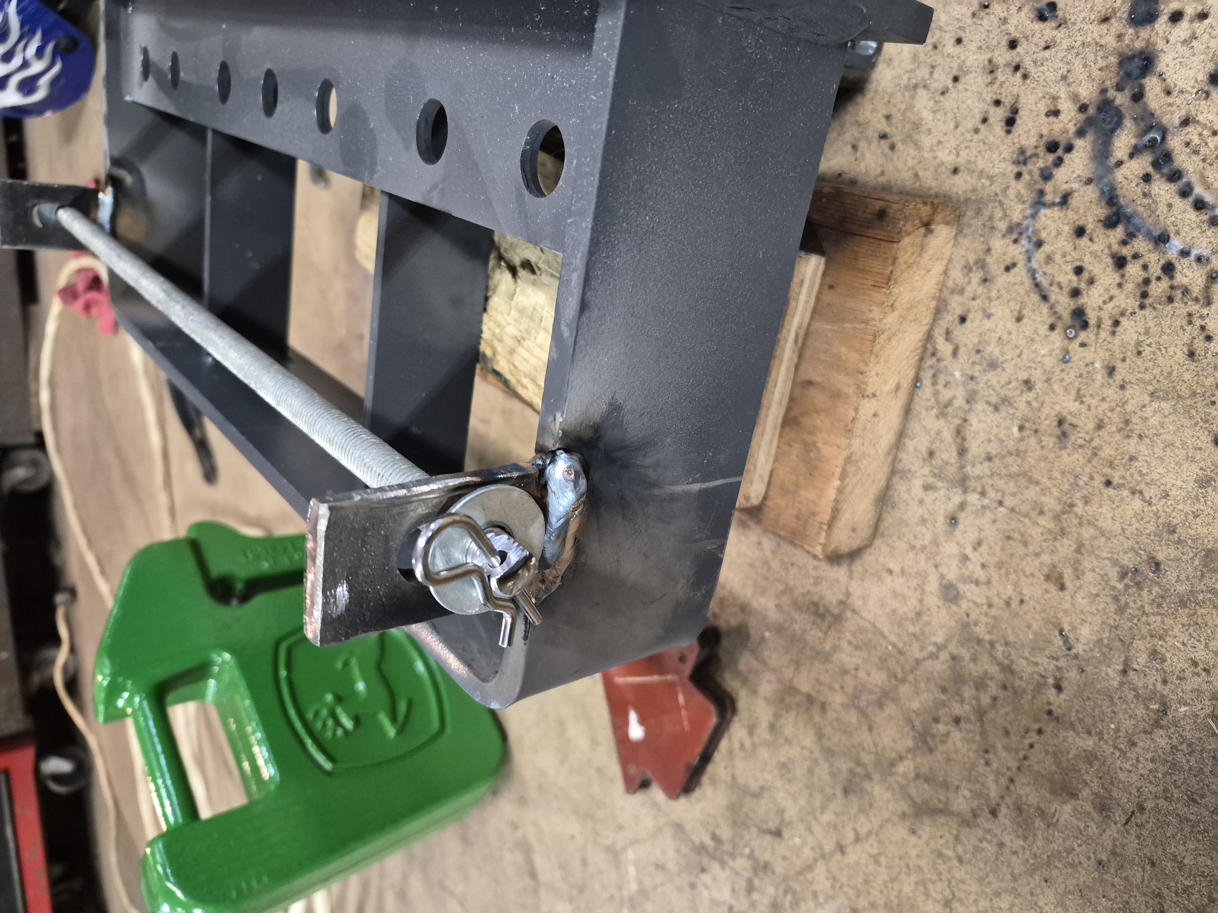 We took the weight bracket off the shelf so we could make a securing rod to keep the weights in place over rough terrain. Since it was originally for a garden tractor, this was not a real concern. Using some old piece of steel off the shelf and a piece of threaded rod, we did some cutting, welding, and drilling and it looks like it belongs there. We just need to paint it and it will be done.