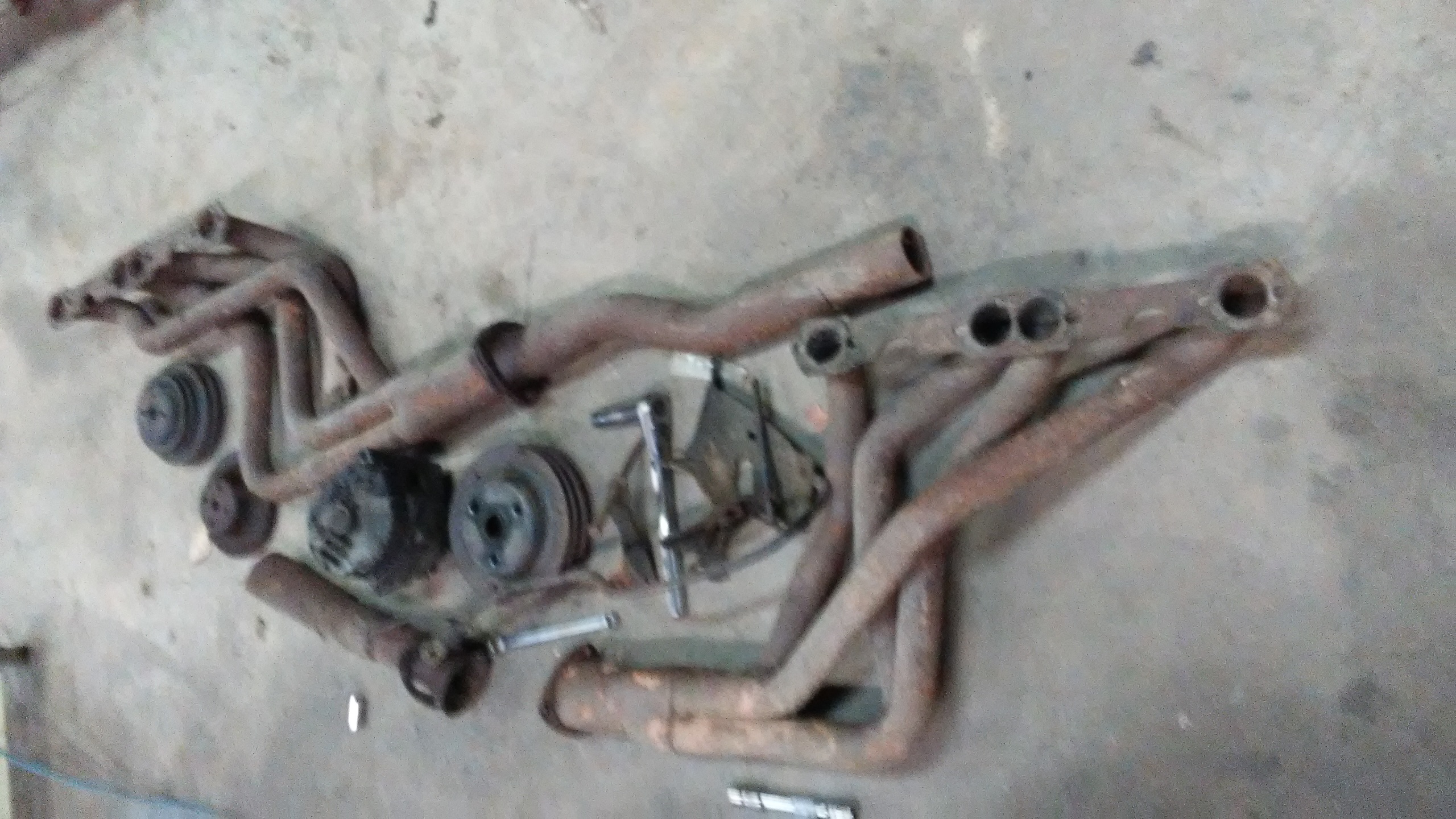 Les, a member of the Piedmont Classic Chevy Club (PCCC) responded to my parts wanted email with an offer to donate parts to our project. WXO made a trip to his place today (my wife is sick and I drove her to a doc appt this AM) and brought back perhaps everything we still needed. Alternator, alt brackets, crank pulley, 2 water pump pulleys, headers with stubs attached, and glass pack mufflers.
