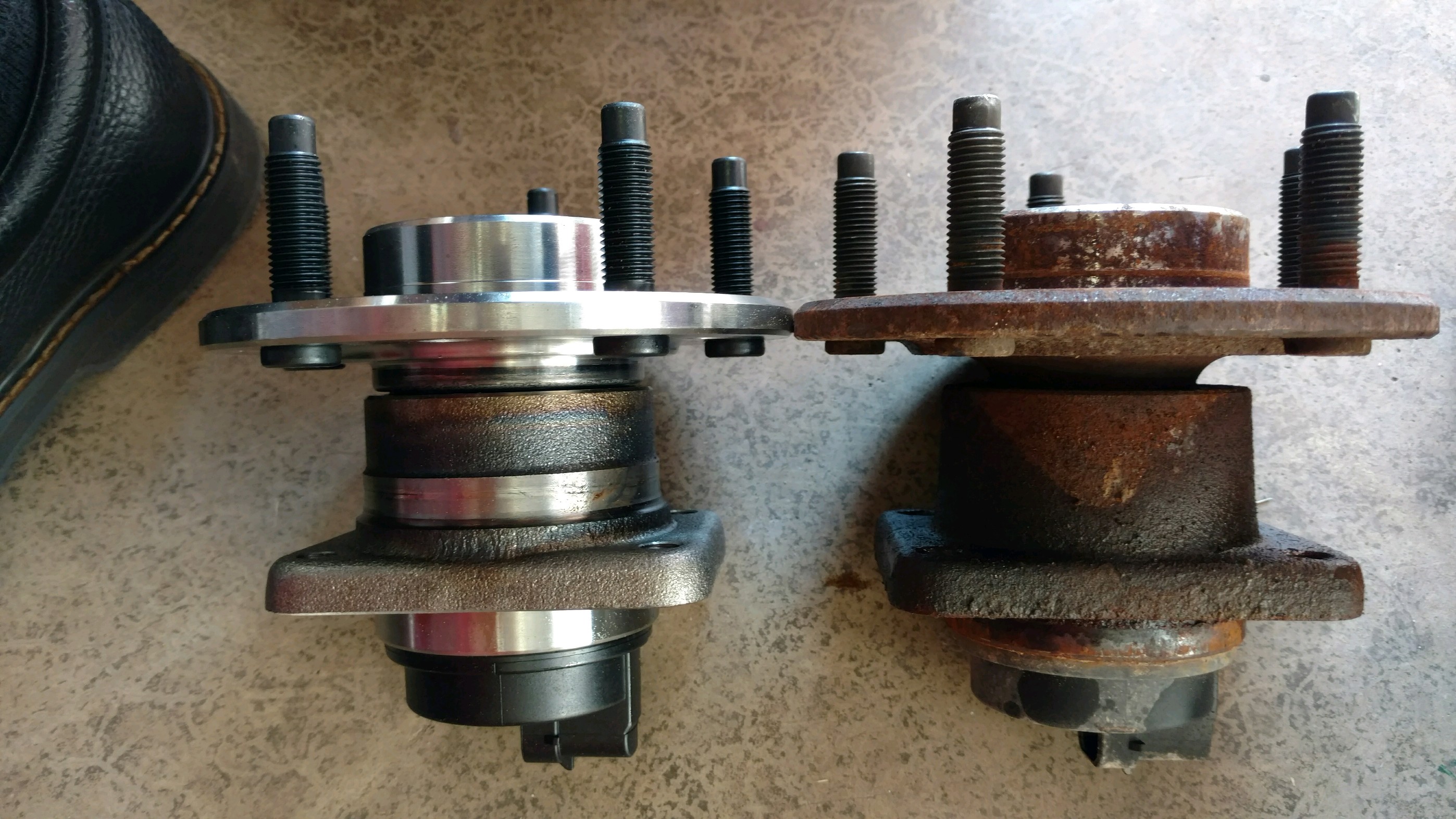 Yesterday I installed the new Moog front wheel bearing / hub assemblies on both sides. The previous owner claimed to have installed new ones and made it seem like it was done recently. I'm sure this car sat outside, and being low to the ground doesn't help rust issues, but these things looked terrible. They were also in worse shape than I thought after inspecting them once removed. They would spin almost freely and I feel the slop wiggle in my hands. After putting the AutoZone version next to the Moog, there's a pretty noticeable difference in the too, and the Moog is even a little heavier. I cleaned up all the rust on the bolts and mounting area, slapped some never-seize on them (in case I have to do this again), and put it all back together. It wasn't a terrible job and each side took about 45 minutes because of the sanding and clean up time. I believe if I was in a hurry and didn't have any rust clean up, that I could do this job in about 20 minutes.
