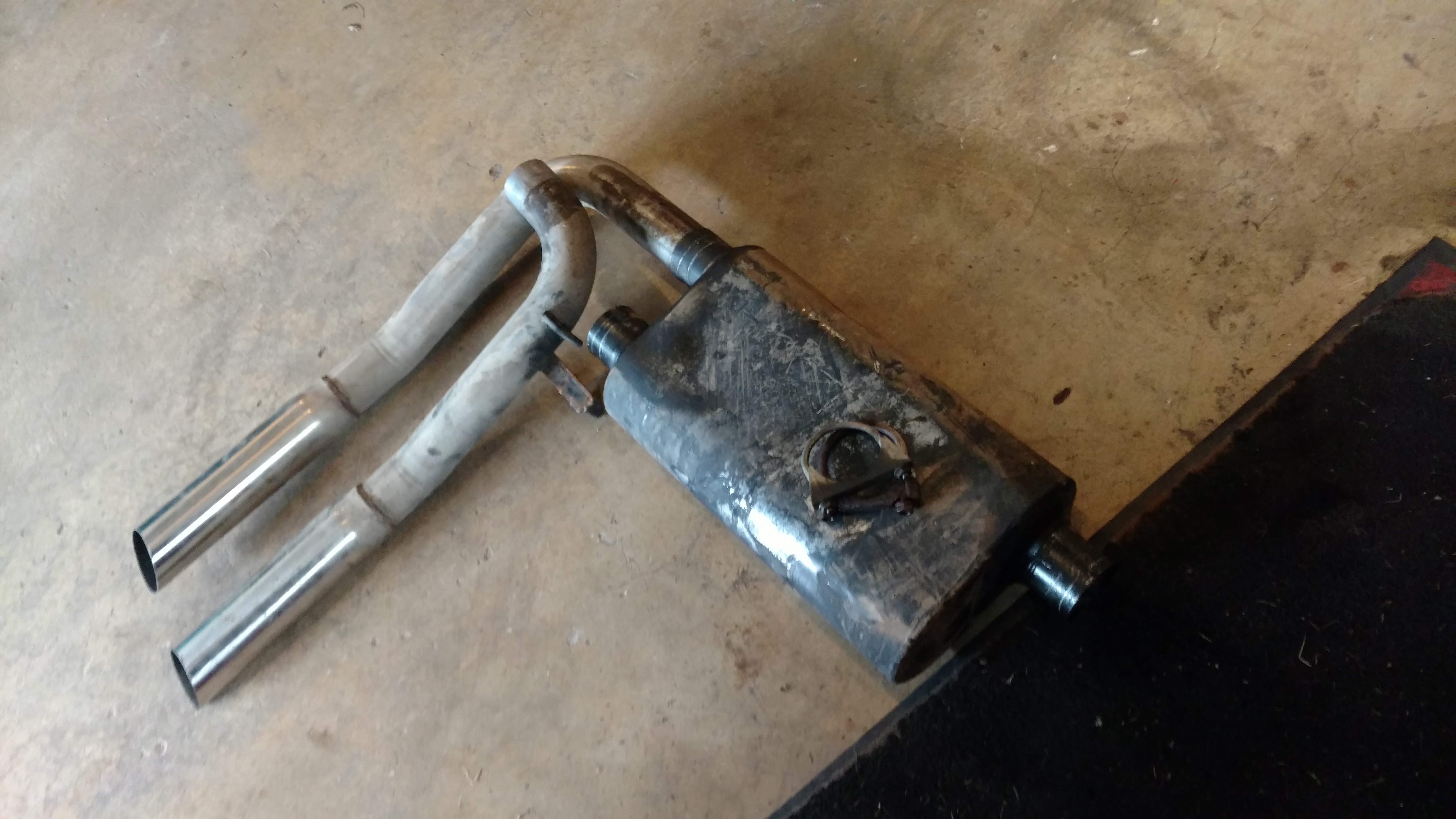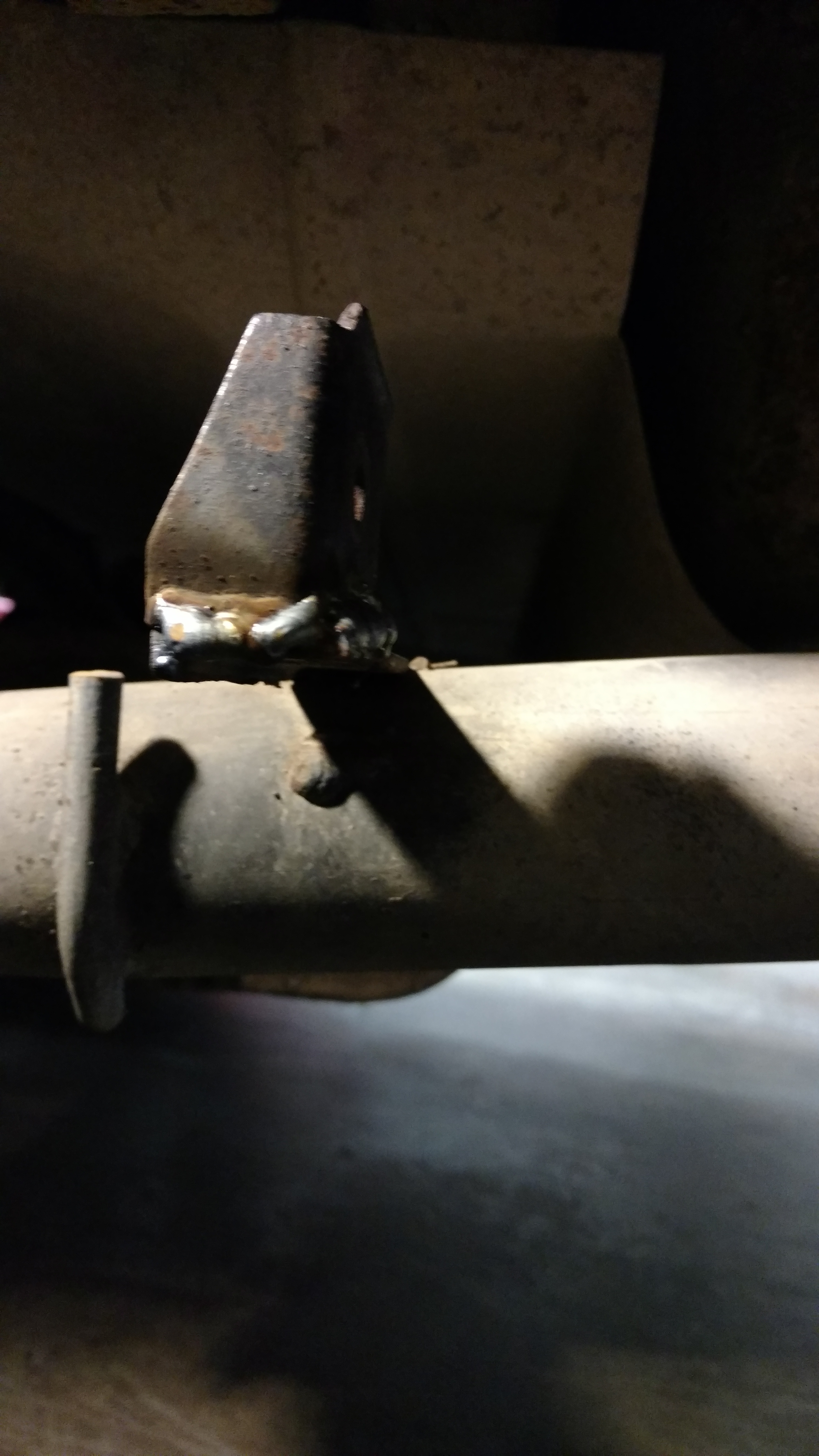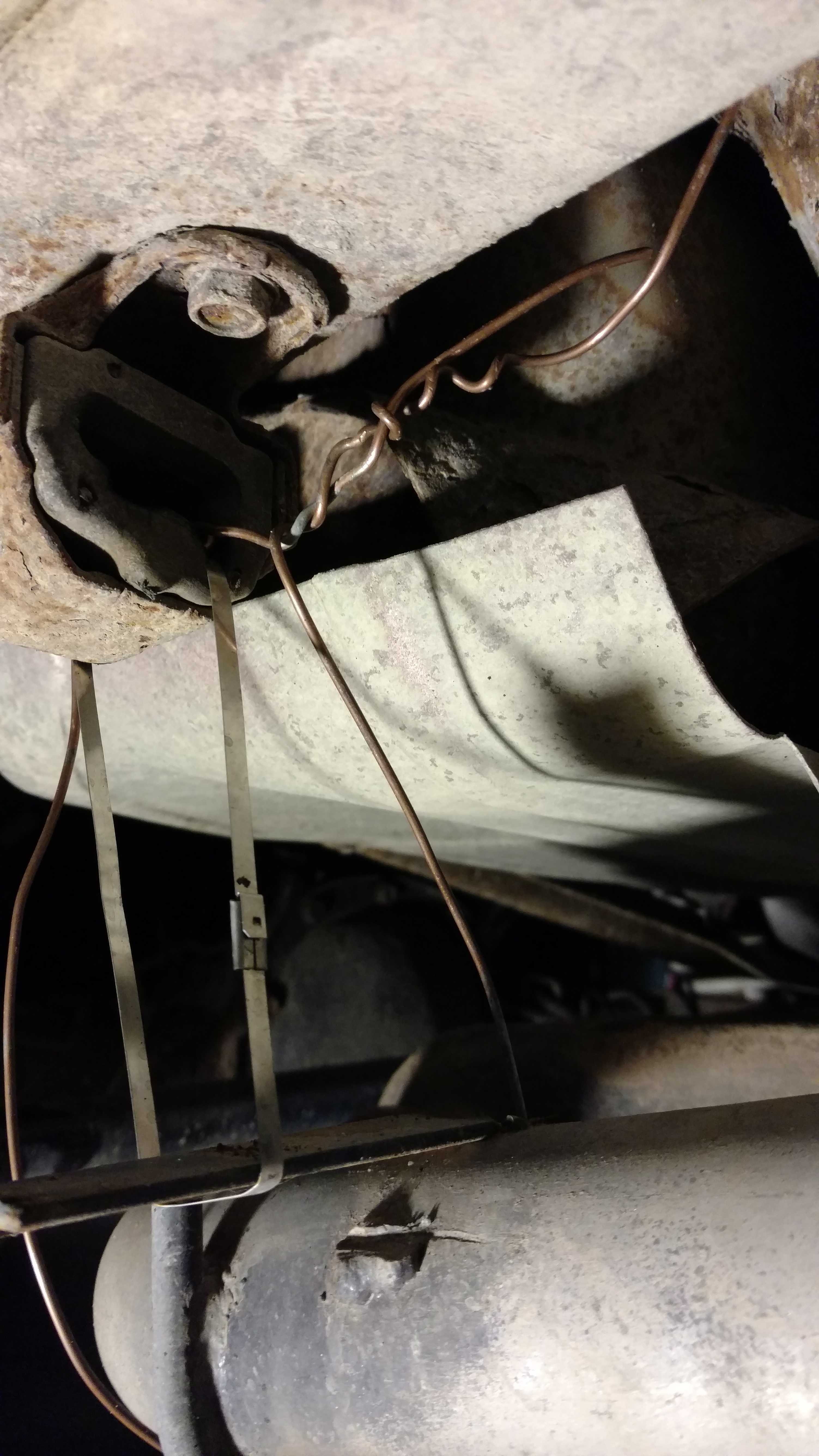 Just by chance while driving to the track day yesterday, the left rear exhaust hanger broke. Mostmint had a couple steel zip ties that got me through the day. Tonight I broke out the welder for the first time in years and got it put back together.