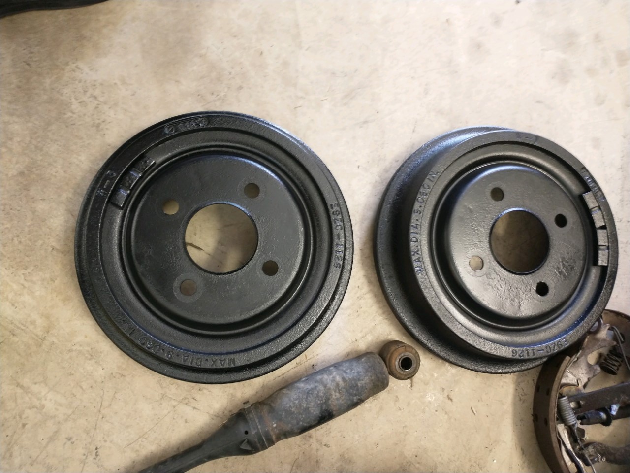 Saturday I took some time to get a few little mini projects that needed to get done before the rearend goes back in. I replaced the rear vertical shocks, which requires ALL the lining in the trunk to be removed. Since it's a convertible, it's a little tight, but not terrible. The shocks that were on the car appear to be the original Motorcraft pieces. Then I painted the old rear drums a nice shade of flat black instead of rust. They are otherwise in amazing shape.