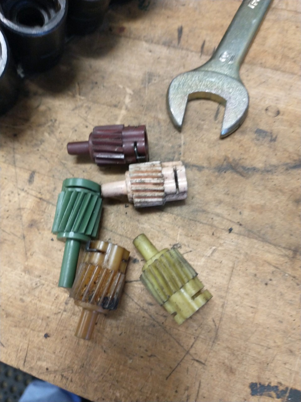 After the rearend swap, the speedo was obviously off by some margin. I had a pile of old Ford speedo gears I got from Kevin a long time ago for the TubStang, and just never gave them back since he switched to a GM trans. Research said I needed an 18 or 19 tooth gear depending on the drive gear. Well, I couldn't figure out what that was from just looking at it, so I pulled the gear that was in it out and saw it was a 16. I figured a 17 tooth gear would be good for the 3.08 gear that came in these cars, and the 18 (the tan one at the bottom of the pic) would go for the 3.27 gear I used. My figuring was right. Now I'm showing 60mph when I'm doing 57-58 according to my phone and it seems to get more accurate with speed.