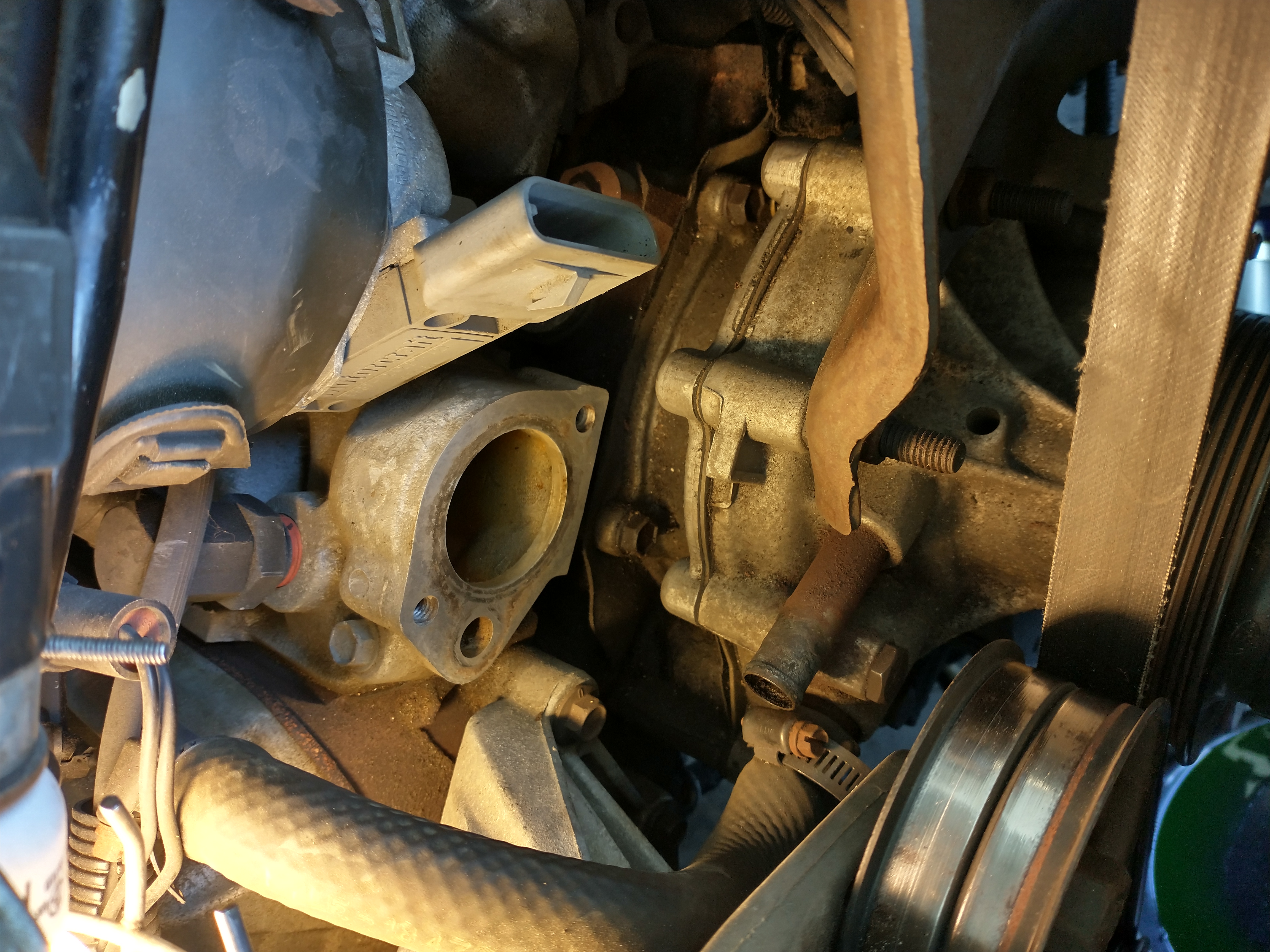 This week I picked at the cooling system. I replaced the serpentine belt, the upper and lower radiator hoses, the coolant, the thermostat with a 160deg one, and the small bypass hose from the thermostat housing to the water pump. No major surprises here. The thermostat housing was a little bit of a pain to install while trying to keep the thermostat in place, but otherwise not too bad.