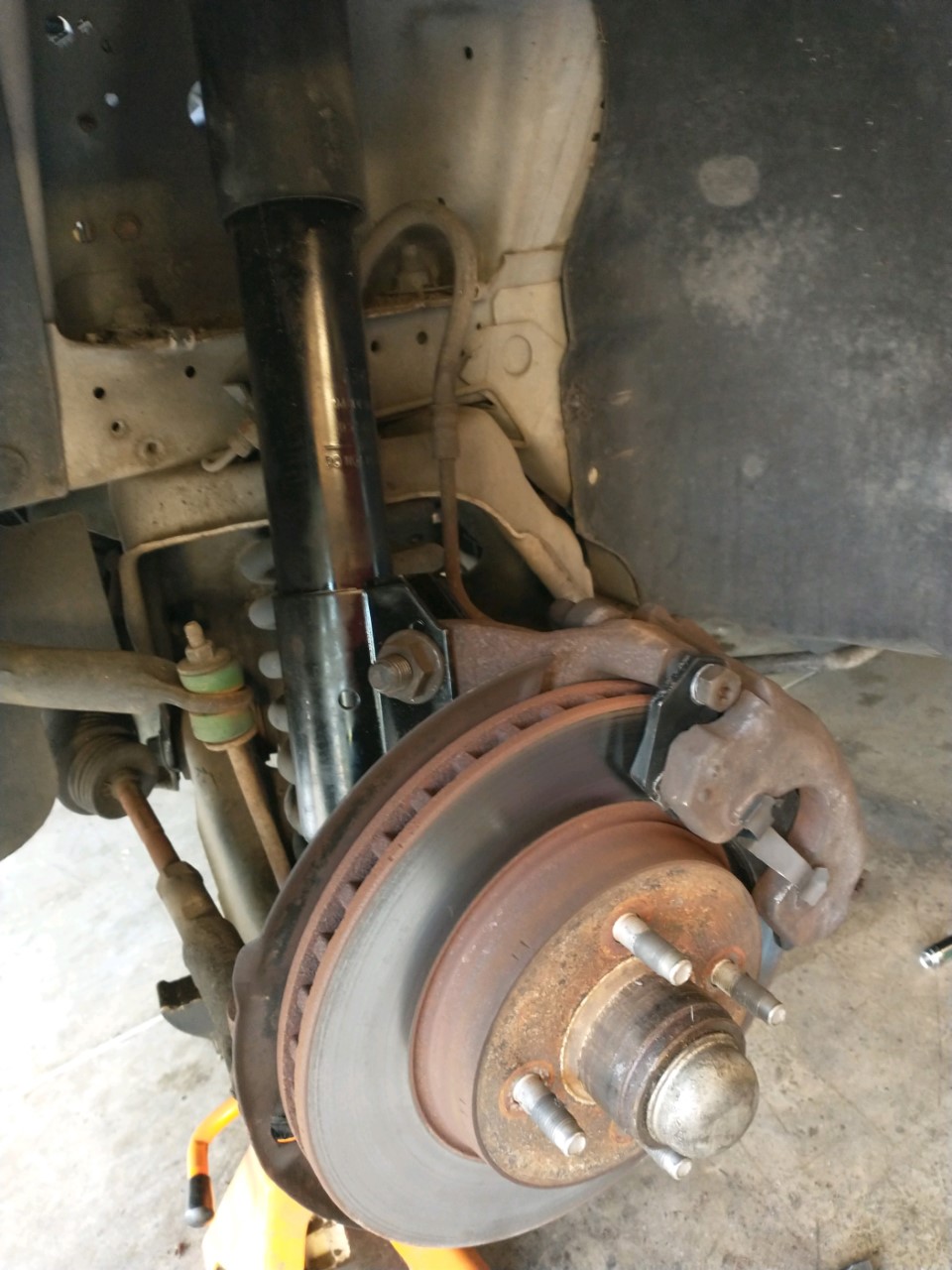 Then on to the new PowerStop front brake pads. As I was taking the caliper loose, I realized I should probably consider doing the front struts at the same time since I have to pull the calipers off to do the struts anyway. The struts proved to be pretty easy with no springs to compress. Sad thing is that the "new" struts I bought off ebay last December were really from 2004 and not new as advertised. But it was too late to return them and they were still in the box and compressed so I figured what the heck, it's an easy job if I need to replace them. The brake pads were a pretty easy job too, but one of the big outside pads had a small, half a dime piece broke off at the end and about 1/8" deep. They came this way new from the factory. Again, given the nature of the car and what I plan to do with it, it's not going to affect much IMO, so I put it on.