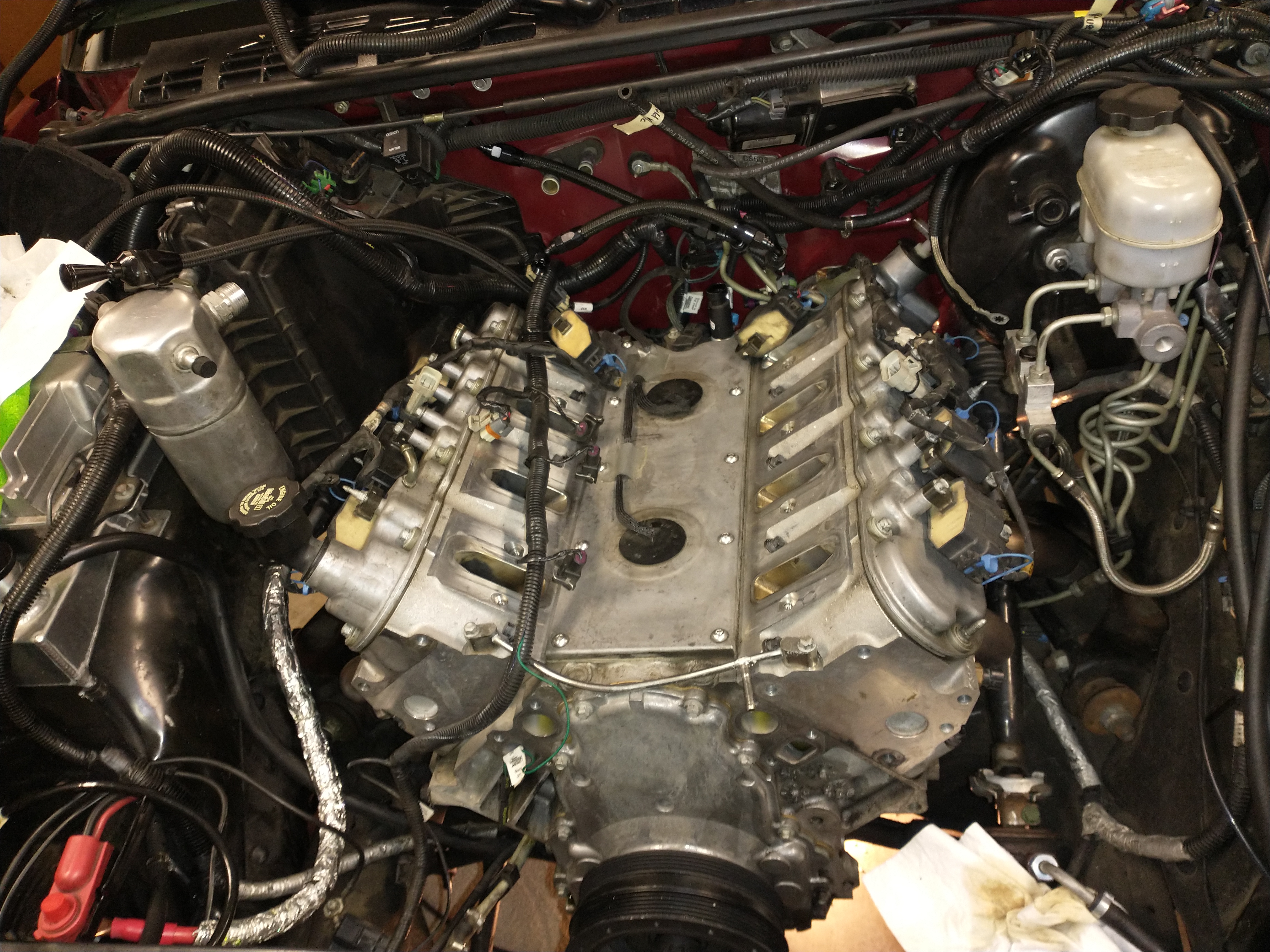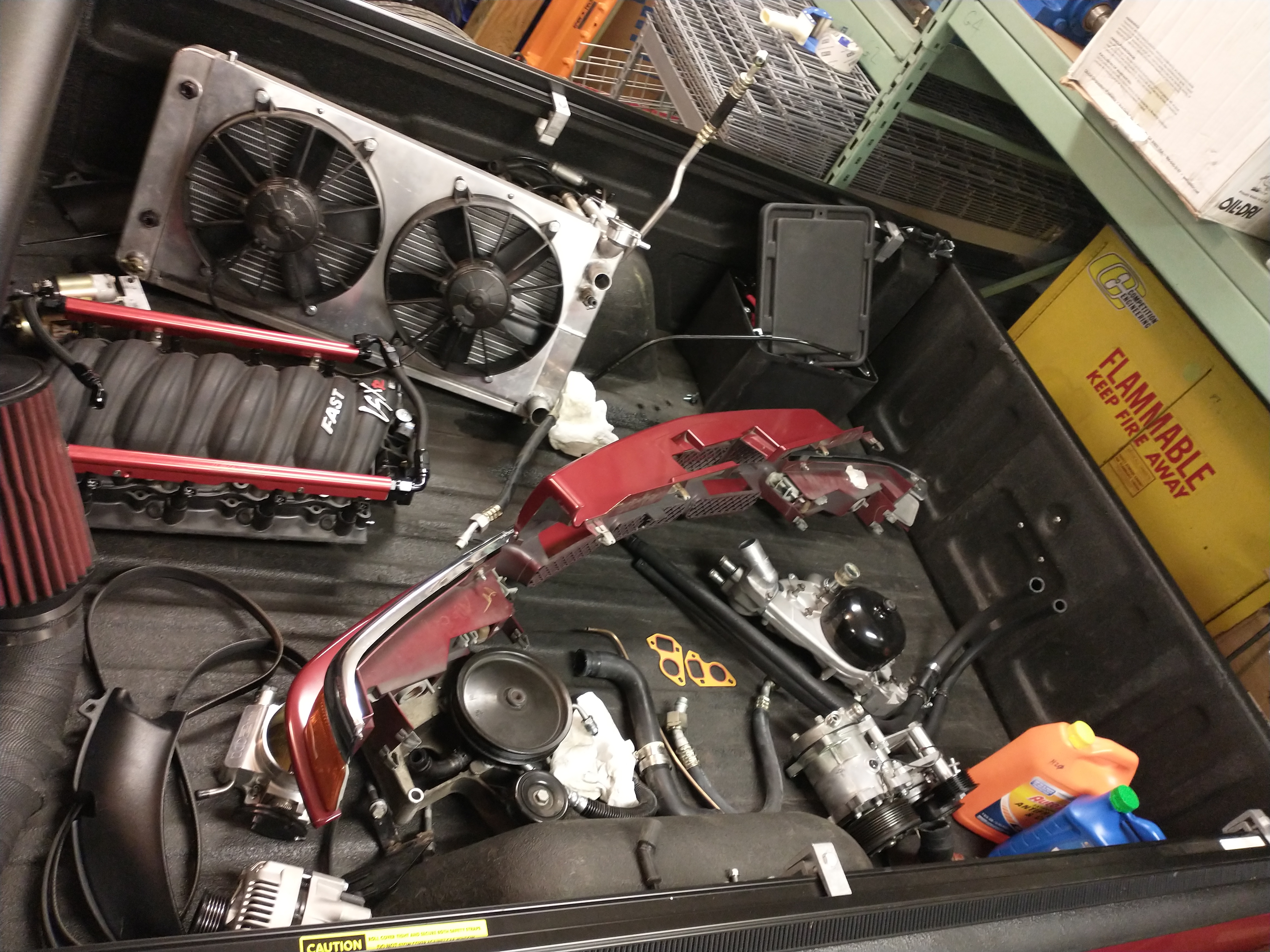 Today I was a little burned out from working, so I decided to heat up the garage and start the engine removal process. Wednesday I ordered an engine cradle for my LS transportation purposes. I got one without wheels so it would ride better in the back of my truck. I have a forklift if I need to move it. I put that together first, then moved more inventory out of my way, and began tearing all the front accessories off. It's a process, so I took my time and got all that done. Tomorrow I'm going to get the engine hoist from 32V's place and keep picking at it. The radiator is next, then probably most of the engine harness and lots of vacuum and vent lines. I don't expect to get underneath it until maybe Sunday.