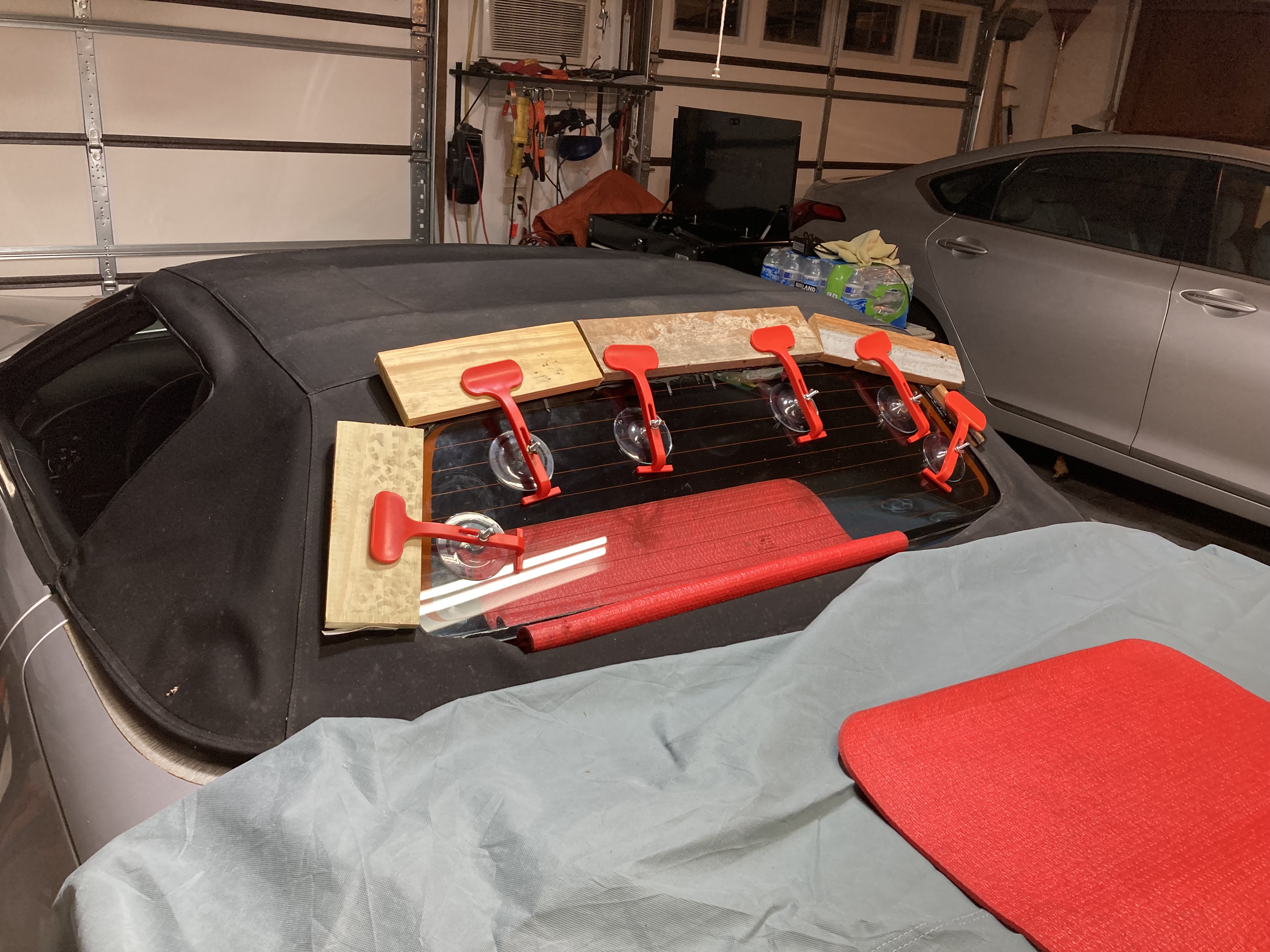 Two things. The convertible back window reattachment came out quite well. It looks like a solid installation and should keep the water out. I believe it's the original 25 year old roof and this will keep it going for a few more years. I still have a few details to finish, but I'm pleased with it so far.