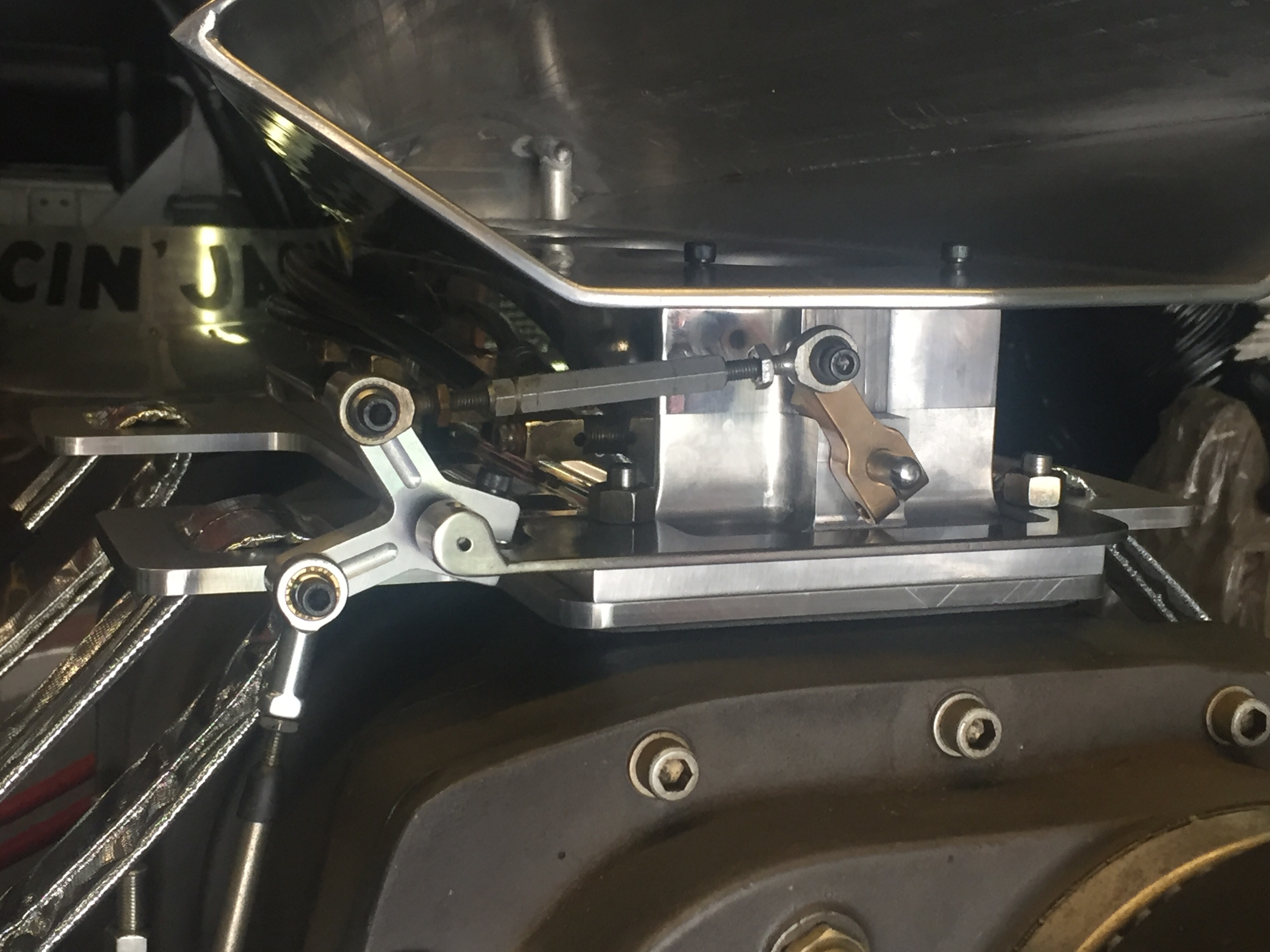 Worked on the linkage...the bracket is Stainless, the bell crank is aluminum fully polished now). The bellcrank rides on bronze bearings for the utmost reaction times! Ha ha ha