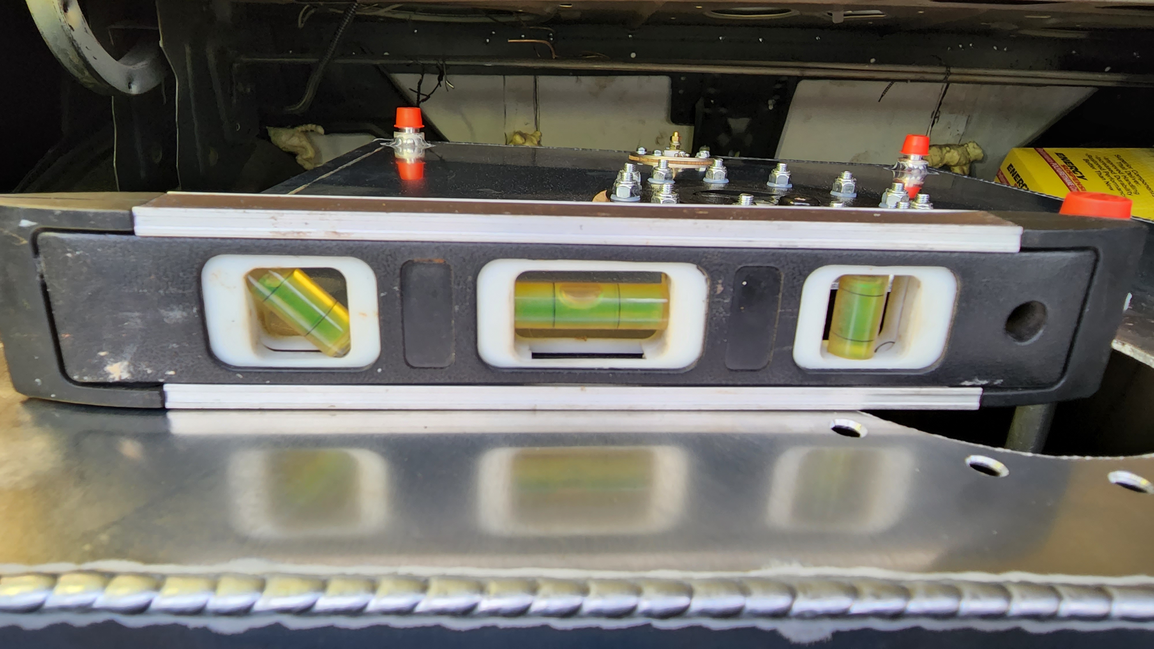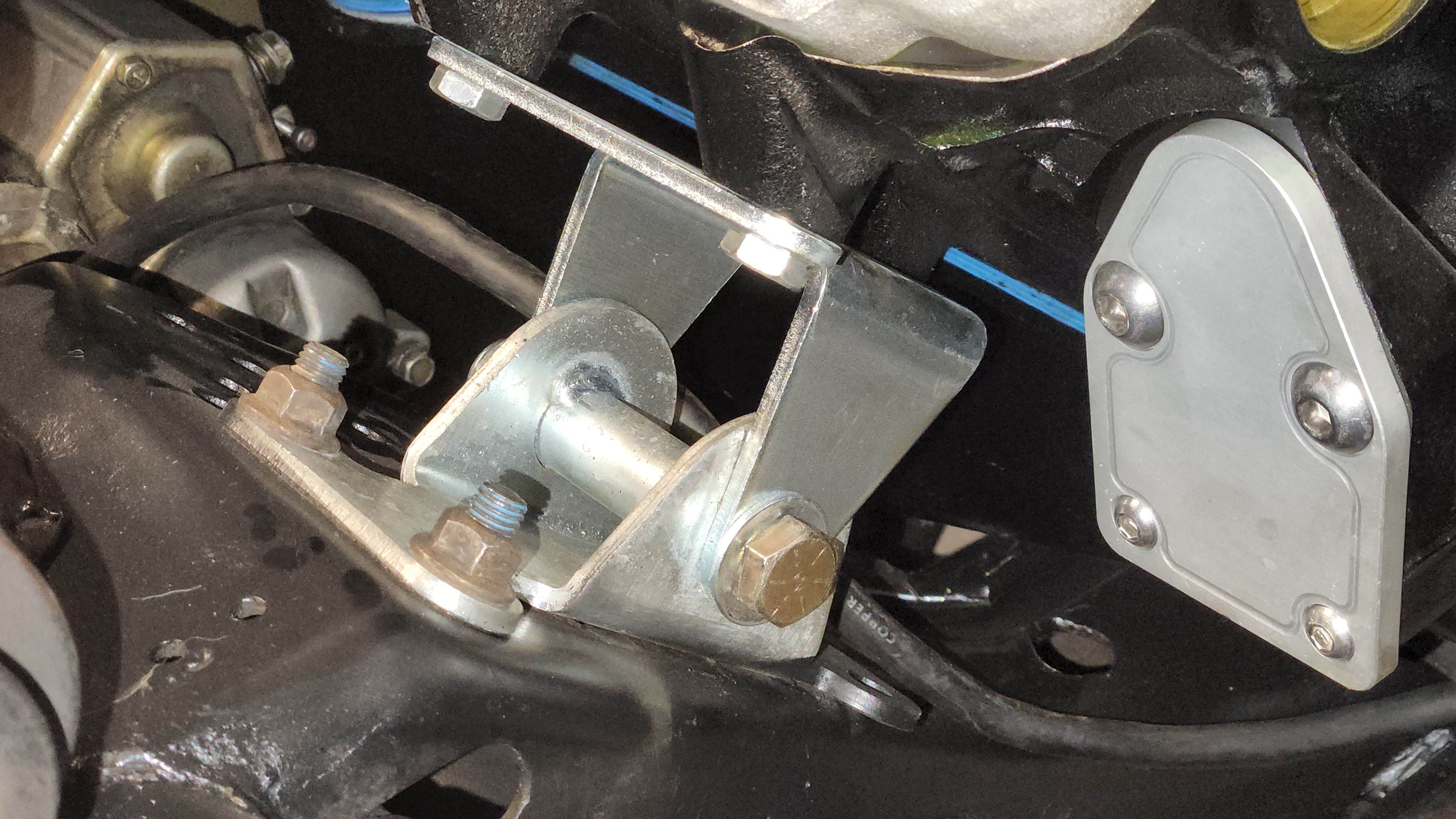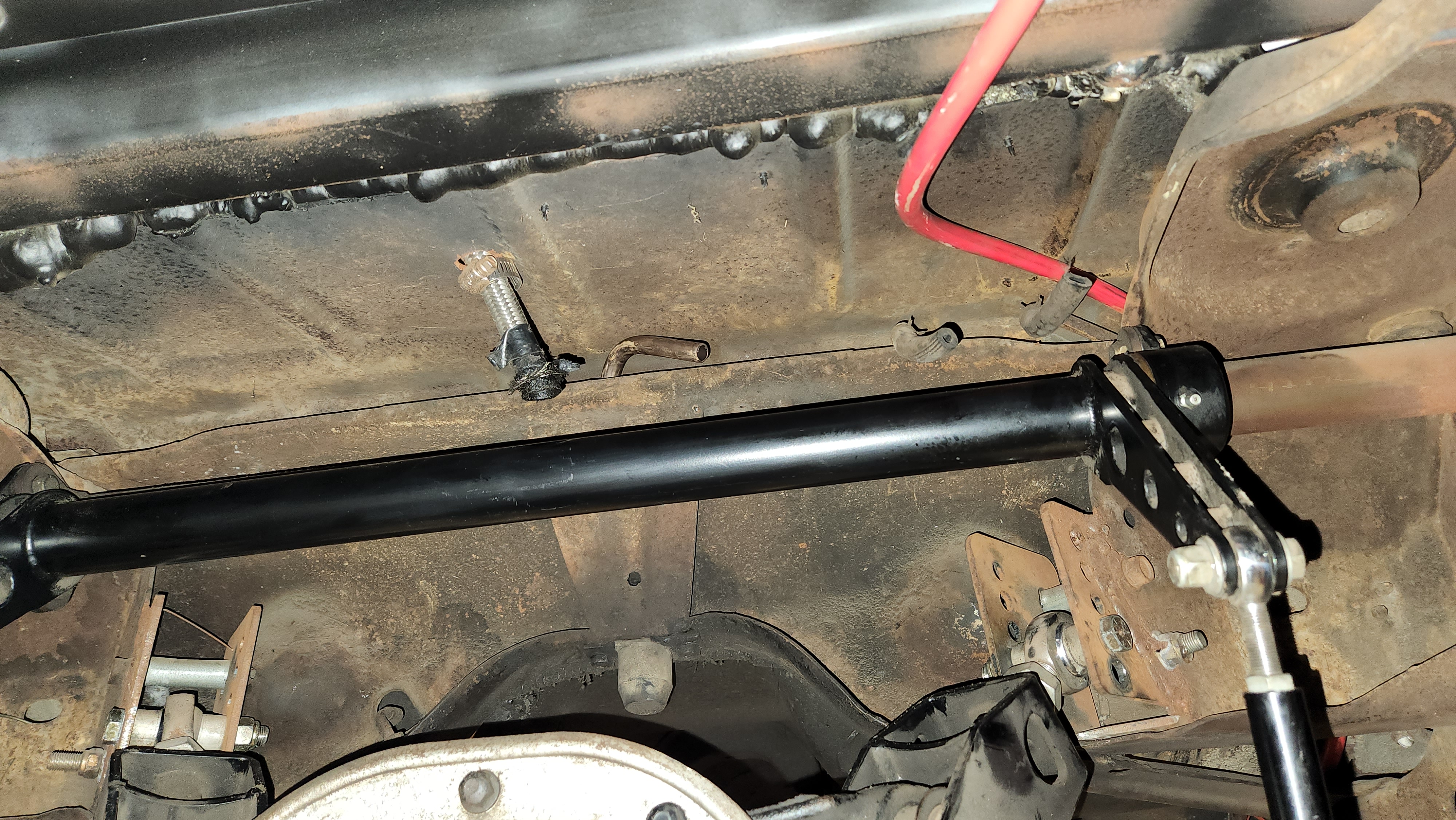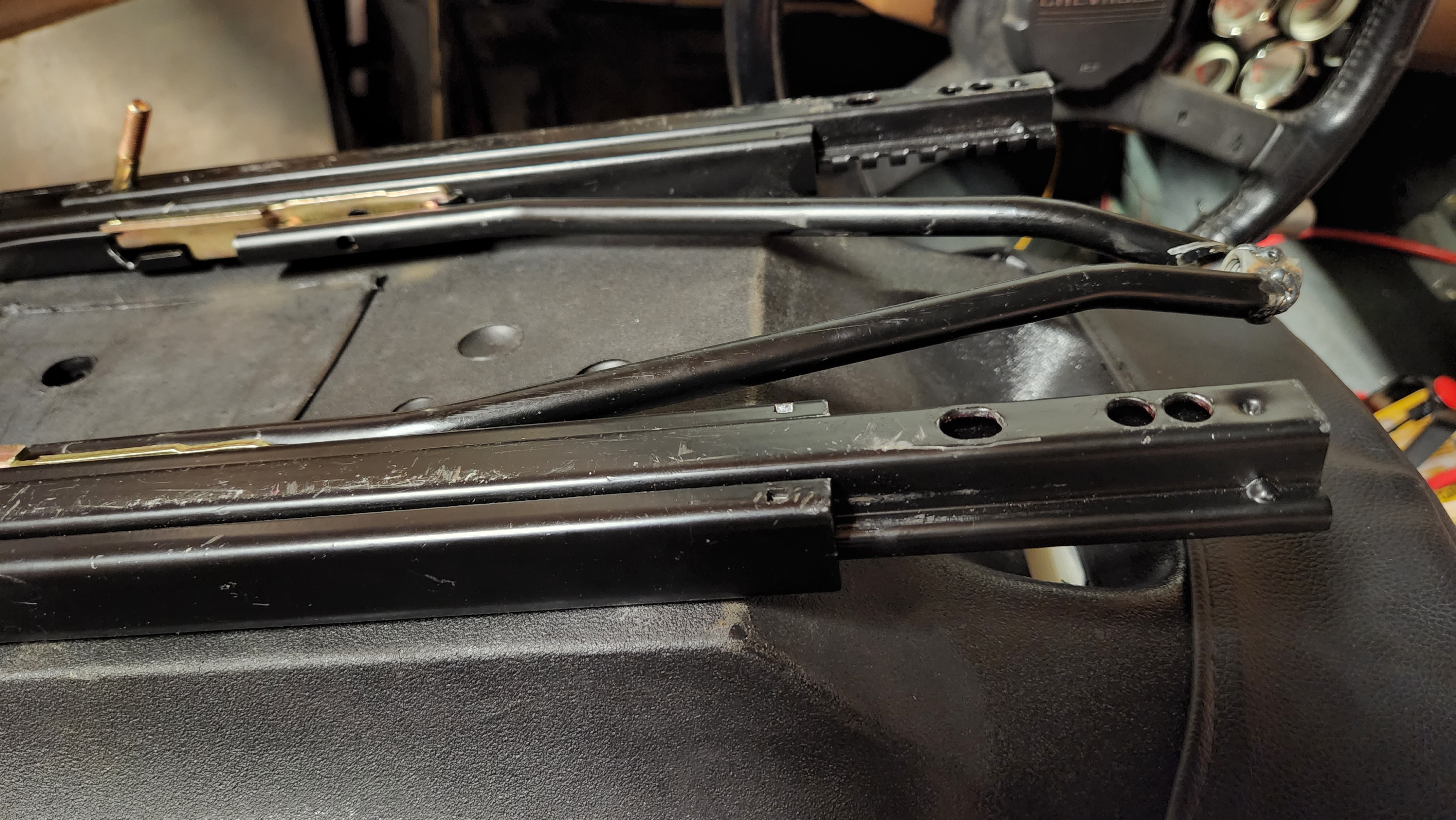 I took a trip up to Paul's on Thursday night and he was able to weld together my seat-adjuster bars, which is a bigger deal than it might sound like. As it comes out of the box, the adjuster bar was for seats with the rails placed much further apart, so I had to narrow it quite a bit by cutting and re-welding. I had Paul weld a nut in there so I could add a knob or something.