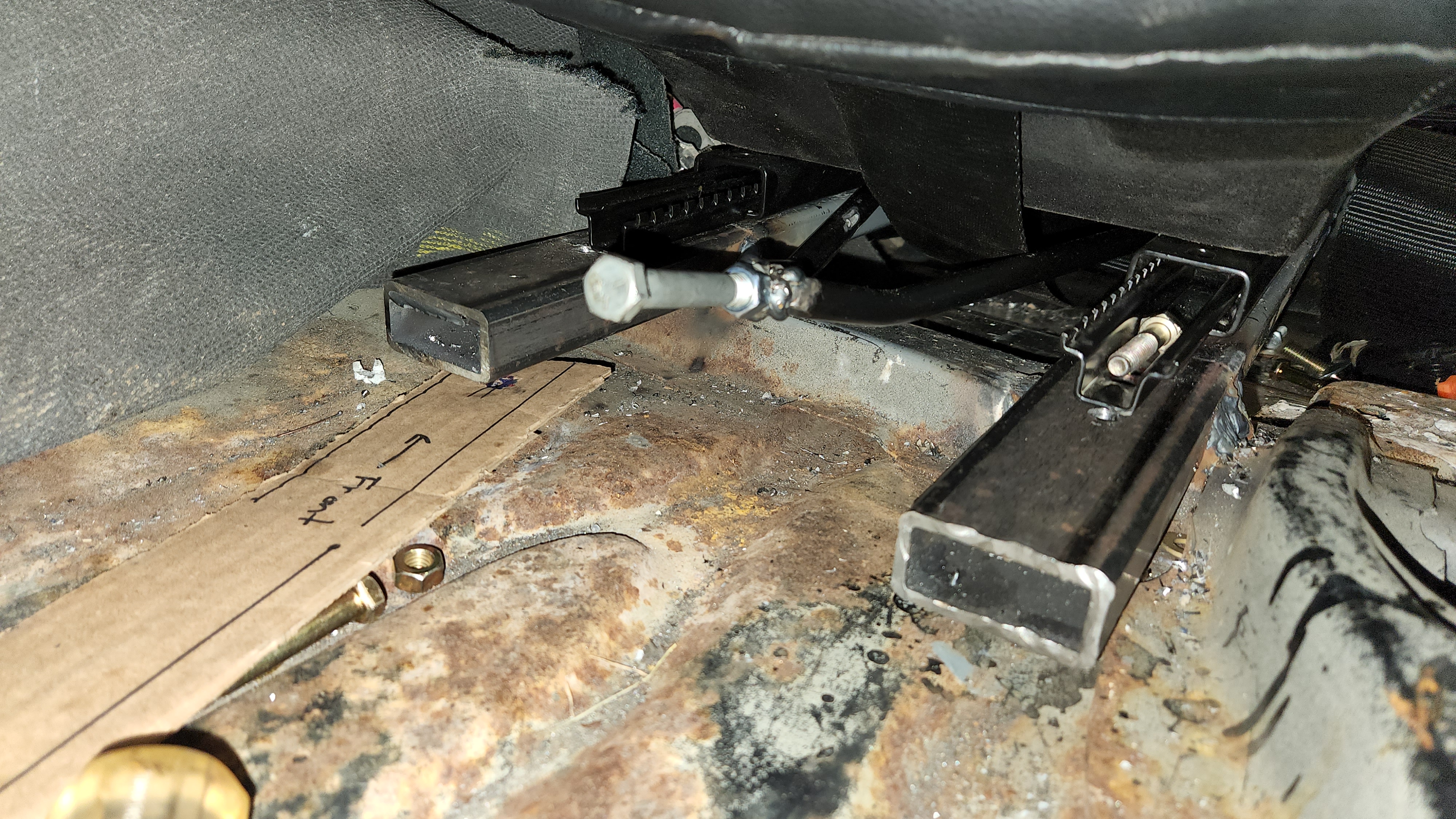 Despite making a cardboard template of the mounting holes, somehow a couple the actual holes ended up in the wrong place. I can only get 3 of the 4 seat mount bolts to line up.. grr.. but progress. The seat goes back and forth.