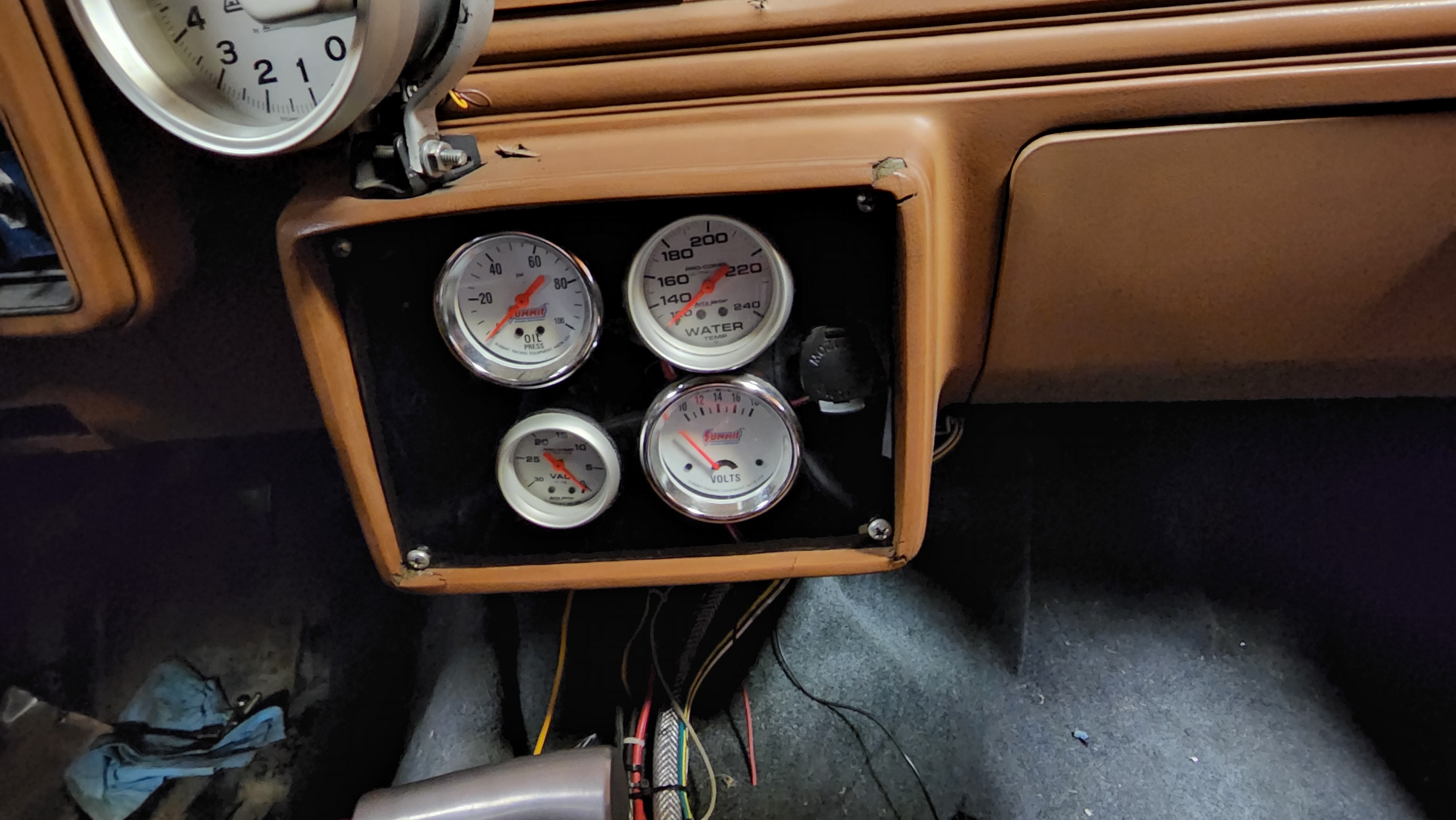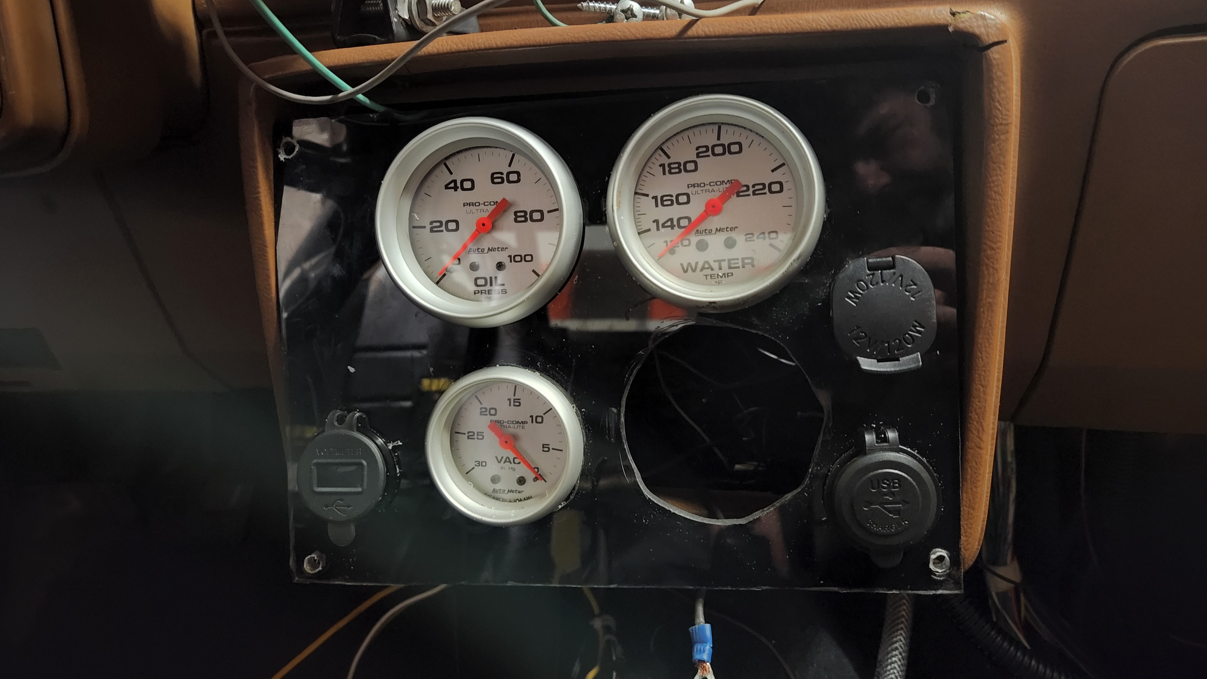 I modified the gauge panel. I removed the Summit oil pressure and volt meter. I replaced the oil pressure with an Autometer Unit that matches the temp and vacuum gauges. It leaves me an open 2 5/8 hole, which I'll prob use for trans temp. I also added a couple USB ports, and the one on the left will display voltage in the middle, so I didnt lose that functionality. Thanks to Paul for all the hole saws!