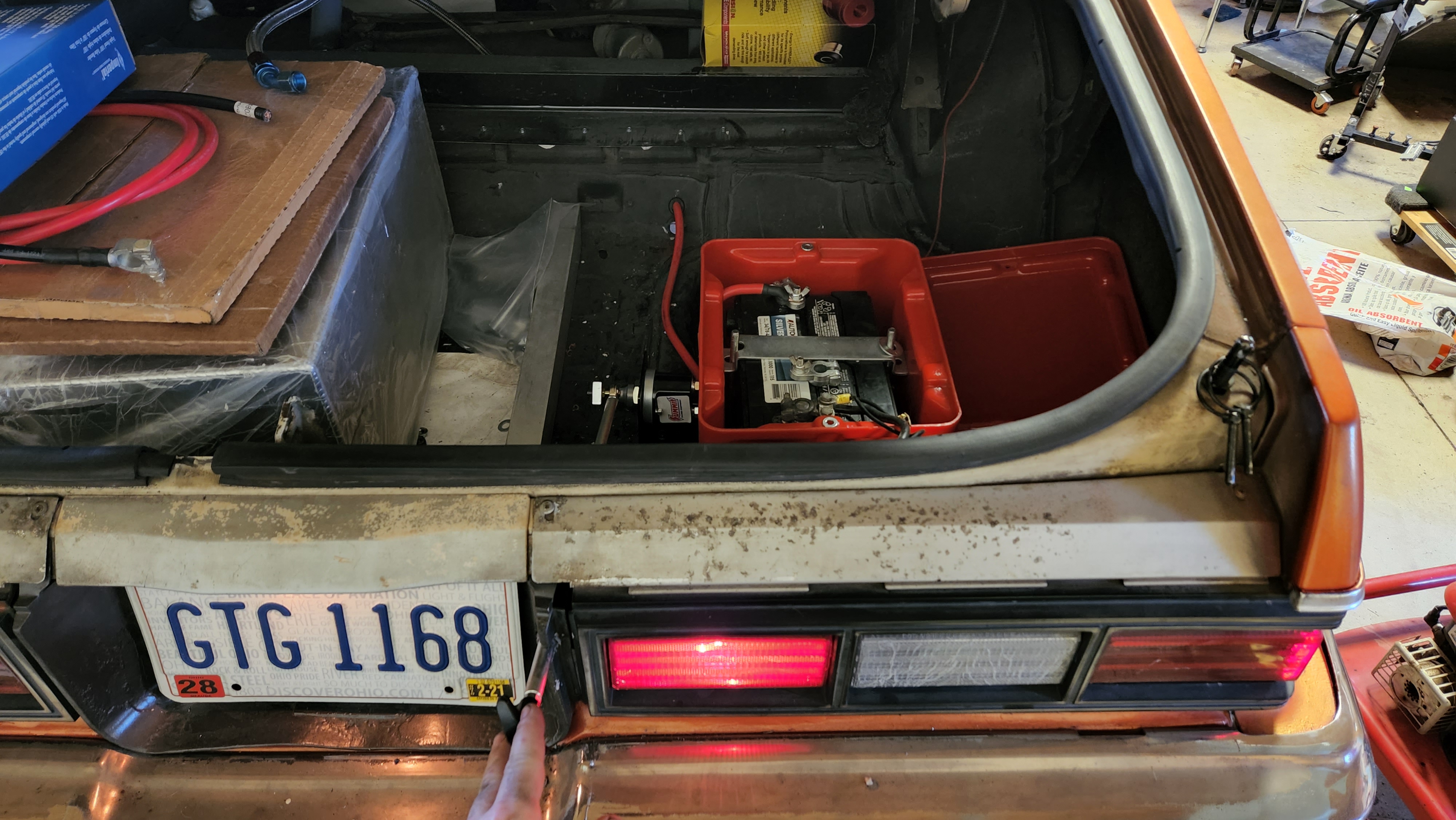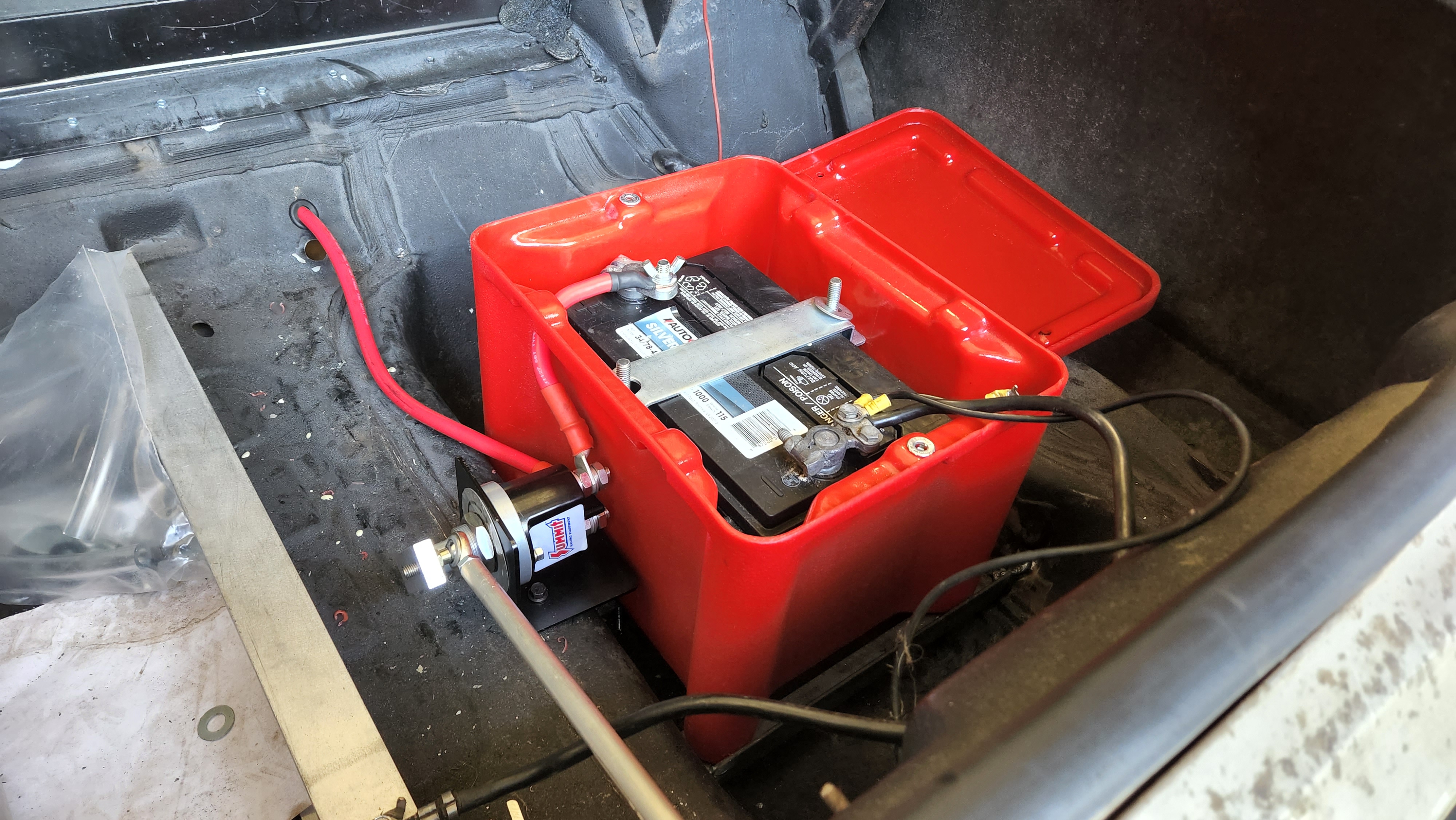 I'm continuing to pick at things. I've got the battery secured in the trunk, I've scoped out where the cutoff switch will go. I'm waiting on a few more tools and parts, but I have just about everything to start doing all the electrical.