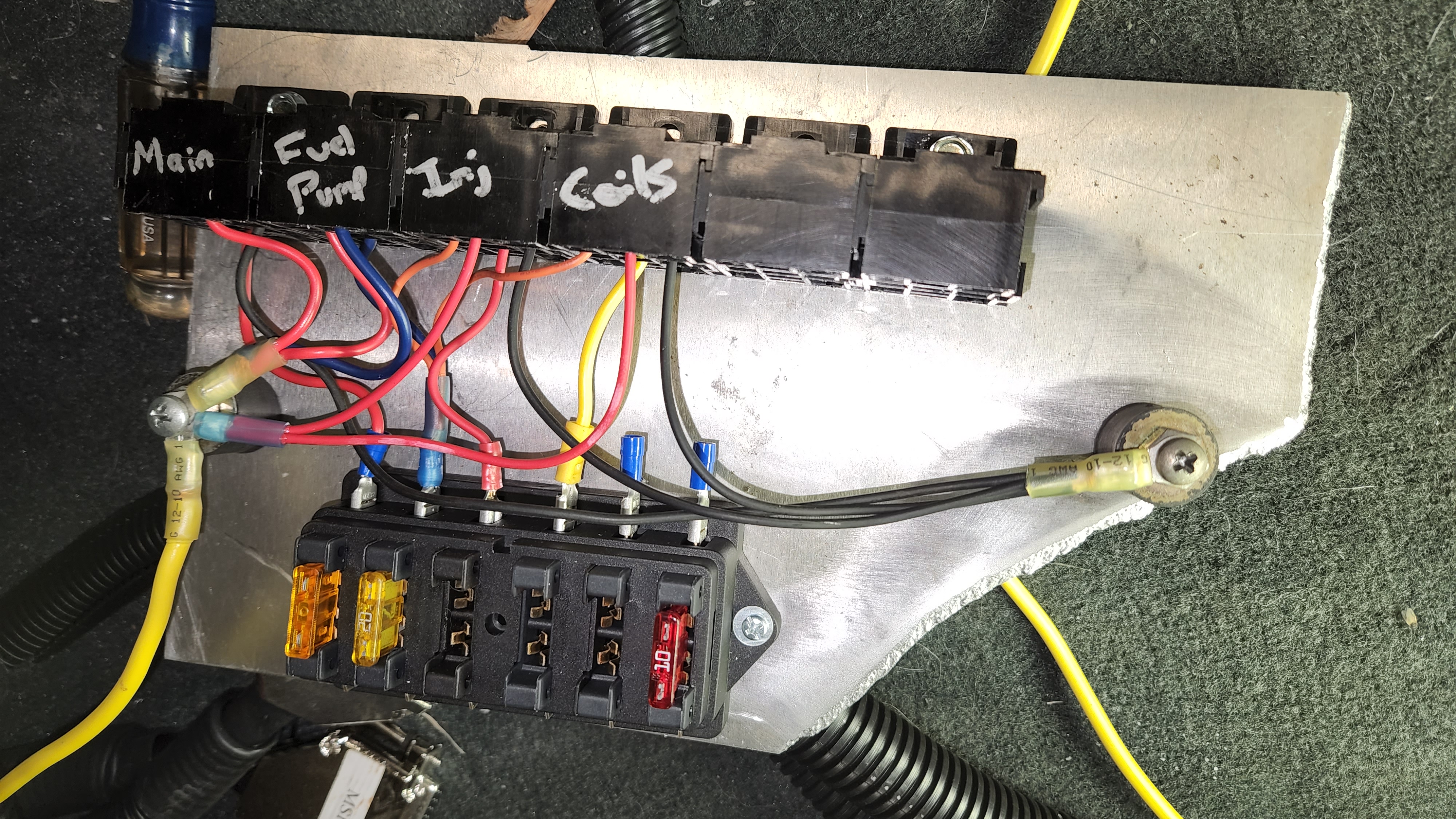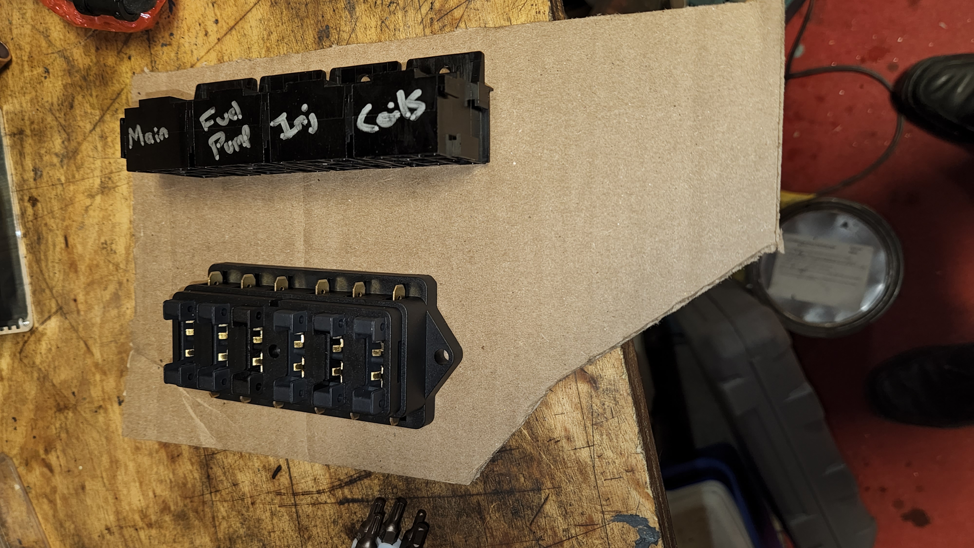 Made up my power distribution/relay panel tonight. It's configured so that the injector + coil relays won't power on until the fuel pump relay turns on. Can't accidentally have injectors or coils powered with the engine off that way. I just need to physically mount it in the passenger footwell now.