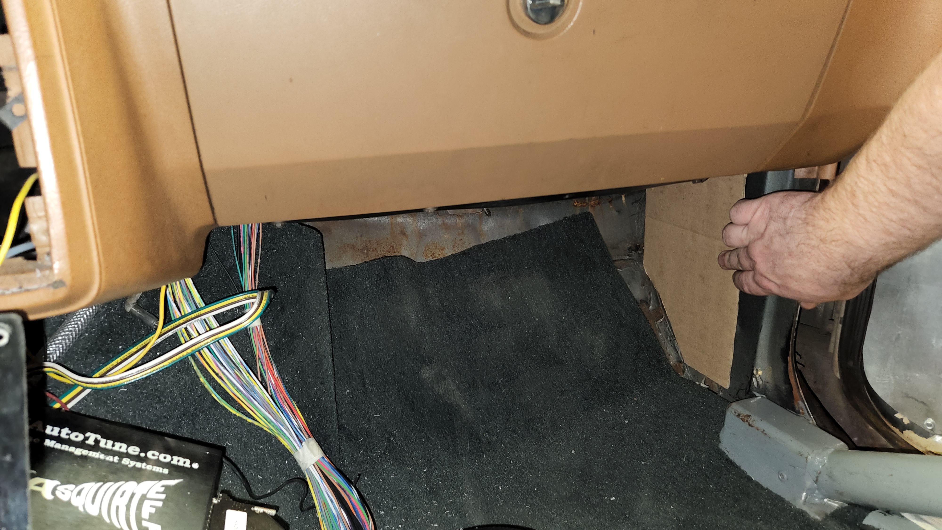 I made a quick cardboard template for the Megasquirt electrical panel in the passenger footwell.