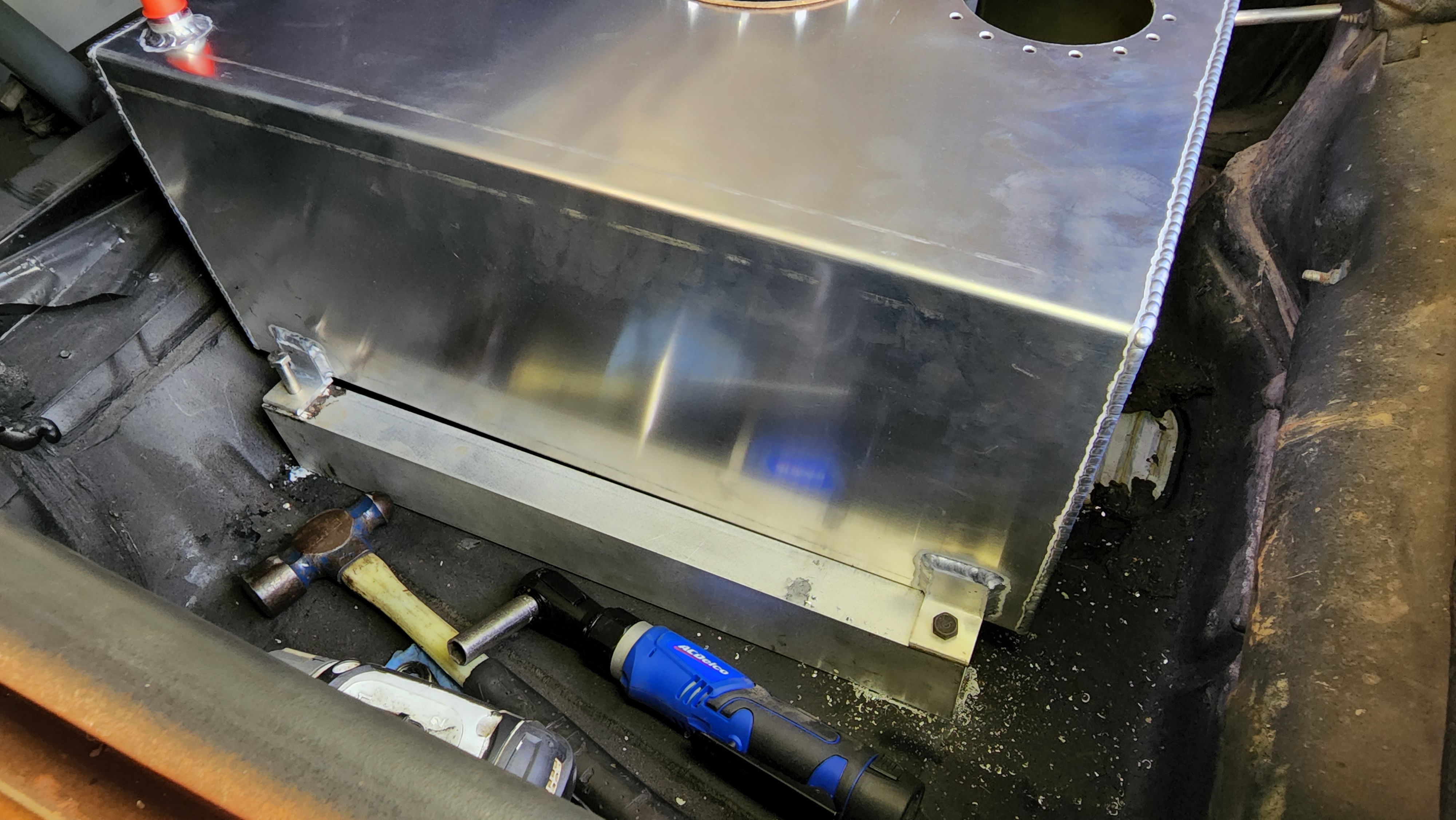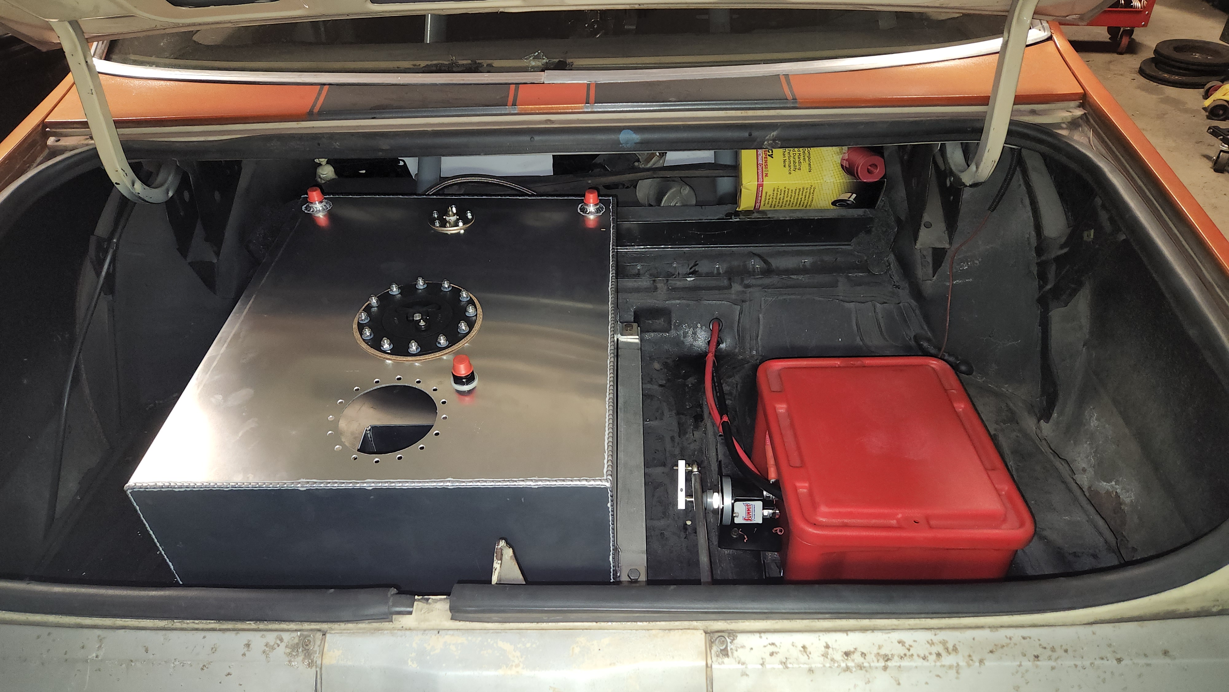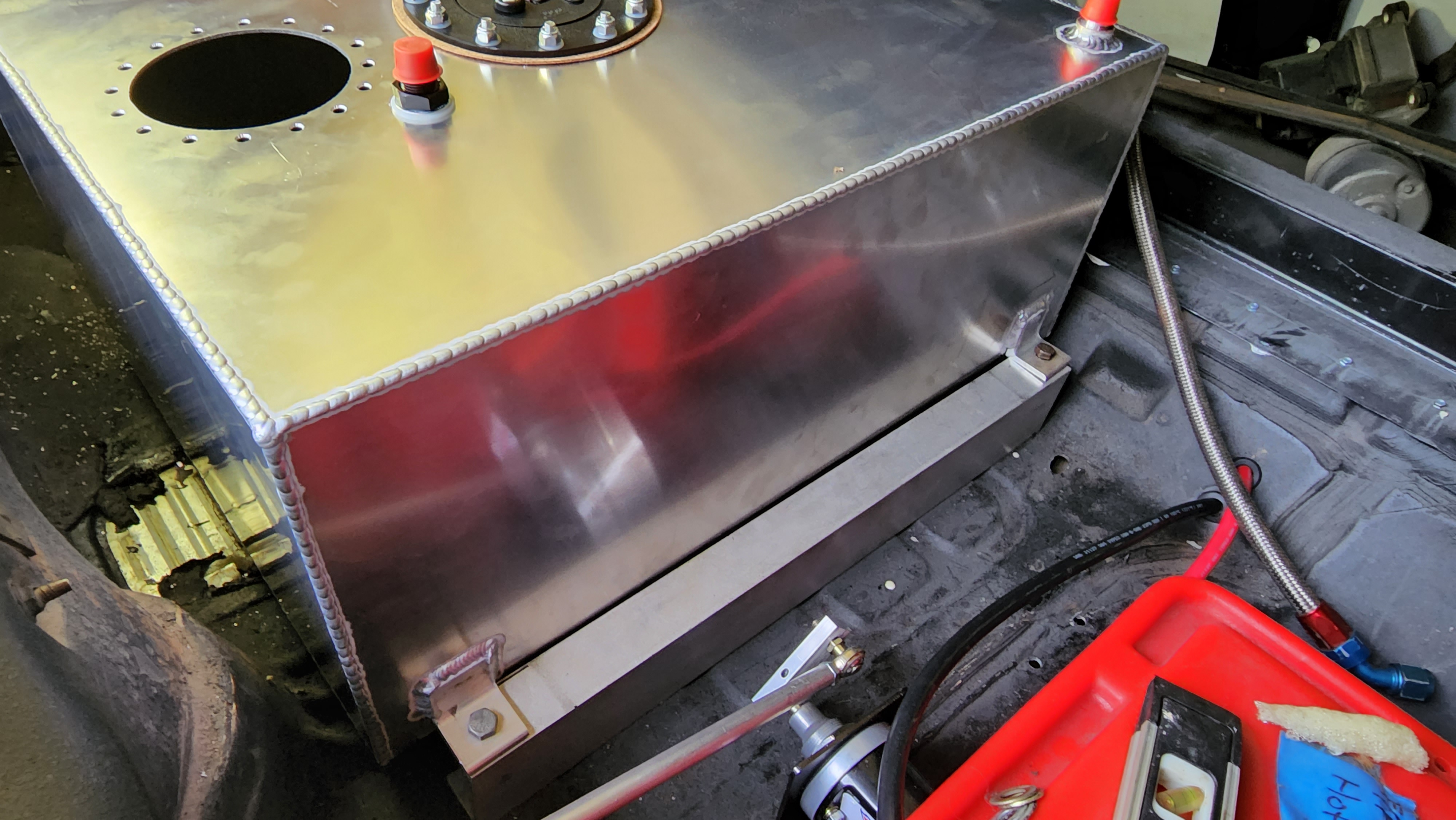 Another major item accomplished today -- Kurt came over and welded some mounts onto my fuel cell. It is now fully mounted in the car! It's level from side to side, and angled back just a little bit to keep fuel at the back, where the pump will be. I'm really happy with how this turned out.