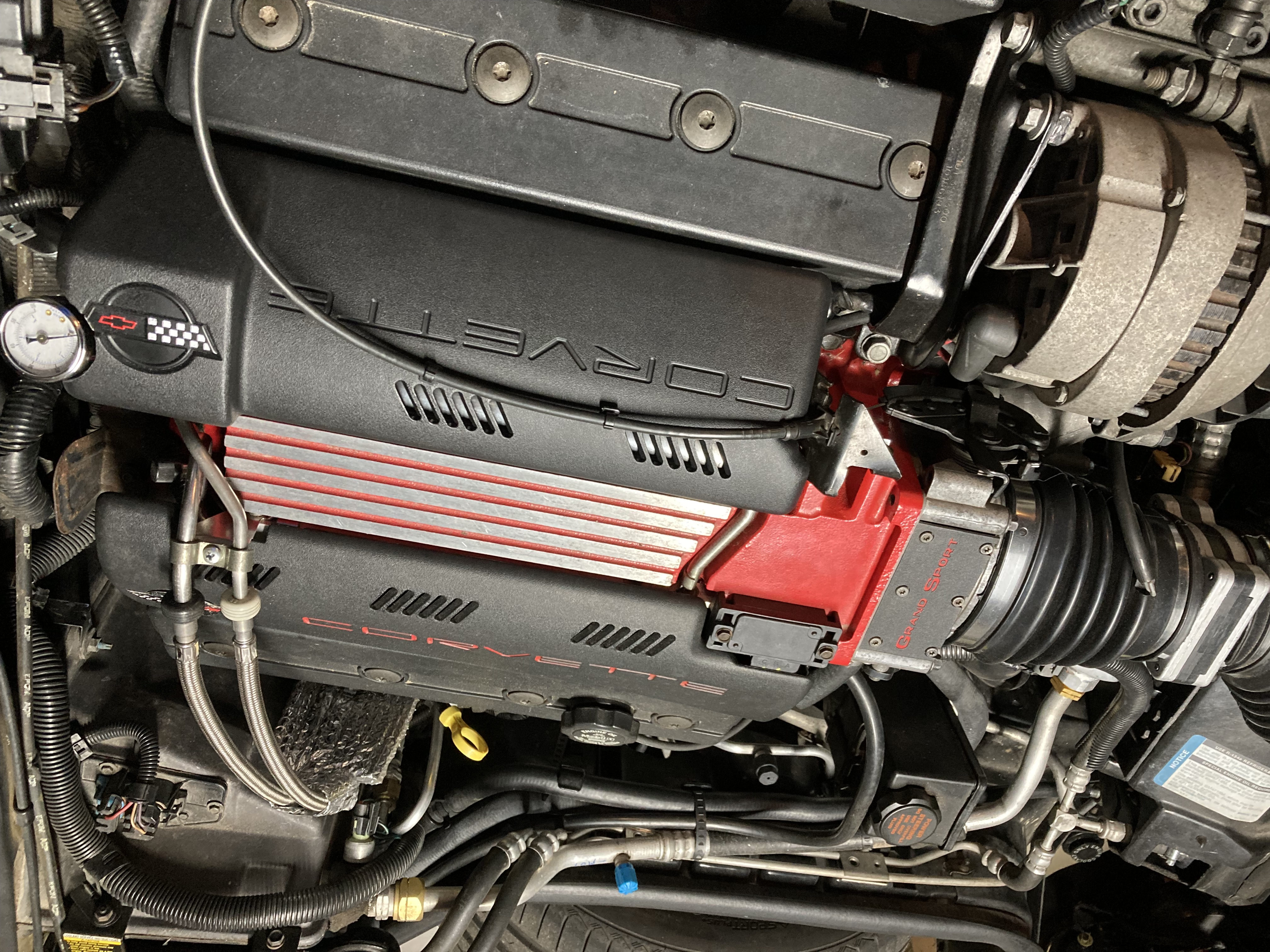 In the photo, notice that the embossed "Corvette" logo is not painted in like the original on the RH side. I would hand paint it if I knew how to match the paint. Also notice my permanently temporary fuel line heat protector on the RH side. I'm not sure how much it helps, but theoretically it should.
